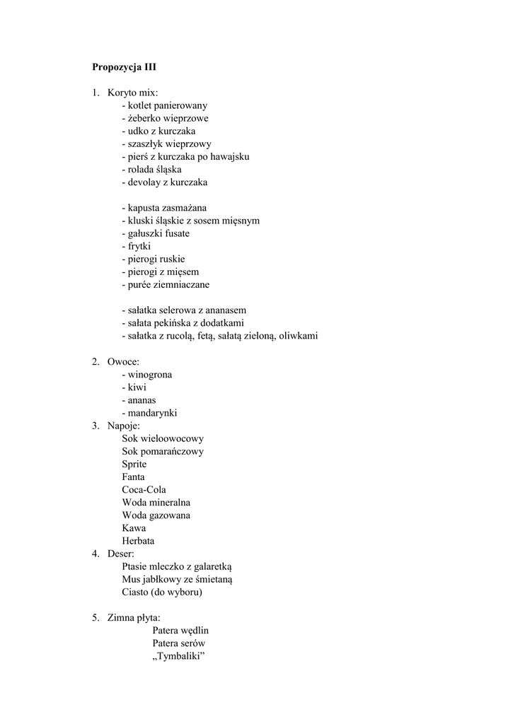 Propozycja III 1. Koryto mix: - kotlet panierowany - żeberko wieprzowe - udko z kurczaka - szaszłyk wieprzowy - pierś z kurczaka po hawajsku - rolada śląska - devolay z kurczaka - kapusta zasmażana - kluski śląskie z sosem mięsnym - gałuszki fusate - frytki - pierogi ruskie - pierogi z mięsem - purée ziemniaczane - sałatka selerowa z ananasem - sałata pekińska z dodatkami - sałatka z rucolą, fetą, sałatą zieloną, oliwkami 2. Owoce: - winogrona - kiwi - ananas - mandarynki 3. Napoje: Sok wieloowocowy Sok pomarańczowy Sprite Fanta Coca-Cola Woda mineralna Woda gazowana Kawa Herbata 4. Deser: Ptasie mleczko z galaretką Mus jabłkowy ze śmietaną Ciasto (do wyboru) 5. Zimna płyta: Patera wędlin Patera serów „Tymbaliki” Rolada łososiowa Mozzarella z pomidorami Tatar z polędwicy wołowej Sałatka gyrosowa Sałatka grecka Śledź w śmietanie z jabłkami 6. Kolacja: Placki ze szpyrkami Placki ze śmietaną Żebroczka Propozycja przystawek 1. 2. 3. 4. Babeczka z farszem na ostro Pieczarka nadziewana Szparag zawijany w szynce Rolada szpinakowa z salami