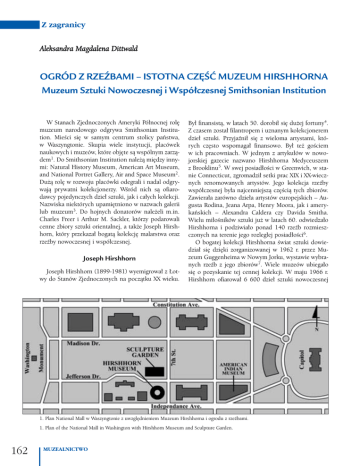 Z zagranicy Aleksandra Magdalena Dittwald OGRÓD Z RZEŹBAMI – ISTOTNA CZĘŚĆ MUZEUM HIRSHHORNA Muzeum Sztuki Nowoczesnej i Współczesnej Smithsonian Institution W Stanach Zjednoczonych Ameryki Północnej rolę muzeum narodowego odgrywa Smithsonian Institution. Mieści się w samym centrum stolicy państwa, w Waszyngtonie. Skupia wiele instytucji, placówek naukowych i muzeów, które objęte są wspólnym zarządem1. Do Smithsonian Institution należą między innymi: Natural History Museum, American Art Museum, and National Portret Gallery, Air and Space Museum2. Dużą rolę w rozwoju placówki odegrali i nadal odgrywają prywatni kolekcjonerzy. Wśród nich są ofiarodawcy pojedynczych dzieł sztuki, jak i całych kolekcji. Nazwiska niektórych upamiętniono w nazwach galerii lub muzeum3. Do hojnych donatorów należeli m.in. Charles Freer i Arthur M. Sackler, którzy podarowali cenne zbiory sztuki orientalnej, a także Joseph Hirshhorn, który przekazał bogatą kolekcję malarstwa oraz rzeźby nowoczesnej i współczesnej. Joseph Hirshhorn Joseph Hirshhorn (1899-1981) wyemigrował z Łotwy do Stanów Zjednoczonych na początku XX wieku. Był finansistą, w latach 50. dorobił się dużej fortuny4. Z czasem został filantropem i uznanym kolekcjonerem dzieł sztuki. Przyjaźnił się z wieloma artystami, których często wspomagał finansowo. Był też gościem w ich pracowniach. W jednym z artykułów w nowojorskiej gazecie nazwano Hirshhorna Medyceuszem z Brooklinu5. W swej posiadłości w Greenwich, w stanie Connecticut, zgromadził setki prac XIX i XX-wiecznych renomowanych artystów. Jego kolekcja rzeźby współczesnej była najcenniejszą częścią tych zbiorów. Zawierała zarówno dzieła artystów europejskich – Augusta Rodina, Jeana Arpa, Henry Moora, jak i amerykańskich – Alexandra Caldera czy Davida Smitha. Wielu miłośników sztuki już w latach 60. odwiedzało Hirshhorna i podziwiało ponad 140 rzeźb rozmieszczonych na terenie jego rozległej posiadłości6. O bogatej kolekcji Hirshhorna świat sztuki dowiedział się dzięki zorganizowanej w 1962 r. przez Muzeum Guggenheima w Nowym Jorku, wystawie wybranych rzeźb z jego zbiorów7. Wiele muzeów ubiegało się o pozyskanie tej cennej kolekcji. W maju 1966 r. Hirshhorn ofiarował 6 600 dzieł sztuki nowoczesnej 1. Plan National Mall w Waszyngtonie z uwzględnieniem Muzeum Hirshhorna i ogrodu z rzeźbami. 1. Plan of the National Mall in Washington with Hirshhorn Museum and Sculpture Garden. 162 MUZEALNICTWO Z zagranicy i współczesnej Smithsonian Institution, z czego ponad 1 600 obiektów stanowiły rzeźby. Wiele lat później, w zapisie, przekazał tej samej instytucji prawie drugie tyle równie cennych obiektów. W celu udostępnienia zbiorów Hirshhorna szerokiej publiczności zarząd Smithsonian Institution podjął decyzję wybudowania nowego muzeum, którego istotną część, zgodnie z życzeniem ofiarodawcy, miał stanowić ogród z rzeźbami. Historia muzeum W listopadzie 1966 r. Kongres Stanów Zjednoczonych wyasygnował 15 milionów dolarów na budowę Muzeum Hirshhorna. Do realizacji tego zamierzenia został wybrany przez Smithsonian Institution Gordon Bunshaft, architekt z firmy 2. Widok Muzeum Hirshhorna od strony Ogrodu z Rzeźbami (2003 r.). Skidmore, Owings & Merrills. Na budowę wyzna- 2. View of Hirshhorn Museum from Sculpture Garden (2003). czono reprezentacyjne miejsce wzdłuż National Mall, dokładnie w połowie drogi między pomnikiem Waszyngtona a Kapitolem. Muzeum miało skła- miały osoby niepełnosprawne, jeżdżące na wózkach dać się z dwóch zasadniczych części: budynku i od- inwalidzkich i osoby z małymi dziećmi. Tak więc w ladzielonego ulicą ogrodu z rzeźbami. Zaprojektowano tach 1978-1981 ponownie zaprojektowano ogród, tym trzypiętrowy gmach w kształcie cylindra, wsparty na razem dodając rampy, ścieżki wyłożone płytami chodczterech masywnych filarach z przeszklonymi wew- nikowymi, zaplanowano także trawniki oraz posadzonętrznymi ścianami8. Miał on pomieścić galerie malar- no wiele drzew i krzewów10. Dodatkowym plusem tej stwa i sztuki nowoczesnej. Na dziedzińcu zaplanowa- renowacji było zwiększenie przestrzeni wystawiennino fontannę. Przestrzeń dookoła budynku, jak i pod- czej, co umożliwiło umieszczenie 25 rzeźb więcej niż cienia, przeznaczono na ekspozycje rzeźby. Pierwotny poprzednio11. Ówczesny dyrektor muzeum zachęcony projekt ogrodu, z dużą prostokątną sadzawką, przewi- sukcesem, jakim zaczął cieszyć się nowy ogród z rzeźdujący zajęcie przestrzeni pomiędzy ulicami Madison bami, postanowił w latach 1991-1993 zamówić nowe i Jefferson, nie został zrealizowany9. Nowe plany projekty placu dookoła budynku muzealnego. Zaplamówiły o znacznie mniejszym ogrodzie, usytuowanym nowano również trawniki z niskimi krzewami i klomrównolegle do ulicy Jefferson. Ogród składał się z kilku bami12. tarasów, położonych na różnych poziomach. Główną część stanowił plac z sadzawką, zagłębiony 4 m poniZbiory żej poziomu ulicy. Do placu rowadziły z dwóch stron Przestrzeń wystawiennicza Muzeum Hirshhorna rozległe schody. Całość utrzymana była w surowym stylu, przypominającym japoński ogród Zen. Powierz- składa się z trzech zasadniczych części: budynku muchnię ogrodu wysypano żwirem, aby lepiej wyekspo- zealnego, placu wokół muzeum z wewnętrznym dziedzińcem i podcieniami oraz oddzielonego ulicą ogrodu nować rzeźby i stworzyć bardziej dramatyczny efekt. Od pierwszego projektu do realizacji całego zamie- z rzeźbami. Umieszczenie eksponatów zależne jest od rzenia upłynęło prawie 8 lat. Uroczyste otwarcie materiału, z jakiego są wykonane, okresu powstania muzeum nastąpiło jesienią 1974 roku. Nowe muzeum i rozmiaru. Tak więc obrazy, rysunki, kolaże, fotografie, spotkało się z gorącym przyjęciem ze strony miłośni- przedmioty sztuki dekoracyjnej, a także małe i średniej 