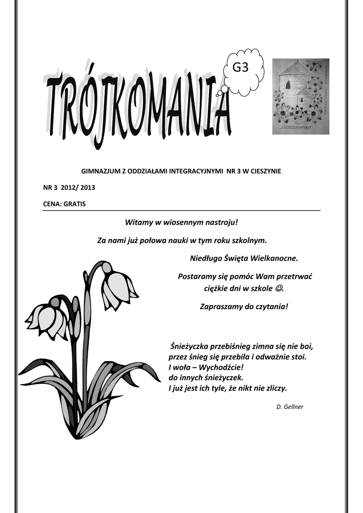 G3 GIMNAZJUM Z ODDZIAŁAMI INTEGRACYJNYMI NR 3 W CIESZYNIE NR 3 2012/ 2013 CENA: GRATIS Witamy w wiosennym nastroju! Za nami już połowa nauki w tym roku szkolnym. Niedługo Święta Wielkanocne. Postaramy się pomóc Wam przetrwać ciężkie dni w szkole . Zapraszamy do czytania! Śnieżyczka przebiśnieg zimna się nie boi, przez śnieg się przebiła i odważnie stoi. I woła – Wychodźcie! do innych śnieżyczek. I już jest ich tyle, że nikt nie zliczy. D. Gellner Dni Otwarte Szkoły 20 i 21 marca do naszej szkoły, jak co roku zawitali szóstoklasiści oraz ich rodzice. Klasa 2a z pomocą grupy literacko – regionalnej ,,Cieszynianka’’ i zespołu muzycznego przygotowała krótkie przedstawienie, które umiliło czas zwiedzającym. Podczas Dni Otwartych klasa 2a zaprezentowała efekty swojej pracy nad projektem edukacyjnym pod tytułem: „O utopcach, skrzatach, strzygach…, czyli o fantastycznych bohaterach legend i podań Śląska Cieszyńskiego”. Skąd taki temat projektu? Świat zachwyca się literaturą fantasy, powieściami J. R. R. Tolkiena czy J. K. Rowling pełnymi fantastycznych postaci (elfów, hobbitów, goblinów, orków…), które mają magiczne zdolności. Często jednak zapominamy, że literatura naszego regionu – Śląska Cieszyńskiego – jest równie bogata w elementy fantastyczne. To właśnie w regionalnych legendach, podaniach i baśniach spotkamy Utopca, Strzygę, Fajermóna, Diabła, Śmierć, Czarownice, Skrzaty, Nocznice… i wiele, wiele innych. Uczniowie z klasy 2a dokonali wyboru i skupili się na przedstawieniu tylko niektórych fantastycznych istot. O innych możecie poczytać w „Słowniku bohaterów legend i podań Śląska Cieszyńskiego” R. Danela (jest w szkolnej bibliotece). Mamy nadzieję, że naszym młodszym kolegom i koleżankom spodobało się Gimnazjum nr 3, że spodobały się im efekty naszej wspólnej pracy i, że spotkamy się znów w nowym roku szkolnym! Ilustracje (Internet): Utopiec, Strzyga, Fajermón WIELKANOC Ludowe zwyczaje wielkanocne Święta Wielkanocne dotykają największych tajemnic ludzkości. Przez dzieje wiele pogańskich symboli została skojarzonych z cudem Zmartwychwstania i wplecionych w zwyczaje, a z czasem w tradycję świąteczną. Palma wielkanocna - Wielki Tydzień zaczyna się Niedzielą Palmową. Palmie wielkanocnej przypisywano od zawsze moc magiczną. Najkorzystniejsze działanie miały palmy wykonane z gałązek młodej wierzby, przystrojone kwiatami, ziołami, kłosami. Wierzbę nazywano rośliną „miłująca życie", starano się jej magiczne działanie wykorzystać wszędzie i przekazać domownikom i zwierzętom. Wierzba bowiem potrafi wyrosnąć w złych warunkach, rośnie szybciej niż inne krzewy, jako pierwsza wypuszcza pąki na wiosnę. Po powrocie z kościoła poświęconą palmą domownicy lekko się uderzali, wypowiadając przy tym słowa: „Nie ja biję, wierzba bije". Wierzono, że w ten sposób domownicy przekazują sobie jej mocy. Dzięki takiemu rytuałowi, panny miały zyskać na urodzie, natomiast chłopcom dodać dzielności i siły. Połykano także kotki bazi, które chronić miały od złych uroków i wzmacniać ciało, uchronić przed bólem gardła. Nowo poświęcone palmy wtykano za święty obraz. Chronić miały gospodarstwo od piorunów i pożaru, osłaniać zasiewy przed złą pogodą, a ludzi i zwierzęta przed chorobami. Wierzono, że ustawiona w czasie burzy przy kominie zagradzać będzie błyskawicom drogę do domu. Pierwszemu po zimie wypędzeniu krów na pastwisko towarzyszyło gładzenie ich palmami po karkach by się dobrze chowały. Z gałązek wyciągniętych z palm robiono małe krzyżyki i wtykano w pierwszą bruzdę podczas orki. Gałązka z palmy włożona do ula chronić miała pszczoły i pomagała im zebrać dużo miodu oraz zdrowo się rozmnażać. Również rybacy wierzyli w magiczną moc święconej palmy. Wplatali wierzbową gałązkę z palmy w swoje sieci, aby czarownice nie zabierały im połowów. Temu, kto wykonał największą palmę wróżono długie i szczęśliwe życie, a jego dzieciom wysoki wzrost i dobre zdrowie. A im piękniej przystrojona była palma, tym dzieci miały być ładniejsze. Wierzono również, że w Niedzielę Palmową ziemia otwiera się i ukazuje zakopane w niej skarby. Świąteczne porządki - Wielkanocne porządki są nieodłączną częścią przygotowań przedświątecznych. Ich znaczenie jest również symboliczne - wymiatamy z mieszkania zimę, a wraz z nią wszelkie zło i choroby. Pisanki - zdobienie jajek to ulubione zajęcie dzieci przed Świętami Wielkiejnocy. Wielkanocne pisanki zdobią koszyk ze święconką, stół wielkanocny, obdarowywano się nimi podczas świąt. Sposoby i pomysły dekorowania jajek często zależą od inwencji twórczej. Podsyłamy kilka sposobów na Wielkanocną pisankę. Rodzaje malowanych jajek: Pisanki - barwienie i wosk Oklejanki - naklejanie trzciny lub/i kolorowej włóczki Naklejanki - naklejanie wycinanki z papieru Kraszanki - barwione na jednolity kolor Drapanki - wydrapywanie wzorów na zabarwionych kraszankach Naturalne barwniki robimy z wywarów różnych roślin i ziół. Oto, sposoby na uzyskanie poszczególnych kolorów: - brązowy (rudy): łupiny cebuli - pomarańczowy - marchwi i dyni oraz z połączenia czerwonego i żółtego - czarny: kora dębu, olchy lub łupiny orzecha włoskiego - żółtozłocisty: kora młodej jabłoni lub kwiat nagietka - fioletowy: płatki kwiatu ciemnej malwy - zielony: pędy młodego żyta lub listki barwinka - różowy: sok z buraka Do wszystkich naturalnych wywarów należy dodać nieco octu, co sprawi, że kolory będą trwalsze. Aby pisanki ładnie wyglądały można je dodatkowo przetrzeć szmatką umoczoną w oleju. Topienie Judasza - w Wielką Środę chłopcy, topili Judasza. Ze słomy i zniszczonych ubrań robiono wielka kukłę. Wleczono ja na łańcuchach po okolicy. Gapie, zebrani przy drodze okładali kukłę 