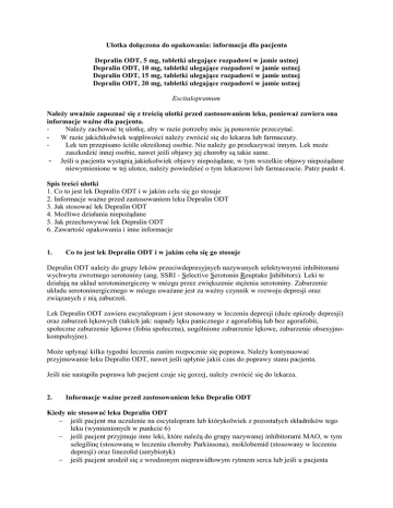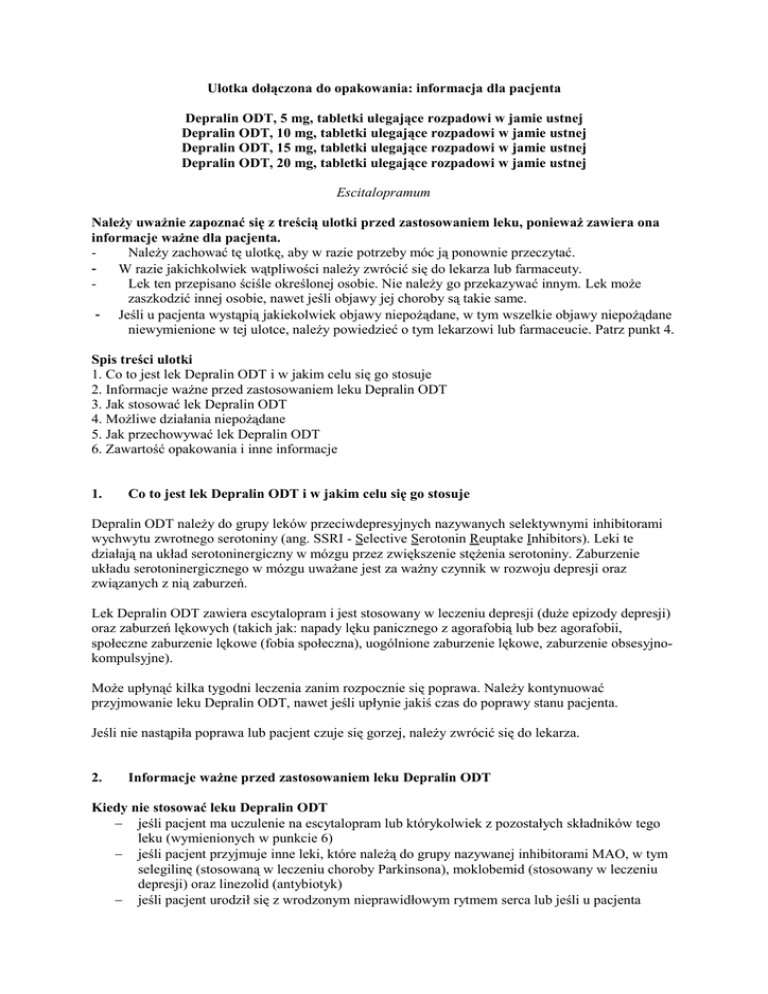 Ulotka dołączona do opakowania: informacja dla pacjenta Depralin ODT, 5 mg, tabletki ulegające rozpadowi w jamie ustnej Depralin ODT, 10 mg, tabletki ulegające rozpadowi w jamie ustnej Depralin ODT, 15 mg, tabletki ulegające rozpadowi w jamie ustnej Depralin ODT, 20 mg, tabletki ulegające rozpadowi w jamie ustnej Escitalopramum Należy uważnie zapoznać się z treścią ulotki przed zastosowaniem leku, ponieważ zawiera ona informacje ważne dla pacjenta. Należy zachować tę ulotkę, aby w razie potrzeby móc ją ponownie przeczytać. W razie jakichkolwiek wątpliwości należy zwrócić się do lekarza lub farmaceuty. Lek ten przepisano ściśle określonej osobie. Nie należy go przekazywać innym. Lek może zaszkodzić innej osobie, nawet jeśli objawy jej choroby są takie same. - Jeśli u pacjenta wystąpią jakiekolwiek objawy niepożądane, w tym wszelkie objawy niepożądane niewymienione w tej ulotce, należy powiedzieć o tym lekarzowi lub farmaceucie. Patrz punkt 4. Spis treści ulotki 1. Co to jest lek Depralin ODT i w jakim celu się go stosuje 2. Informacje ważne przed zastosowaniem leku Depralin ODT 3. Jak stosować lek Depralin ODT 4. Możliwe działania niepożądane 5. Jak przechowywać lek Depralin ODT 6. Zawartość opakowania i inne informacje 1. Co to jest lek Depralin ODT i w jakim celu się go stosuje Depralin ODT należy do grupy leków przeciwdepresyjnych nazywanych selektywnymi inhibitorami wychwytu zwrotnego serotoniny (ang. SSRI - Selective Serotonin Reuptake Inhibitors). Leki te działają na układ serotoninergiczny w mózgu przez zwiększenie stężenia serotoniny. Zaburzenie układu serotoninergicznego w mózgu uważane jest za ważny czynnik w rozwoju depresji oraz związanych z nią zaburzeń. Lek Depralin ODT zawiera escytalopram i jest stosowany w leczeniu depresji (duże epizody depresji) oraz zaburzeń lękowych (takich jak: napady lęku panicznego z agorafobią lub bez agorafobii, społeczne zaburzenie lękowe (fobia społeczna), uogólnione zaburzenie lękowe, zaburzenie obsesyjnokompulsyjne). Może upłynąć kilka tygodni leczenia zanim rozpocznie się poprawa. Należy kontynuować przyjmowanie leku Depralin ODT, nawet jeśli upłynie jakiś czas do poprawy stanu pacjenta. Jeśli nie nastąpiła poprawa lub pacjent czuje się gorzej, należy zwrócić się do lekarza. 2. Informacje ważne przed zastosowaniem leku Depralin ODT Kiedy nie stosować leku Depralin ODT − jeśli pacjent ma uczulenie na escytalopram lub którykolwiek z pozostałych składników tego leku (wymienionych w punkcie 6) − jeśli pacjent przyjmuje inne leki, które należą do grupy nazywanej inhibitorami MAO, w tym selegilinę (stosowaną w leczeniu choroby Parkinsona), moklobemid (stosowany w leczeniu depresji) oraz linezolid (antybiotyk) − jeśli pacjent urodził się z wrodzonym nieprawidłowym rytmem serca lub jeśli u pacjenta − wystąpił epizod nieprawidłowego rytmu serca (widoczny w EKG; badaniu oceniającym pracę serca) jeśli pacjent przyjmuje leki stosowane w leczeniu zaburzeń rytmu serca lub leki, które mogą wpływać na rytm serca (patrz punkt 2 „Lek Depralin ODT a inne leki”). Ostrzeżenia i środki ostrożności Przed rozpoczęciem stosowania leku Depralin ODT należy omówić to z lekarzem lub farmaceutą. Należy powiedzieć lekarzowi, jeśli u pacjenta występują jakiekolwiek inne zaburzenia lub choroby, ponieważ może być konieczne ich uwzględnienie. W szczególności należy poinformować lekarza, jeśli: − pacjent ma padaczkę. Należy przerwać leczenie lekiem Depralin ODT, jeśli wystąpią drgawki lub, jeśli zwiększy się częstość występowania napadów drgawkowych (patrz także punkt 4 „Możliwe działania niepożądane”). − pacjent ma zaburzenia czynności wątroby lub nerek. Może być konieczne dostosowanie dawkowania przez lekarza. − pacjent ma cukrzycę. Leczenie lekiem Depralin ODT może zaburzać kontrolę stężenia glukozy we krwi. Konieczna może okazać się zmiana dawkowania insuliny i (lub) doustnych leków przeciwcukrzycowych. − u pacjenta występuje zmniejszone stężenie sodu we krwi. − pacjent ma zwiększoną skłonność do krwawień lub powstawania siniaków. − pacjent leczony jest elektrowstrząsami. − pacjent ma chorobę niedokrwienną serca. − u pacjenta występują lub występowały choroby serca, lub jeśli pacjent miał niedawno zawał mięśnia sercowego. − pacjent ma niskie tętno spoczynkowe i (lub) jeśli mogą wystąpić niedobory soli w wyniku długotrwałej uporczywej biegunki i wymiotów lub stosowania leków moczopędnych. − u pacjenta wystąpi szybkie lub nieregularne bicie serca, omdlenia, zapaść lub zawroty głowy w pozycji stojącej, co może wskazywać na nieprawidłową pracę serca. − u pacjenta występują lub występowały w przeszłości problemy z oczami, takie jak niektóre rodzaje jaskry (wzrost ciśnienia wewnątrz gałki ocznej). Uwaga U niektórych pacjentów z zaburzeniem dwubiegunowym (maniakalno-depresyjnym) może wystąpić faza maniakalna. Charakteryzuje się ona niezwykłymi, szybko zmieniającymi się pomysłami, nieuzasadnionym uczuciem szczęścia oraz nadmierną aktywnością fizyczną. W razie wystąpienia wyżej wymienionych objawów, należy skontaktować się z lekarzem. W ciągu pierwszych tygodni leczenia mogą wystąpić u pacjenta objawy takie, jak niepokój ruchowy czy niemożność siedzenia lub stania w bezruchu. Jeśli takie objawy wystąpią należy natychmiast zawiadomić lekarza. Myśli samobójcze oraz nasilenie objawów depresji lub zaburzeń lękowych Jeśli pacjent ma depresję i (lub) zaburzenia lękowe, może czasami mieć myśli o samookaleczeniu lub o samobójstwie. Mogą one nasilać się na początku stosowania leków przeciwdepresyjnych, ponieważ leki te zwykle zaczynają działać po około 2 tygodniach, a czasami trwa to nawet dłużej. Prawdopodobieństwo wystąpienia takich myśli jest większe, je