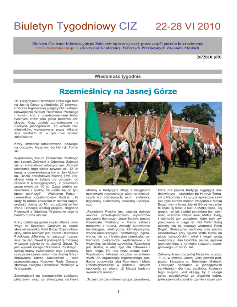 Biuletyn Tygodniowy CIZ 22-28 VI 2010 Biuletyn Centrum Informacyjnego Zakonów opracowywany przez zespół portalu internetowego www.zyciezakonne.pl i sekretariat Konferencji Wyższych Przełożonych Zakonów Męskich 26/2010 (69) Wiadomość tygodnia Rzemieślnicy na Jasnej Górze 29. Pielgrzymka Rzemiosła Polskiego trwa na Jasnej Górze w niedzielę, 27 czerwca. Podczas tegorocznej pielgrzymki nastapiło poświęcenie Wotum Rzemiosła Polskiego - kutych krat z przedstawieniami historycznych orłów jako godła państwa polskiego. Kraty zostały zamontowane na Szczycie jasnogórskim. To wotum rzemieślników, wykonywane przez kilkanaście ostatnich lat, w tym roku zostało zakończone. Kraty, ozdobnie udekorowane, poświęcił na początku Mszy św. bp Henryk Tomasik. Wykonawcą wotum Przeniosła Polskiego jest Leszek Zulewski z Gdańska. Zajmuje się on kowalstwem artystycznym. „Pomysł powstania tego dzieła powstał ok. 12 lat temu, a pomysłodawcą był o. Jan Golonka. Dzieło przedstawia historię Orła Polskiego kutą w żelazie od początku do czasów II Rzeczypospolitej. Z przerwami prace trwały ok. 10 lat. Czuję wielkie zadowolenie i spokój, że udało się po tylu latach ukończyć”. Waldemar Pacut , rzemieślnik częstochowski dodaje: „Te kraty to robota kowalska w metalu kutym, grubość blachy do 10 mm, później cynkowane i złocone według projektu Bogdana Pietruszki z Gdańska. Wykonanie tego to bardzo trudna sztuka”. Kraty ozdabiają górna część ołtarza polowego na Szczycie. Centrum tej części stanowi mozaika Maki Bożej Częstochowskiej, która również jest darem Rzemiosła Polskiego. „Mieliśmy ten zaszczyt i szczęście, że Jan Paweł II poświęcił tę mozaikę w czasie pobytu tu na Jasnej Górze. To jest wysiłek całego Rzemiosła Polskiego i dzisiaj mamy zwieńczenie tego i radosny czas przekazania wotum dla Jasnej Góry dopowiada Marek Sokołowski , wice przewodniczący Krajowej Rady Duszpasterstwa Związku Rzemiosła Polskiego w Warszawie. Zgromadzeni na jasnogórskim spotkaniu pielgrzymi wraz ze starszyzną cechową ubraną w tradycyjne stroje z insygniami cechowymi reprezentują wiele rzemieślniczych izb branżowych, m.in.: stolarską, fryzjerską, cukierniczą, szewską i spożywczą. „Rzemiosło Polskie jest częścią dużego sektora przedsiębiorczości wytwórczousługowej tłumaczy - Jerzy Bartnik, prezes Rzemiosła Polskiego – Mamy zakłady metalowe z trudną, zakłady budowlane: instalacyjne, elektryczne klimatyzacyjne, wodno-kanalizacyjne, centralnego ogrzewania, ale są i tradycyjne rzemiosła: cukiernicze, piekarnicze, wędliniarskie - to wszystko, co blisko człowieka. Rzemiosło jest służbą, a więc żyje dla człowieka i koło niego. Po nas musi zostać ślad”. Wystawiono kilkaset pocztów sztandarowych. Za organizację tegorocznego spotkania odpowiada Izba Rzemiosła i Małej Przedsiębiorczości w Radomiu. Hasłem spotkania sa słowa: „Z Maryją bądźmy świadkami miłości”. „To jest bardzo ciekawa grupa zawodowa, 1 która ma piękną tradycję sięgającą średniowiecza – stwierdza bp Henryk Tomasik z Radomia - Ta grupa społeczna zawsze była bardzo mocno związana z Matką Bożą, mamy tu na Jasnej Górze wspaniałe znaki tej troski o kult, o Matkę Bożą. Tej grupie, tak jak każdej potrzebna jest wierność, wierność Chrystusowi, Matce Bożej, i wierność tym zasadom, które były wypracowane w ciągu lat. Od Matki Bożej uczymy się tej postawy wierności Panu Bogu”. Starszyznę cechową oraz poczty sztandarowe przy figurze Matki Bożej na placu jasnogórskim witał i kropił wodą święconą o. Jan Golonka, paulin, opiekun rzemieślników z ramienia klasztoru jasnogórskiego już od 29. lat. Zebranych na uroczystej Mszy św. o godz. 11.30 w imieniu Jasnej Góry powitał podprzeor klasztoru o. Sebastian Matecki. „Dzisiejsze spotkanie w jasnogórskim sanktuarium dla nas, paulinów, kustoszy tego miejsca, jest okazją, by z całego serca podziękować za wszelkie dobro, jakie rzemiosło polskie czyniło i czyni cały czas dla Jasnej Góry – za wasz stały wkład i wielką ofiarność, aby Jasna Góra mogła być jak najgodniejszym tronem Królowej Polski – mówił o. Matecki - Bóg zapłać za tyle dowodów waszej troski i ofiarność. W szczególny sposób dziękujemy za wspaniałe kraty z polskimi orłami! Dzisiaj kraty w całości zamknięte, wyzłocone, zostaną poświęcone. Wiemy, że był to etap kilku lat, sukcesywnie ustawiane na jasnogórskim Szczycie, a dziś chcemy dziękować za cały dar, poświęcić go na chwałę Boga i Jasnogórskiej Bogarodzicy”. Uroczystej Mszy św. przewodniczył biskup radomski Henryk Tomasik, a koncelebrowali: krajowy duszpasterz Rzemiosła ks. Krzysztof Rusiecki, duszpasterz z Radomia ks. Andrzej Zarzycki i duszpasterze .Zarzemieślników z całej Polski. Na pielgrzymce obecni byli: prezes Związku Rzemiosła Polskiego Jerzy Bartnik i prezes Zarządu Izby Rzemiosła i Małej Przedsiębiorczości w Radomiu Jan Jaworski. Podczas liturgii śpiewał Rzemieślniczy Chór Męski „Pochodnia”, a grała Jasnogórska Orkiestra Dęta pod dyr. Marka Piątka . Za: www.jasnagora.com Wiadomości krajowe Uroczystości ku czci 108 Męczenników w Licheniu 19 czerwca, w Sanktuarium Maryjnym w Licheniu odbyły się obchody 11 rocznicy beatyfikacji 108 Męczenników – ofiar II wojny światowej, wśród których są dwaj mariańscy kapłani. Obchody rozpoczęły się o godz. 12.00 Mszą św. przed Cudownym Obrazem Matki Bożej Licheńskiej. podczas pacyfikacji wsi Rosica na Białorusi. Jednym z błogosławionych jest także ksiądz Henryk Kaczorowski, który w latach 1928-1939 pełnił obowiązki rektora Seminarium Duchownego we Włocławku, a wcześniej, od jesieni 1915 r., przez dziewięć miesięcy zastępował proboszcza w Licheniu. Za: www.lichen.pl Biskupi u Stóp Matki Bożej Gietrzwałdzkiej W dniach od 18 do 20 czerwca br. w Olsztynie trwało 35