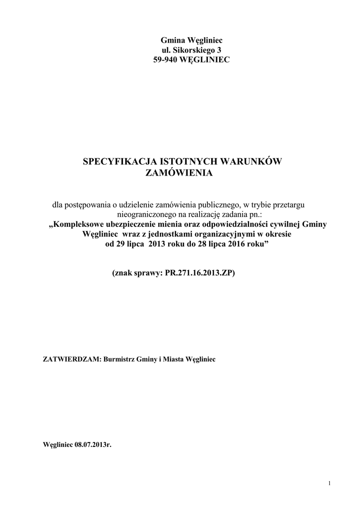 Gmina Węgliniec ul. Sikorskiego 3 59-940 WĘGLINIEC SPECYFIKACJA ISTOTNYCH WARUNKÓW ZAMÓWIENIA dla postępowania o udzielenie zamówienia publicznego, w trybie przetargu nieograniczonego na realizację zadania pn.: „Kompleksowe ubezpieczenie mienia oraz odpowiedzialności cywilnej Gminy Węgliniec wraz z jednostkami organizacyjnymi w okresie od 29 lipca 2013 roku do 28 lipca 2016 roku” (znak sprawy: PR.271.16.2013.ZP) ZATWIERDZAM: Burmistrz Gminy i Miasta Węgliniec Węgliniec 08.07.2013r. 1 I. Postanowienia ogólne 1. Zamawiający: Gmina Węgliniec ul. Sikorskiego 3, 59 – 940 Węgliniec NIP – 615 – 18 – 08 – 660 Tel. 75 77 11 435 fax. 75 77 12 551 e-mail: [email protected] 2. Zamawiający zaprasza do składania ofert w ramach postępowania o udzielenie zamówienia publicznego w trybie przetargu nieograniczonego, prowadzonego zgodnie z ustawą z dnia 29 stycznia 2004 r. Prawo Zamówień Publicznych (tj. Dz. U. z 2010r. Nr 113, poz. 759 ze zm.) zwanej dalej ustawą Pzp. Wartość zamówienia jest mniejsza od równowartości kwoty 200.000 euro. 3. Wykonawca ma obowiązek zapoznać się dokładnie z treścią SIWZ i zgodnie z nią złożyć ofertę. 4. Każdy Wykonawca może złożyć tylko jedną ofertę na całość zamówienia. Złożenie większej liczby ofert spowoduje odrzucenie wszystkich złożonych przez Wykonawcę ofert. 5. O udzielenie zamówienia mogą ubiegać się wyłącznie Wykonawcy, których oferta odpowiada zasadom określonym w ustawie Prawo zamówień publicznych i spełnia wymagania określone w niniejszej Specyfikacji Istotnych Warunków Zamówienia. 6. Wykonawca ponosi samodzielnie wszelkie koszty związane z opracowaniem i złożeniem oferty, niezależnie od wyniku postępowania. Zaleca się, aby Wykonawca dokonał we własnym zakresie wizji lokalnej oraz zdobył wszelkie informacje, które mogą być konieczne do opracowania oferty oraz podpisania umowy 7. Strona internetowa Zamawiającego, na której publikowane są informacje dotyczące niniejszego postępowania, wynikające z ustawy Prawo zamówień publicznych: www.wegliniec.pl II. Opis przedmiotu zamówienia. Oferty częściowe. Umowa ramowa. Zamówienia uzupełniające. Oferty wariantowe. Aukcja elektroniczna. Zwrot kosztów udziału w postępowaniu. Odbiory częściowe. Warunki płatności. Przedmiotem zamówienia jest kompleksowe ubezpieczenie mienia oraz odpowiedzialności cywilnej Gminy Węgliniec wraz z jednostkami organizacyjnymi w okresie od 29.07.2013 roku do 28.07.2016 roku. Zakres zamówienia obejmuje: a) b) c) d) e) Ubezpieczenie mienia od wszystkich ryzyk, Ubezpieczenie sprzętu elektronicznego od wszystkich ryzyk, Ubezpieczenie OC z tytułu prowadzonej działalności i posiadanego mienia, Ubezpieczenie następstw nieszczęśliwych wypadków ochotniczych straży pożarnych, Ubezpieczenia komunikacyjne (OC, AC, NNW, Assistance). Szczegółowy opis przedmiotu zamówienia zawierają załączniki do niniejszej specyfikacji: Załącznik nr 1 „Szczegółowe warunki zamówienia” Załącznik nr 2 „Wykaz budynków i budowli Gminy Węgliniec wraz z jednostkami organizacyjnymi ” Załącznik nr 3 „Wykaz sprzętu elektronicznego Gminy Węgliniec wraz z jednostkami organizacyjnymi” Załącznik nr 4 „Wykaz pojazdów” 2 Załącznik nr 5 „Wymagana treść klauzul dodatkowych – obligatoryjnych” Załącznik nr 6 „Klauzule dodatkowe – fakultatywne” Załącznik nr 7 „Szkodowość” Kody CPV: Przedmiot główny 66000000-0 (usługi finansowe i ubezpieczeniowe) Przedmioty dodatkowe 66515100-4 (usługi ubezpieczenia od ognia) 66515400-7 (usługi ubezpieczenia od skutków żywiołów) 66515000-3 (usługi ubezpieczenia od uszkodzenia lub utraty) 66516400-4 (usługi ubezpieczenia od ogólnej odpowiedzialności cywilnej) 66516000-0 (usługi ubezpieczenia od odpowiedzialności cywilnej) 66516100-1 (usługi ubezpieczeń pojazdów mechanicznych) 66512100-3 (usługi ubezpieczenia od następstw nieszczęśliwych wypadków) 66516500-5 (usługi ubezpieczenia odpowiedzialności cywilnej w związku z wykonywanym zawodem) Zamawiający nie dopuszcza składania ofert częściowych. Zamawiający nie dopuszcza możliwości składania ofert wariantowych. Zamawiający nie zamierza zawierać umowy ramowej. Zamawiający nie przewiduje wyboru najkorzystniejszej oferty z zastosowaniem aukcji elektronicznej. Zamawiający przewiduje udzielenie zamówień uzupełniających do 50% zamówienia podstawowego polegającego na powtórzeniu tego samego rodzaju zamówienia. III. Termin wykonania zamówienia. 1. Terminy wykonania zamówienia – ubezpieczenie ma obejmować okres 36 miesięcy w terminie od 29.07.2013 r. do 28.07.2016 r. z rocznym okresem polisowania. 2. Polisy ubezpieczeniowe dotyczące mienia, odpowiedzialności cywilnej i następstw nieszczęśliwych wypadków będą wystawiane corocznie z podziałem na trzy okresy rozliczeniowe: a) pierwszy okres od dnia 29.07.2013r. do 28.07.2014 r., b) drugi okres od dnia 29.07.2014r. do 28.07.2015 r., c) trzeci okres od dnia 29.07.2015r. do 28.07.2016 r., natomiast polisy ubezpieczeń komunikacyjnych OC/AC/NNW będą wystawiane na pełny roczny okres ubezpieczenia, określony indywidualnie dla każdego pojazdu, rozpoczynający się w okresie wykonywania zamówienia w terminach określonych w załączniku nr 4 „Wykaz pojazdów”. 3. Wnioski o wystawienie dokumentów ubezpieczeniowych potwierdzających zawarcie poszczególnych umów ubezpieczenia, określających m.in. niezbędny okres ubezpieczenia, składał będzie broker ubezpieczeniowy, działający w imieniu i na rzecz Zamawiającego – Dom Brokerski EM BROKERS Sp. z o.o. w Warszawie, Oddział w Zgorzelcu. IV. Warunki udziału w postępowaniu oraz opis sposobu dokonywania oceny spełnienia tych warunków. 1. O udzielenie zamówienia mogą ubiegać się wykonawcy, którzy spełniają warunki dotyczące: 1.1. posiadania uprawnień do wykonywania określonej działalności lub czynności, jeżeli prz