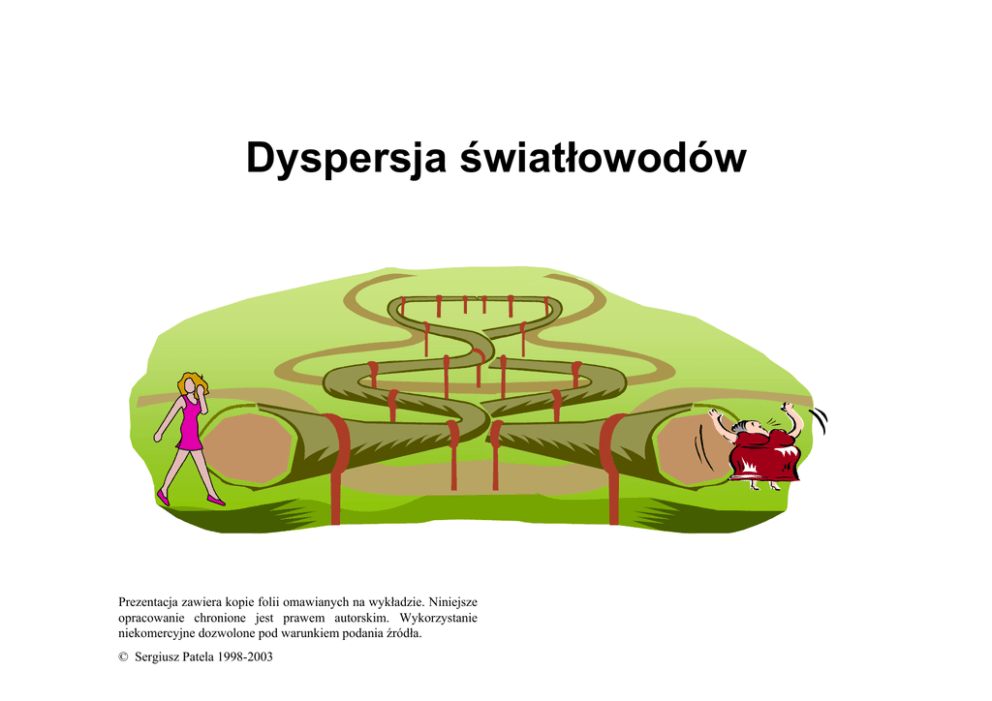 Dyspersja światłowodów Prezentacja zawiera kopie folii omawianych na wykładzie. Niniejsze opracowanie chronione jest prawem autorskim. Wykorzystanie niekomercyjne dozwolone pod warunkiem podania źródła. © Sergiusz Patela 1998-2003 Schemat systemu światłowodowego Źródło światła (nadajnik) „szum” Detektor światła (odbiornik) Elektryczny sygnał wyjściowy Elektryczny sygnał wejściowy © Sergiusz Patela 1998-2001 Światłowód Podstawy teorii światłowodów. Dyspersja światłowodów 2 Degradacja jakości transmisji w systemach światłowodowych • Składniki toru transmisji światłowodowej, umożliwiają komunikację na znaczne odległości z dużymi prędkościami. • Są one jednocześnie źródłem szumu i degradacji jakości transmisji w torze światłowodowym. Jest to tak zwany szum przyrządowy (CNR = Component Related Noise) © Sergiusz Patela 1998-2001 Podstawy teorii światłowodów. Dyspersja światłowodów 3 Źródła degradacji sygnału w systemach światłowodowych (CRN) 1. Dyspersja światłowodu (deformacja impulsu i szum modowy) 2. Tłumienie światłowodu 3. Wzmacniacze optyczne (EDFA) - szum i nierównomierność pasma wzmocnienia 4. Przełączniki optyczne - przesłuchy 5. Laser - migotanie charakterystyki spektralnej 6. Szum cieplny - laser, detektor, osprzęt elektroniczny 7. Szum śrutowy - detektor 8. Nieliniowości pracy urządzeń aktywnych (lasery, detektory, modulatory) 9. Nieliniowości optyczne włókna CRN = Component Related Noise, szum generowany w pasywnych i aktywnych elementach linii światłowodowej. © Sergiusz Patela 1998-2001 Podstawy teorii światłowodów. Dyspersja światłowodów 4 Definicja dyspersji Definicja: Dyspersja to dowolne zjawisko, w którym prędkość rozchodzenia się fali elektromagnetycznej zależy od jej częstotliwości. W telekomunikacji terminu dyspersja używa się opisując procesy, w których sygnał niesiony przez falę elektromagnetyczną rozchodzącą się w ośrodku ulega degradacji. Degradacja ta występuje, ponieważ różne składowe fali (różniące się częstotliwościami lub wektorami falowymi) rozchodzą się z różnymi szybkościami. W komunikacji światłowodowej termin dyspersja odnosi się do kilku, ściśle zdefiniowanych parametrów włókna: dyspersji modowej, materiałowej, własnej i polaryzacyjnej. © Sergiusz Patela 1998-2001 Podstawy teorii światłowodów. Dyspersja światłowodów 5 Dyspersja w światłowodach - ilustracja (poszerzenie impulsu) I T T+∆T t © Sergiusz Patela 1998-2001 Podstawy teorii światłowodów. Dyspersja światłowodów 6 Rodzaje (mechanizmy) dyspersji 1. Modowa 2. Materiałowa 3. Własna (światłowodowa) } Dyspersja światłowodu (dyspersja, dysp. wewnątrzmodowa, dysp. prędkości grupowej) 4. Polaryzacyjna (PMD) © Sergiusz Patela 1998-2001 Podstawy teorii światłowodów. Dyspersja światłowodów 7 Poszerzenie impulsu w światłowodzie skokowym θc α nco ncl t TB © Sergiusz Patela 1998-2001 TB+∆T Podstawy teorii światłowodów. Dyspersja światłowodów 8 Poszerzenie impulsu w światłowodzie skokowym szybkość propagacji v= najkrótsza droga Lmin = L c nco czas propagacji najdłuższa droga Lmax = t= L v L sin θc L L nco L ncl L −L −L − (L − Lmin ) = sin θc n n n ncl ∆T = max = cl co = cl c c c v nco nco nco L = nco − ncl ncl Lnco nco − ncl Lnco2 nco − ncl L nco2 = = = ∆ c c ncl cncl nco c ncl nco © Sergiusz Patela 1998-2001 Podstawy teorii światłowodów. Dyspersja światłowodów 9 Oszacowanie szybkości transmisji światłowodu długość bitu Tb > ∆T ∆T 1> Tb 1 szybkość transmisji B = Tb ∆T . B < 1 2 L n co ∆⋅B <1 c n cl n cl c BL < 2 n co ∆ światłowód skokowy nco=1,5, ncl=1 --> B L < 0,4 (Mb/s)km światłowód skokowy ∆ = 2x10-3 --> B L < 100 (Mb/s)km © Sergiusz Patela 1998-2001 Podstawy teorii światłowodów. Dyspersja światłowodów 10 Dyspersja światłowodu gradientowego z = 2mπ p α 1/ 2 r n0 1 − 2 ∆ dla r < a n( r ) = a n [1 − ∆ ] dla r ≥ a 0 t trajektoria promienia opisana jest rónaniem r ( z ) = r0 cos( pz ) + ( r0' p ) sin ( pz ) gdzie © Sergiusz Patela 1998-2001 p = (2 ∆ / a ) 2 1/ 2 Podstawy teorii światłowodów. Dyspersja światłowodów 11 Prędkość grupowa i prędkość falowa Fala płaska w próżni Prędkość fazowa (prędkość frontu fazowego) v= c nco v Impuls w ośrodku Prędkość grupowa (prędkość paczki falowej, impulsu) dβ v = dω vg -1 g Prędkość grupowa i fazowa są sobie równie w próżni. W ośrodkach materialnych są zazwyczaj różne. Właściwości transmisyjne światłowodu związane są z prędkością grupową © Sergiusz Patela 1998-2001 P Różne składowe spektralne mogą poruszać się z różnymi prędkościami fazowymi Podstawy teorii światłowodów. Dyspersja światłowodów t 12 Grupowy współczynnik załamania Prędkość rozchodzenia się frontu fali w ośrodku charakteryzuje współczynnik załamania. Propagację impulsu charakteryzuje grupowy współczynnik załamania: dβ dω Prędkość grupowa v -g1 = Definicja grupowego współczynnika załamania: β = neff k0 ω d neff dneff 1 dβ d (k0 neff ) ω dneff 1 c -1 vg = = = = neff + = neff + ω dω dω dω c c dω c dω Prędkość fali w ośrodku to c/wsp.zał., stąd prędkość grupowa w ośrodku: vg = © Sergiusz Patela 1998-2001 c ng −eff gdzie 2π ω = c λ k0 = n g −eff = neff + ω Podstawy teorii światłowodów. Dyspersja światłowodów dneff dω 13 Impuls światła w światłowodzie Poszerzenie impulsu (dyspersja) I T T+∆T Impuls światła - dwie charakterystyki: 1. czasowa 2. spektralna I I V(ω1) V(ω2) Każda składowa spektralna porusza się w światłowodzie z inną prędkością t © Sergiusz Patela 1998-2001 ω Podstawy teorii światłowodów. Dyspersja światłowodów 14 Poszerzenie impulsu - analiza I T(ω) - czas propagacji składowej spektralnej o częstotliwości ω. T T+∆T Rozwiniemy T(ω) w szereg Taylora T (ω ) = T (ω 0 ) + dT