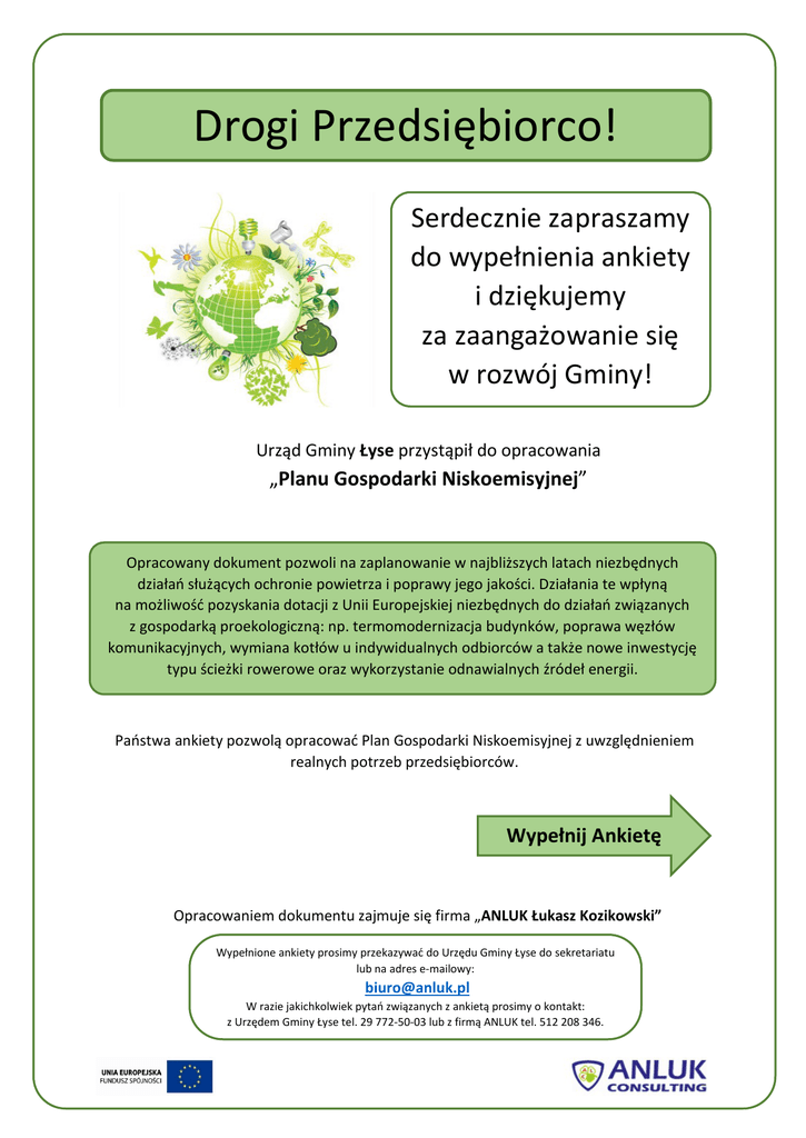 Drogi Przedsiębiorco! Serdecznie zapraszamy do wypełnienia ankiety i dziękujemy za zaangażowanie się w rozwój Gminy! Urząd Gminy Łyse przystąpił do opracowania „Planu Gospodarki Niskoemisyjnej” Opracowany dokument pozwoli na zaplanowanie w najbliższych latach niezbędnych działań służących ochronie powietrza i poprawy jego jakości. Działania te wpłyną na możliwość pozyskania dotacji z Unii Europejskiej niezbędnych do działań związanych z gospodarką proekologiczną: np. termomodernizacja budynków, poprawa węzłów komunikacyjnych, wymiana kotłów u indywidualnych odbiorców a także nowe inwestycję typu ścieżki rowerowe oraz wykorzystanie odnawialnych źródeł energii. Państwa ankiety pozwolą opracować Plan Gospodarki Niskoemisyjnej z uwzględnieniem realnych potrzeb przedsiębiorców. Wypełnij Ankietę Opracowaniem dokumentu zajmuje się firma „ANLUK Łukasz Kozikowski” Wypełnione ankiety prosimy przekazywać do Urzędu Gminy Łyse do sekretariatu lub na adres e-mailowy: [email protected] W razie jakichkolwiek pytań związanych z ankietą prosimy o kontakt: z Urzędem Gminy Łyse tel. 29 772-50-03 lub z firmą ANLUK tel. 512 208 346. PLAN GOSPODARKI NISKOEMISYJNEJ ANKIETA DLA PRZEDSIĘBIORCÓW INFORMACJE OGÓLNE MIEJSCOWOŚĆ, ULICA NAZWA PRZEDSIĘBIORSTWA CZĘŚĆ OGÓLNA - BUDYNEK ROK BUDOWY POWIERZCHNIA OGRZEWANA BUDYNKU [m2] RODZAJ STOLARKI OKIENNEJ I DZWIOWEJ (niepotrzebne skreślić) STARE (powyżej 10 lat) / NOWE TAK / NIE OCIEPLENIE DACHU BUDYNKU RODZAJ ZABUDOWY MIESZKANIE W BUDYNKU WIELORODZINNYM BLIŹNIAK / SZEREGOWY WOLNOSTOJĄCY MUROWANE DREWNIANE RODZAJ ŚCIAN ZEWNĘTRZNYCH INNE (Jeżeli tak to jakie?) RODZAJ STOLARKI OKIENNEJ ALUMINIOWE PVC DREWNIANE INNE (Jeżeli tak to jakie?) RODZAJ ŹRÓDŁA CIEPŁA KOTŁOWNIA INNE (Jeżeli tak to jakie?) ROK MONTAŻU MOC ŹRÓDŁA CIEPŁA (Np. kotła) w [kW] RODZAJ PALIWA / ENERGII WYKORZYSTWANEJ DO OGRZEWANIA BUDYNKU EKOGROSZEK OLEJ OPAŁOWY GAZ ZIEMNY (przyłącze do sieci miejskiej) GAZ PŁYNNY (lpg) WĘGIEL, MIAŁ (paliwo stałe kopalniane) ENERGIA ELEKTRYCZNA BIOMASA / DREWNO INNE (Jeżeli tak to jakie?) JEŻELI DO PRZYGOTOWANIA CIEPŁEJ WODY UŻYTKOWEJ WYKORZYSTUJĘ SIĘ INNE ŹRÓDŁO CIEPŁA NIŻ DO OGRZEWANIA BUDYNKU PROSZĘ WSKAZAĆ JAKIE TO ŹRÓŁO BOILER ELEKTRYCZNY KOLEKTORY SŁONECZNE TRZON KUCHENNY LUB PIEC WĘGLOWY PIECYK GAZOWY INNE (Jeżeli tak to jakie?) ROCZNE ZUŻYCIE PALIWA / ENERGII ELKTRYCZNEJ (Wykorzystywane do ogrzewania budynku, przygotowania c.w.u. oraz do zasilenia maszyn, urządzeń) ROCZNE ZUŻYCIE PALIWA (wyrażone w tonach, m3, litrach lub Gj) ROCZNE ZUŻYCIE PRĄDU (wyrażone w KWh/rok) CZY PAŃSTWA PRZEDSIĘBIORSTWO WYPOSAŻONE JEST W ODNAWIALNE ŹRÓDŁA ENEREGII TAK (Jeżeli tak proszę podać rodzaj NIE CZY W PAŃSTWA PRZEDSIĘBIORSTWIE JEST ZAINSTALOWANA „PRZYDOMOWA” OCZYSZCZALNIA ŚCIEKÓW TAK NIE JEŻELI W CIĄGU NAJBLIŻSZYCH 5 LAT PLANUJĄ PAŃSTWO TERMOMODERNIZACJE BUDYNKU, PROSZĘ PODAĆ W JAKIM ZAKRESIE MONTAŻ KOLEKTORÓW SŁONECZNYCH MONTAŻ POMPY CIEPŁA OCIEPLENIE DACHU OCIEPLENIE ŚCIAN WYMIANA STOLARKI OKIENNEJ LUB DRZWIOWEJ WYMIANA KOTŁA NA NOWY INNE (Jeżeli tak to jakie?) DANE DOTYCZĄCE POSIADANYCH POJAZDÓW OSOBOWYCH, CIĘŻAROWYCH, MASZYN ROLNICZYCH Rodzaj pojazdu Osobowy Ciężarowy Rolniczy Liczba Średnie zużycie paliwa (l/100 km) Benzyna Rodzaj paliwa LPG Diesel Średni roczny przebieg oraz wiek pojazdu (wyrażony w km oraz w latach) *W przypadku posiadania kilku pojazdów proszę ich dane oddzielić ukośnikiem DZIĘKUJEMY ZA WYPEŁNIENIE ANKIETY