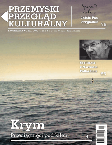 Spacerki osobiste Jaśnie Pan Przypadek 76 KWARTALNIK q 2 (13) 2009 / Cena 7 zł (w tym 0% VAT) Nr ind. 219436 Krym Przeciągnięci pod kilem 4 ISSN 1895-3972 Spotkanie z Martinem Pollackiem 65 Urbs antemurale christianitatis Janusz POLACZEK Dzisiejszy Kamieniec Podolski jawi się jako coś więcej niż tylko jeden z najciekawszych zabytkowych zespołów architektoniczno-urbanistycznych na obszarze obecnej Ukrainy – a ongiś Kresów Wschodnich Rzeczypospolitej. Pozostaje miastem-symbolem w wymiarze ideowo-historycznym. Można się zgodzić z reklamową marką – wcale nie przesadną – że jest swego rodzaju wyspą skarbów. Dodać można, że kuszącą nie tylko urokliwym pięknem ciągle mało znanych zakątków, ale pociągającą dodatkowo aurą tajemniczości. Pełna zagadek jest jego historia. 50 4 12 15 18 20 22 25 Europa Środkowo-Wschodnia Agnieszka KORNIEJENKO, Przeciągnięcipodkilem Andrzej JUSZCZYK, Niewypowiadalne Zdzisław SZELIGA, Sześćjałtańskichśladów Lila KALINOWSKA, MadeinChina Katarzyna DZIERŻAWIN, Tatarskiewesele Andrzej SKIBNIEWSKI, Krymskidziennikpogody Fotografie: Krym,1–8maja2009 Monika MAZIARZ Paweł KOZIOŁ Wojciech KALINOWSKI Agnieszka KORNIEJENKO 34 Olga Hanna SOLARZ, Światpodpółksiężycem 42 Olga HRYŃKIW, Siedemtortów 50 Janusz POLACZEK, Urbsantemurale christianitatis książki 61 Małgorzata MYSZKA, SerhijŻadan, Hymn demokratycznej młodzieży 62 Katarzyna DZIERŻAWIN, ZoranFerić, Pułapkanamyszy WaltaDisneya 63 Monika MAZIARZ, PavelBrycz, Patriarchatudawno minionachwała 64 Joanna KORPAL, SylvaFischerová, Cud literatura 65 Wmoimpisarstwie częstojesttak, żepojawiasię więcejpytańniż odpowiedzi. Spotkanie zMartinemPollackiem muzyka 73 Wojciech KALINOWSKI, Błękitnenuty sylwetki 74 Zdzisław SZELIGA, Niewyjechał,powrócił Krymski dziennik pogody Zrealizowano przy pomocy środków finansowych Województwa Podkarpackiego. 1 maja (piątek) Kwartalnik jest wydawany dzięki dotacji z budżetu Ministerstwa Kultury i Dziedzictwa Narodowego. Na lotnisku w Symferopolu deszcz i zimno jak diabli. Dalej, w kierunku wybrzeża (około 100 km), jedziemy busem. Na szosie tłok – wielu chętnych, by dłuższy, pierwszomajowy weekend, rozpoczynający tu sezon turystyczny, spędzić nad morzem. W Jałcie też zimno, ale przynajmniej już nie pada; chwilami nawet zza ciemnych, skłębionych chmur przebija się ostre słońce. Od razu rzuca się w oczy pewna prawidłowość: linię horyzontu wyznaczają wyłącznie strome skaliste góry lub morze. 22 OKŁADKA: MORZE CZARNE – JAŁTA, FOT. ANDRZEJ SKIBNIEWSKI 2 (13) 2009 MARTIN POLLACK, FOT. MARIUSZ KOŚCIUK Siedem tortów Wydawca: – To cudowne źródło, a woda leczy – wyjaśniają miejscowe kobiety. Skoro leczy, my też napełniamy butelki. Już po powrocie do domu okaże się, że przejeżdżaliśmy przez jedno z najsłynniejszych ukraińskich sanktuariów – Zarwanicę. Półtora miliona pątników rocznie! Grzegorz KARNAS 42 Przemyska Biblioteka Publiczna im. Ignacego Krasickiego ul. Juliusza Słowackiego 15 37-700 Przemyśl tel. centrala: (016) 678 39 60, 678 62 87, 678 36 52, 678 35 82, w. 31 tel./fax: 678 62 91 e-mail: [email protected] www.redakcja.pbp.webd.pl Zespół redakcyjny: Andrzej JUSZCZYK, Wojciech KALINOWSKI (sekretarz redakcji), Paweł KOZIOŁ (redaktor naczelny), Monika MAZIARZ (adiustacja i korekta), Andrzej SKIBNIEWSKI. Redaktor techniczny i opracowanie graficzne: Mariusz KOŚCIUK. felietony Świat pod półksiężycem 76 Zdzisław SZELIGA, Spacerkiosobiste: JaśniePanPrzypadek historia 78 Agnieszka HASKA, Polacy,Ukraińcy,Żydzi płyty 80 Piotr BAŁAJAN, IronMaiden,Voivod, HardcoreSuperstar 81 odnotowano Wersja elektroniczna: Henryk LASKO. Współpracownicy: Kruszyniany, od momentu gdy wysiadłam z autobusu, wydały mi się wyludnione i jakieś takie stepowe. Choć kilka godzin wcześniej przeszła burza i na asfalcie w popołudniowym słońcu lśniły jeszcze kałuże, to wrażenie, że wszystko porasta wysoka żółta trawa, nie opuściło mnie do końca pobytu. 34 Piotr BAŁAJAN, Janusz CZARSKI, Jacek DROZDOWSKI, Katarzyna DZIERŻAWIN, Adam ERD, Anna GIGOŃ, Olga HRYŃKIW, Adam JAREMKO, Lila KALINOWSKA, Ewelina KASPERSKA, Jacek KAWAŁEK, Joanna KOCIUBA, Agnieszka KORNIEJENKO, Joanna KORPAL, Paweł Tomasz KOZIOŁ, Małgorzata MYSZKA, Tadeusz NUCKOWSKI, Janusz POLACZEK, Olga Hanna SOLARZ, Zdzisław SZELIGA. Instytucje współpracujące: •Agencja Rozwoju Przemysłu SA – Oddział w Krasiczynie – Zespół Zamkowo-Parkowy w Krasiczynie, •Arboretum i Zakład Fizjografii w Bolestraszycach, •Centrum Kulturalne w Przemyślu, •Galeria Sztuki Współczesnej w Przemyślu, •Muzeum Historyczne w Sanoku, •Muzeum Narodowe Ziemi Przemyskiej w Przemyślu, •Muzeum-Zamek w Łańcucie, •Państwowa Wyższa Szkoła Wschodnioeuropejska w Przemyślu, Niewypowiadalne Nie mógł mi wyjść ten znak z pamięci. Skąd się tam znalazł? Czy to po prostu ornament w stylu starożytnym? Trochę trudno w to uwierzyć: w końcu był tam tylko taki jeden, w żadnym innym miejscu niepowtórzony. Na pawilonach obok zresztą nie było żadnego znaku... 12 Sześć jałtańskich śladów Nie wiem, kim był. Nazywał się Tarnowski, a jego imię zaczynało się na literę W. Może był polskim ziemianinem, a może arystokratą pieczętującym się herbem Leliwa, jak Tarnowscy z Dzikowa? Pewne jest, że 23 września 1900 roku, po 28-dniowej żegludze po Morzu Czarnym – jak to sam określa – stanął na Krymie w Jałcie. 15 •Przemyskie Centrum Kultury i Nauki „Zamek”. Druk: Drukarnia „Papirus” ul. Spytka z Jarosławia 11 37-500 Jarosław. Redakcja zastrzega sobie prawo dokonywania skrótów oraz zmian tytułów zamieszczanych tekstów. EUROPA ŚRODKOWO-WSCHODNIA Przeciągnięci pod kilem Agnieszka KORNIEJENKO Z pamiętników Winstona Churchilla podczas konferencji pokojowej w Teheranie (V/2/25, 39, 64, 68)1. Kadr z filmu: Liwadija. Grani Istorii, Studija „N”, Jałta 2002 
