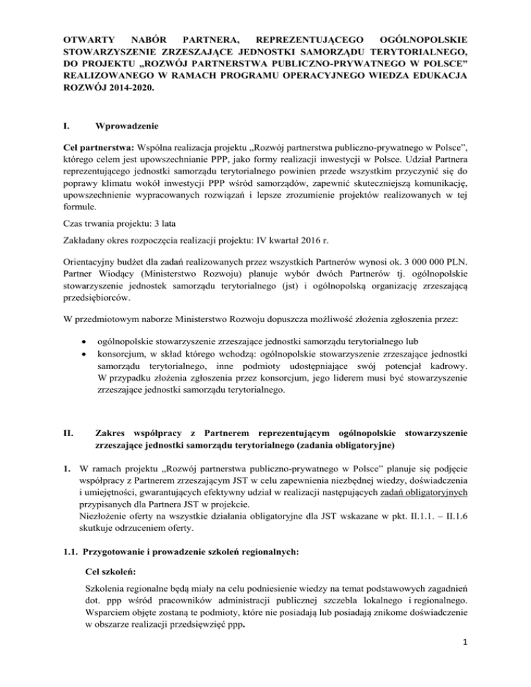 OTWARTY NABÓR PARTNERA, REPREZENTUJĄCEGO OGÓLNOPOLSKIE STOWARZYSZENIE ZRZESZAJĄCE JEDNOSTKI SAMORZĄDU TERYTORIALNEGO, DO PROJEKTU „ROZWÓJ PARTNERSTWA PUBLICZNO-PRYWATNEGO W POLSCE” REALIZOWANEGO W RAMACH PROGRAMU OPERACYJNEGO WIEDZA EDUKACJA ROZWÓJ 2014-2020. I. Wprowadzenie Cel partnerstwa: Wspólna realizacja projektu „Rozwój partnerstwa publiczno-prywatnego w Polsce”, którego celem jest upowszechnianie PPP, jako formy realizacji inwestycji w Polsce. Udział Partnera reprezentującego jednostki samorządu terytorialnego powinien przede wszystkim przyczynić się do poprawy klimatu wokół inwestycji PPP wśród samorządów, zapewnić skuteczniejszą komunikację, upowszechnienie wypracowanych rozwiązań i lepsze zrozumienie projektów realizowanych w tej formule. Czas trwania projektu: 3 lata Zakładany okres rozpoczęcia realizacji projektu: IV kwartał 2016 r. Orientacyjny budżet dla zadań realizowanych przez wszystkich Partnerów wynosi ok. 3 000 000 PLN. Partner Wiodący (Ministerstwo Rozwoju) planuje wybór dwóch Partnerów tj. ogólnopolskie stowarzyszenie jednostek samorządu terytorialnego (jst) i ogólnopolską organizację zrzeszającą przedsiębiorców. W przedmiotowym naborze Ministerstwo Rozwoju dopuszcza możliwość złożenia zgłoszenia przez: II. ogólnopolskie stowarzyszenie zrzeszające jednostki samorządu terytorialnego lub konsorcjum, w skład którego wchodzą: ogólnopolskie stowarzyszenie zrzeszające jednostki samorządu terytorialnego, inne podmioty udostępniające swój potencjał kadrowy. W przypadku złożenia zgłoszenia przez konsorcjum, jego liderem musi być stowarzyszenie zrzeszające jednostki samorządu terytorialnego. Zakres współpracy z Partnerem reprezentującym ogólnopolskie stowarzyszenie zrzeszające jednostki samorządu terytorialnego (zadania obligatoryjne) 1. W ramach projektu „Rozwój partnerstwa publiczno-prywatnego w Polsce” planuje się podjęcie współpracy z Partnerem zrzeszającym JST w celu zapewnienia niezbędnej wiedzy, doświadczenia i umiejętności, gwarantujących efektywny udział w realizacji następujących zadań obligatoryjnych przypisanych dla Partnera JST w projekcie. Niezłożenie oferty na wszystkie działania obligatoryjne dla JST wskazane w pkt. II.1.1. – II.1.6 skutkuje odrzuceniem oferty. 1.1. Przygotowanie i prowadzenie szkoleń regionalnych: Cel szkoleń: Szkolenia regionalne będą miały na celu podniesienie wiedzy na temat podstawowych zagadnień dot. ppp wśród pracowników administracji publicznej szczebla lokalnego i regionalnego. Wsparciem objęte zostaną te podmioty, które nie posiadają lub posiadają znikome doświadczenie w obszarze realizacji przedsięwzięć ppp. 1 Liczba, czas i miejsce szkoleń: Zadaniem Partnera będzie przeprowadzenie cyklu 16 dwudniowych szkoleń regionalnych, po jednym wydarzeniu w każdym z szesnastu województw. Zakłada się, że ww. szkolenia zostaną zrealizowane w okresie 4 miesięcy i cykl rozpocznie się w IV kwartale 2016 r. Przy wyborze miejsca szkolenia uwzględnione zostaną miasta wojewódzkie albo inne miejscowości w danym województwie. Liczba uczestników szkoleń i wskaźniki: Partner w każdym szkoleniu zapewni udział co najmniej 50 osób (unikalni uczestnicy), łącznie wsparciem objęta zostanie grupa co najmniej 800 odbiorców. W wyniku realizacji szkoleń regionalnych zakłada się, że Partner zrealizuje wskaźniki programowe projektu na poziomie: liczba unikalnych osób – min. 800 (za realizację przedmiotowego wskaźnika na poziomie wyższym niż zakładane minimum Partner uzyska dodatkowe punkty – 5 punktów za każde dodatkowe 10% (maksymalnie Partner może otrzymać 10 dodatkowych punktów). liczba unikalnych instytucji – min. 540. Program szkoleń: Program każdego szkolenia powinien uwzględniać m.in: pierwszego dnia: działania MR i administracji rządowej w obszarze ppp (przedstawiciel MR), ogólne zagadnienia na temat tego czym jest ppp, fakty i mity dot. realizacji przedsięwzięć ppp, podstawowe uwarunkowania prawne, podstawowe uwarunkowania finansowe, drugiego dnia: zagadnienia projektowe, w tym: przygotowanie do realizacji projektu, rola i znaczenie doradcy w przedsięwzięciu ppp, doświadczenia krajowe i regionalne w obszarze ppp. Organizacja szkoleń: Partner odpowiedzialny będzie za przeprowadzenie naboru uczestników, organizację i prowadzenie szkoleń, w tym m.in. opracowanie agendy spotkania (wstępny projekt agendy należy dołączyć do zgłoszenia) i materiałów szkoleniowych (m.in. prezentacje, ankiety, zaświadczenia o uczestnictwie w szkoleniu) oraz ich druk, zapewnienie sali z niezbędnym sprzętem multimedialnym, noclegu oraz cateringu. Ponadto Partner odpowiedzialny będzie za zapewnienie zakupu długopisów oraz toreb bawełnianych w ilości gwarantującej otrzymanie ich przez każdego z uczestników. Partner odpowiedzialny będzie również za zapewnienie uczestnikom transportu do miejsca szkolenia, w przypadku realizacji wydarzenia poza granicami miasta wojewódzkiego. W każdym wydarzeniu przewidziano udział dwóch trenerów. Szata graficzna materiałów szkoleniowych i promocyjnych zostanie dostarczona Partnerowi przez Partnera Wiodącego. Partner Wiodący zapewni teczki oraz notesy na szkolenia dla uczestników. 2 Dodatkowe informacje: W każdym szkoleniu udział weźmie ekspert MR- Partnera Wiodącego, który otworzy każde wydarzenie i wygłosi prezentację na temat obecnych oraz planowanych działań administracji rządowej w obszarze ppp. 1.2. Przygotowanie i przeprowadzenie cyklu krajowych wizyt studyjnych Cel krajowych wizyt studyjnych: Celem wizyt studyjnych adresowanych do wybranych przedstawicieli jednostek samorządu terytorialnego lub innych instytucji sektora finansów publicznych (grupa docelowa), będzie upowszechnianie najlepszych krajowych praktyk ppp. Liczba, czas i miejsce wizyt studyjnych: Partner odpowiedzialny będzie za zorganizowanie 12 wizyt st