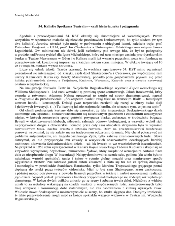 Maciej Michalski 54. Kaliskie Spotkania Teatralne – czyli historia, seks i pożegnania Zgodnie z przewidywaniami 54. KST okazały się skromniejsze od wcześniejszych. Przede wszystkim w repertuarze znalazło się niewiele przedstawień konkursowych, bo tylko siedem (w tym dwa kaliskie). Jurorów również było mniej w porównaniu z ubiegłymi latami, zaledwie troje: prof. Dobrochna Ratajczak z UAM, prof. Jan Ciechowicz z Uniwersytetu Gdańskiego oraz reżyser Janusz Łagodziński. Ów minimalizm nie dziwi, jeśli weźmiemy pod uwagę fakt, że był to pożegnalny w grodzie nad Prosną tydzień dla Igora Michalskiego, który od paru miesięcy zasiada przy dyrektorskim biurku w Teatrze Muzycznym w Gdyni i o Kaliszu myśli już w czasie przeszłym; poza tym fundusze na przygotowanie tak kosztownej imprezy są z każdym rokiem coraz mniejsze. W efekcie trwający od 10 do 16 maja br. konkurs wypadł skromnie. Liczy się jednak jakość. Trzeba przyznać, że wachlarz repertuarowy 54. KST mimo ograniczeń prezentował się interesująco: od klasyki, czyli dzieł Shakespeare’a i Czechowa, po współczesne nam utwory Kazimierza Kutza czy Doroty Masłowskiej, ponadto poza gospodarzami pojawili się przed kaliską publicznością aktorzy z Trójmiasta, Krakowa, Warszawy, Katowic oraz z wysoko notowanej ostatnio sceny kieleckiej. Na inaugurację festiwalu Teatr im. Wojciecha Bogusławskiego wystawił Kupca weneckiego wg Williama Shakespeare’a i od razu wzbudził tą premierą spore kontrowersje. Jakub Roszkowski, który pospołu z reżyserem Adamem Nalepą opracował tę sztukę od strony dramaturgicznej, napisał w Programie do przedstawienia: „Shakespeare osadził swój tekst na weneckim Rialto – tamtejszym centrum handlu i konsumpcji. Dzisiaj gwar targowiska zamienił się raczej w zimny świat akcji i giełdowych inwestycji. (…) Tu liczy się już nie znajomość handlu, ale wiedza o tym, co jest na topie.” Od chwili podniesienia kurtyny dało się zauważyć, że taka interpretacja Szekspirowskiego dzieła zdominuje cały spektakl. Bohaterowie chwalili się kosztownymi gadżetami i zaliczaniem atrakcyjnych miejsc, w których zostawienie sporej gotówki przysparza blasku, zwłaszcza w środowisku bogaczy. Bywali w ekskluzywnych klubach, sklepach, salonach odnowy biologicznej, a wszystko wokół nich nieprzyzwoicie drogie i efekciarskie. Ponadto przez cały czas atmosfera utrzymana była w wyraźnie rozrywkowym tonie, zgodne zresztą z intencją reżysera, który na przedpremierowej konferencji prasowej wspomniał, że nie zależy mu na tradycyjnym odczytaniu dramatu. Nie chciał pokazywać ani problemu antysemityzmu, ani tragedii oszukanego Żyda, tylko zabawę zmanierowanych ludzi. Słowa dotrzymał, co nie przysporzyło mu chwały u wszystkich obserwatorów oczekujących bardziej ambitnego odczytania Szekspirowskiego dzieła – tak jak bywało to we wcześniejszych inscenizacjach. Na przykład w 1958 roku wyreżyserował w Kaliszu Kupca weneckiego Tadeusz Kublaski i skupił się na krzywdzie wyrządzonej Shylockowi, zamożnemu Żydowi, który zażądał od wenecjanina Antonia funta ciała za niespłacenie długu. W inscenizacji Nalepy dominował na scenie seks, golizna (dla wielu była to największa wartość spektaklu), taniec i śpiew w rytmie głośnej muzyki oraz manieryczny sposób wygłaszania tekstów. Nie zabrakło jednak autora Hamleta, a stało się tak nie za sprawą dialogów i monologów w przekładzie Stanisława Barańczaka, tylko Marcina Trzęsowskiego grającego postać dopisaną do sztuki przez twórców widowiska. Miał to być sam Shakespeare, zrazu zaskoczony, a później mocno poirytowany z powodu licznych przeróbek w tekście i nazbyt nowoczesnej realizacji jego dzieła. Wypadł jednak groteskowo i bardziej przypominał miotającego się abderytę niż wybitnego dramaturga. W końcu dwóch osiłków zniosło go ze sceny i zabawa trwała dalej. Niektórzy z widzów uznali to za metaforę wskazującą na upadek wartości u współczesnych ludzi, zainteresowanych tylko tanią rozrywką i konsumpcją dóbr materialnych, nie zaś obcowaniem z kulturą wyższych lotów. Wniosek: nawet Shakespeare’a można wyrzucić ze sceny, bo sztuka sięgnęła dna. Dodajmy ironicznie, że takie przeświadczenie mogli mieć na końcu spektaklu wszyscy widzowie w Teatrze im. Wojciecha Bogusławskiego. 1 Na zdjęciu od lewej: Izabela Beń, Szymon Mysłakowski i Michał Grzybowski w Kupcu weneckim Williama Shakespeare’a. Teatr im. Wojciecha Bogusławskiego w Kaliszu. Reżyseria: Adam Nalepa. Premiera: 10.05.2014. Fot.: Piotr St. Walendowski Jurorzy nie nagrodzili nikogo z kaliskich aktorów występujących w Kupcu weneckim, choć – moim zdaniem – na uwagę zasłużyli Bożena Remelska jako Solania oraz Szymon Mysłakowski w roli Bassania, zwłaszcza jego monolog w finale zabrzmiał przejmująco. Pozostali aktorzy, łącznie z Michałem Grzybowskim (Antonio) oraz Michałem Wierzbickim (Shylock), wypadli blado, co również obniżyło poziom inscenizacji. Kolejny spektakl konkursowy, wystawiony 11 maja na Dużej Scenie, to Płatonow Antoniego Czechowa w realizacji Grzegorza Wiśniewskiego w gdańskim Teatrze Wybrzeże. Reżyser ten chętnie jak dotąd sięgał po dzieła rosyjskiego dramaturga; przypomnijmy, że w Kaliszu wyreżyserował przed laty Mewę, przedstawienie, które zainaugurowało dyrekcję Igora Michalskiego. Pomimo że Płatonow powstał w młodzieńczym okresie Czechowa, to jest sztuką z wielością niezwykle ciekawych osobowości scenicznych i wątków z nimi związanych. Można odnieść wrażenie, że utwór wyszedł spod pióra nie tylko utalentowanego, lecz również bardzo dojrzałego autora. Dlatego reżyserzy wybierają ten tekst, mimo że jego odegranie musi być poparte doskonałym aktorstwem. W przeciwnym razie obnaża wszelkie słabości zespołu artystycznego. Według wielu widzów i krytyków teatralnych, w gdańskiej inscenizacji zabrak