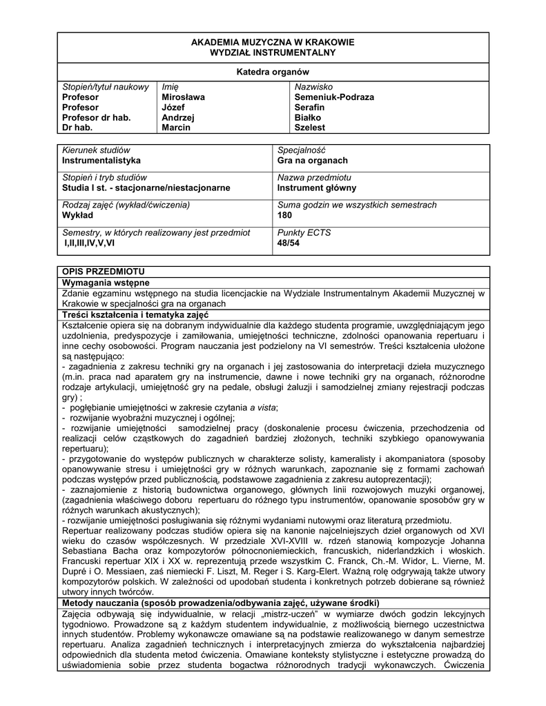 AKADEMIA MUZYCZNA W KRAKOWIE WYDZIAŁ INSTRUMENTALNY Katedra organów Stopień/tytuł naukowy Profesor Profesor Profesor dr hab. Dr hab. Imię Mirosława Józef Andrzej Marcin Nazwisko Semeniuk-Podraza Serafin Białko Szelest Kierunek studiów Instrumentalistyka Specjalność Gra na organach Stopień i tryb studiów Studia I st. - stacjonarne/niestacjonarne Nazwa przedmiotu Instrument główny Rodzaj zajęć (wykład/ćwiczenia) Wykład Suma godzin we wszystkich semestrach 180 Semestry, w których realizowany jest przedmiot I,II,III,IV,V,VI Punkty ECTS 48/54 OPIS PRZEDMIOTU Wymagania wstępne Zdanie egzaminu wstępnego na studia licencjackie na Wydziale Instrumentalnym Akademii Muzycznej w Krakowie w specjalności gra na organach Treści kształcenia i tematyka zajęć Kształcenie opiera się na dobranym indywidualnie dla każdego studenta programie, uwzględniającym jego uzdolnienia, predyspozycje i zamiłowania, umiejętności techniczne, zdolności opanowania repertuaru i inne cechy osobowości. Program nauczania jest podzielony na VI semestrów. Treści kształcenia ułożone są następująco: - zagadnienia z zakresu techniki gry na organach i jej zastosowania do interpretacji dzieła muzycznego (m.in. praca nad aparatem gry na instrumencie, dawne i nowe techniki gry na organach, różnorodne rodzaje artykulacji, umiejętność gry na pedale, obsługi żaluzji i samodzielnej zmiany rejestracji podczas gry) ; - pogłębianie umiejętności w zakresie czytania a vista; - rozwijanie wyobraźni muzycznej i ogólnej; - rozwijanie umiejętności samodzielnej pracy (doskonalenie procesu ćwiczenia, przechodzenia od realizacji celów cząstkowych do zagadnień bardziej złożonych, techniki szybkiego opanowywania repertuaru); - przygotowanie do występów publicznych w charakterze solisty, kameralisty i akompaniatora (sposoby opanowywanie stresu i umiejętności gry w różnych warunkach, zapoznanie się z formami zachowań podczas występów przed publicznością, podstawowe zagadnienia z zakresu autoprezentacji); - zaznajomienie z historią budownictwa organowego, głównych linii rozwojowych muzyki organowej, (zagadnienia właściwego doboru repertuaru do różnego typu instrumentów, opanowanie sposobów gry w różnych warunkach akustycznych); - rozwijanie umiejętności posługiwania się różnymi wydaniami nutowymi oraz literaturą przedmiotu. Repertuar realizowany podczas studiów opiera się na kanonie najcelniejszych dzieł organowych od XVI wieku do czasów współczesnych. W przedziale XVI-XVIII w. rdzeń stanowią kompozycje Johanna Sebastiana Bacha oraz kompozytorów północnoniemieckich, francuskich, niderlandzkich i włoskich. Francuski repertuar XIX i XX w. reprezentują przede wszystkim C. Franck, Ch.-M. Widor, L. Vierne, M. Dupré i O. Messiaen, zaś niemiecki F. Liszt, M. Reger i S. Karg-Elert. Ważną rolę odgrywają także utwory kompozytorów polskich. W zależności od upodobań studenta i konkretnych potrzeb dobierane są również utwory innych twórców. Metody nauczania (sposób prowadzenia/odbywania zajęć, używane środki) Zajęcia odbywają się indywidualnie, w relacji „mistrz-uczeń” w wymiarze dwóch godzin lekcyjnych tygodniowo. Prowadzone są z każdym studentem indywidualnie, z możliwością biernego uczestnictwa innych studentów. Problemy wykonawcze omawiane są na podstawie realizowanego w danym semestrze repertuaru. Analiza zagadnień technicznych i interpretacyjnych zmierza do wykształcenia najbardziej odpowiednich dla studenta metod ćwiczenia. Omawiane konteksty stylistyczne i estetyczne prowadzą do uświadomienia sobie przez studenta bogactwa różnorodnych tradycji wykonawczych. Ćwiczenia techniczne (np. stosowanie różnych rodzajów artykulacji i frazowania) realizowane są na przygotowywanym w danej chwili repertuarze oraz na fragmentach innych utworów na zasadzie analogii. Student przechodzi stopniowo od naśladowania, powtarzania i utrwalania omawianych treści do coraz bardziej samodzielnych wyborów. Omawianie podstawowych założeń teoretycznych, historycznego rozwoju organów i tradycji wykonawczych muzyki organowej stanowi też punkt wyjścia do obiektywnego spojrzenia na pracę własną oraz krytycznej oceny wykonań płytowych i koncertowych innych wykonawców. Podczas zajęć, audycji i egzaminów mogą być używane urządzenia do nagrywania, ułatwiające kontrolę postępów w samodzielnej pracy. Studenci zachęcani są do udziału w kursach mistrzowskich oraz w konkursach w kraju i zagranicą. Biorą też czynny udział w życiu koncertowym Akademii Muzycznej w Krakowie oraz w koncertach organizowanych przez inne instytucje. Cele nauczania i efekty kształcenia (oczekiwane rezultaty nauczania, nabyte przez studentów umiejętności i wiedza) 1. W zakresie umiejętności: – opanowanie i publiczne wykonywanie reprezentatywnego repertuaru organowego w różnych stylach; – umiejętność opracowania i realizacji własnych koncepcji artystycznych; – przyswojenie prawidłowej postawy i technik gry na instrumencie; – opanowanie metod efektywnego ćwiczenia: – opanowanie umiejętności szybkiego czytania nut; – przygotowanie do współpracy z innymi muzykami w różnego rodzaju zespołach, w szczególności w zakresie umiejętności opracowania własnej partii, prawidłowej oceny jej roli oraz umiejscowienia jej w dziele muzycznym; – przygotowanie do występów publicznych pod względem technicznym, interpretacyjnym i emocjonalnym. 2. W zakresie wiedzy: – zaznajomienie się z podstawowym repertuarem organowym, jego zróżnicowaniem stylistycznym; – znajomość elementów wykonywanych dzieł muzycznych i ich wzajemnych relacji oraz wzorców budowy formalnej tych utworów; – znajomość podstawowych linii rozwojowych w historii muzyki organowej, stylów i gatunków muzycznych wraz z reprezentatywnymi dla nich dziełami; – znajomość różnych tradycji wykonawczych; – znajomość podstawowych zagad