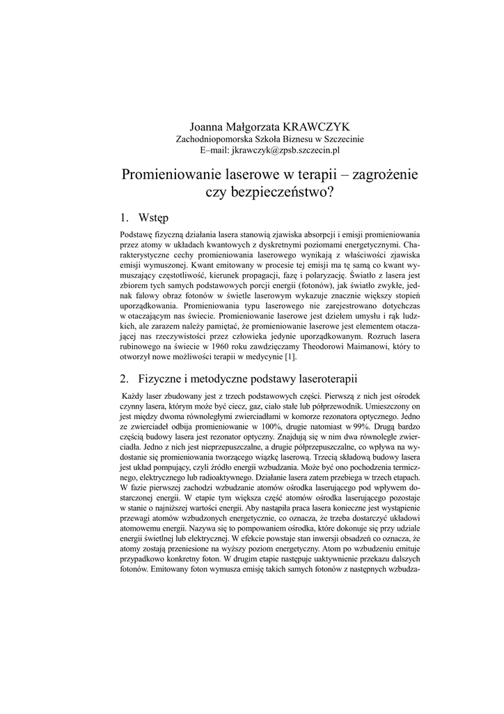 Joanna Małgorzata KRAWCZYK Zachodniopomorska Szkoła Biznesu w Szczecinie E–mail: [email protected] Promieniowanie laserowe w terapii – zagrożenie czy bezpieczeństwo? 1. Wstęp Podstawę fizyczną działania lasera stanowią zjawiska absorpcji i emisji promieniowania przez atomy w układach kwantowych z dyskretnymi poziomami energetycznymi. Charakterystyczne cechy promieniowania laserowego wynikają z właściwości zjawiska emisji wymuszonej. Kwant emitowany w procesie tej emisji ma tę samą co kwant wymuszający częstotliwość, kierunek propagacji, fazę i polaryzację. Światło z lasera jest zbiorem tych samych podstawowych porcji energii (fotonów), jak światło zwykłe, jednak falowy obraz fotonów w świetle laserowym wykazuje znacznie większy stopień uporządkowania. Promieniowania typu laserowego nie zarejestrowano dotychczas w otaczającym nas świecie. Promieniowanie laserowe jest dziełem umysłu i rąk ludzkich, ale zarazem należy pamiętać, że promieniowanie laserowe jest elementem otaczającej nas rzeczywistości przez człowieka jedynie uporządkowanym. Rozruch lasera rubinowego na świecie w 1960 roku zawdzięczamy Theodorowi Maimanowi, który to otworzył nowe możliwości terapii w medycynie [1]. 2. Fizyczne i metodyczne podstawy laseroterapii Każdy laser zbudowany jest z trzech podstawowych części. Pierwszą z nich jest ośrodek czynny lasera, którym może być ciecz, gaz, ciało stałe lub półprzewodnik. Umieszczony on jest między dwoma równoległymi zwierciadłami w komorze rezonatora optycznego. Jedno ze zwierciadeł odbija promieniowanie w 100%, drugie natomiast w 99%. Drugą bardzo częścią budowy lasera jest rezonator optyczny. Znajdują się w nim dwa równoległe zwierciadła. Jedno z nich jest nieprzepuszczalne, a drugie półprzepuszczalne, co wpływa na wydostanie się promieniowania tworzącego wiązkę laserową. Trzecią składową budowy lasera jest układ pompujący, czyli źródło energii wzbudzania. Może być ono pochodzenia termicznego, elektrycznego lub radioaktywnego. Działanie lasera zatem przebiega w trzech etapach. W fazie pierwszej zachodzi wzbudzanie atomów ośrodka laserującego pod wpływem dostarczonej energii. W etapie tym większa część atomów ośrodka laserującego pozostaje w stanie o najniższej wartości energii. Aby nastąpiła praca lasera konieczne jest wystąpienie przewagi atomów wzbudzonych energetycznie, co oznacza, że trzeba dostarczyć układowi atomowemu energii. Nazywa się to pompowaniem ośrodka, które dokonuje się przy udziale energii świetlnej lub elektrycznej. W efekcie powstaje stan inwersji obsadzeń co oznacza, że atomy zostają przeniesione na wyższy poziom energetyczny. Atom po wzbudzeniu emituje przypadkowo konkretny foton. W drugim etapie następuje uaktywnienie przekazu dalszych fotonów. Emitowany foton wymusza emisję takich samych fotonów z następnych wzbudza- 104 Joanna Małgorzata Krawczyk nych atomów ośrodka. Proces ten przebiega w kierunku prostopadłym do zwierciadła i po odbiciu od niego stale nasila się. W konsekwencji coraz więcej atomów emituje fotony, więc jednocześnie liczba spójnych fotonów wzrasta. W trzecim etapie działania lasera następuje wysyłanie promieniowania laserowego [2, 4]. Rozpoczyna się ono wtedy gdy wiązka drgających w jednym kierunku promieni jest na tyle dynamiczna aby doszło do wyzwolenia tej energii przez półprzepuszczalne zwierciadło (Rys. 1). Rys. 1. Układ działania lasera[7] Fig. 1. Układ of the laser [7] Promieniowanie laserowe różni się znacznie od promieniowania które jest emitowane przez inne źródła. Wiązka światła laserowego ma jednakową długość fali, ten sam kierunek i znajduje się w tej samej fazie i jest koherentne. Dzięki tym własnościom wiązka laserowa może zostać skupiona na małej powierzchni, a następnie uzyskać duże natężenie promieniowania. Cechą charakterystyczną światła laserowego jest kolimacja emitowanej wiązki. Oznacza to, że wiązka promieni wysyłana na dużą odległość minimalnie zmienia rozmiar dzięki równoległości, czyli małej rozbieżności kątowej. Jest to istotne ponieważ można uzyskać duże napromieniowanie nawet wtedy gdy wiązka laserowa pokonuje dużą odległość. Promienie światła laserowego są przekazywane do tkanek za pomocą światłowodu lub odbijających wiązkę laserową mobilnych zwierciadeł. Przy pomocy aplikatora trzymanego w ręce naświetla się powierzchnię skóry osoby poddanej działaniu laseroterapii [7]. Efektywność zabiegu z wykorzystaniem lasera uwarunkowana jest przede wszystkim wielkością wyemitowanej tzw. przeliczeniowej dawki energii laserowej wyrażanej w J/cm². W zakres dawki wchodzi średnia moc (W), czas zabiegu (s), a także powierzchnia pola zabiegowego (cm²). Najczęściej zaleca się stosowanie dawek w zakresie od 0,5 J/cm² do kilku J/cm². Światło laserowe może być emitowane w postaci wiązki ciągłej, prawie ciągłej lub pulsacyjnej, a wytwarzane impulsy trwają dziesięć bądź kilka milisekund. Dzięki ostatnio zastosowanej w laserach technice Q-switch, uzyskuje się bardzo krótkie impulsy świetlne. Tego typu lasery mają działanie biologiczne [2]. Za lasery półprzewodnikowe o potwierdzonym działaniu biostymulacyjnym uważa się, te które mają sposobność generowania światła w impulsie o mocy w granicach od 10 W i do 60 W włącznie [3]. Technika naświetlania i jej dobór zależy od rodzaju schorzenia, wielkości pola zabiegowego oraz budowy anatomicznej danej okolicy ciała.Wśród metod stosowa- Promieniowanie laserowe w terapii – zagrożenie czy bezpieczeństwo 105 nych w laseroterapii biostymulacyjnej wyróżnia się metodę bezkontaktową i kontaktową. W metodzie bezkontaktowej odległość sondy laserowej od pola zabiegowego waha się w granicach od 5-10 mm. Większe odległości od pola zabiegowego stosuje się w przypadku skaningu laserowego. Wadą tej tec