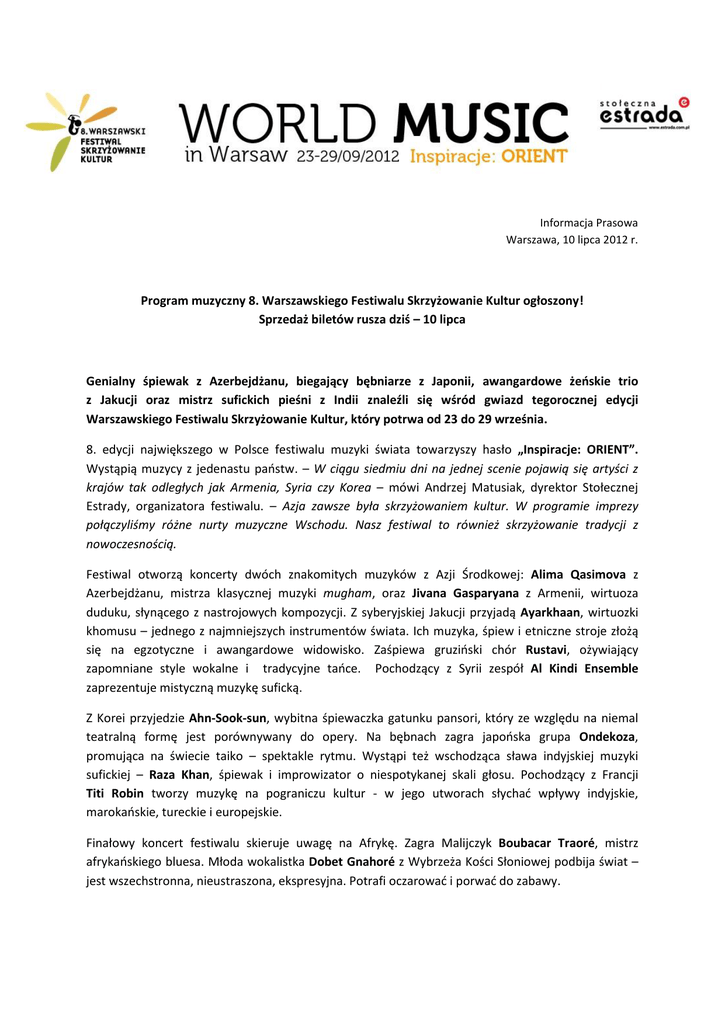 Informacja Prasowa Warszawa, 10 lipca 2012 r. Program muzyczny 8. Warszawskiego Festiwalu Skrzyżowanie Kultur ogłoszony! Sprzedaż biletów rusza dziś – 10 lipca Genialny śpiewak z Azerbejdżanu, biegający bębniarze z Japonii, awangardowe żeńskie trio z Jakucji oraz mistrz sufickich pieśni z Indii znaleźli się wśród gwiazd tegorocznej edycji Warszawskiego Festiwalu Skrzyżowanie Kultur, który potrwa od 23 do 29 września. 8. edycji największego w Polsce festiwalu muzyki świata towarzyszy hasło „Inspiracje: ORIENT”. Wystąpią muzycy z jedenastu państw. – W ciągu siedmiu dni na jednej scenie pojawią się artyści z krajów tak odległych jak Armenia, Syria czy Korea – mówi Andrzej Matusiak, dyrektor Stołecznej Estrady, organizatora festiwalu. – Azja zawsze była skrzyżowaniem kultur. W programie imprezy połączyliśmy różne nurty muzyczne Wschodu. Nasz festiwal to również skrzyżowanie tradycji z nowoczesnością. Festiwal otworzą koncerty dwóch znakomitych muzyków z Azji Środkowej: Alima Qasimova z Azerbejdżanu, mistrza klasycznej muzyki mugham, oraz Jivana Gasparyana z Armenii, wirtuoza duduku, słynącego z nastrojowych kompozycji. Z syberyjskiej Jakucji przyjadą Ayarkhaan, wirtuozki khomusu – jednego z najmniejszych instrumentów świata. Ich muzyka, śpiew i etniczne stroje złożą się na egzotyczne i awangardowe widowisko. Zaśpiewa gruziński chór Rustavi, ożywiający zapomniane style wokalne i tradycyjne tańce. Pochodzący z Syrii zespół Al Kindi Ensemble zaprezentuje mistyczną muzykę suficką. Z Korei przyjedzie Ahn-Sook-sun, wybitna śpiewaczka gatunku pansori, który ze względu na niemal teatralną formę jest porównywany do opery. Na bębnach zagra japońska grupa Ondekoza, promująca na świecie taiko – spektakle rytmu. Wystąpi też wschodząca sława indyjskiej muzyki sufickiej – Raza Khan, śpiewak i improwizator o niespotykanej skali głosu. Pochodzący z Francji Titi Robin tworzy muzykę na pograniczu kultur - w jego utworach słychać wpływy indyjskie, marokańskie, tureckie i europejskie. Finałowy koncert festiwalu skieruje uwagę na Afrykę. Zagra Malijczyk Boubacar Traoré, mistrz afrykańskiego bluesa. Młoda wokalistka Dobet Gnahoré z Wybrzeża Kości Słoniowej podbija świat – jest wszechstronna, nieustraszona, ekspresyjna. Potrafi oczarować i porwać do zabawy. W programie festiwalu tradycyjnie już znalazł się koncert „Suma tradycji” – wspólny występ mistrzów warsztatów, którzy poprowadzą klasy wokalne i instrumentalne. Cykl otwartych warsztatów, to okazja, by uczyć się od wirtuozów m.in. z Indii, Iranu, Rosji i Madagaskaru. Odbędą się również Dziecięce Orientalia - warsztaty i koncerty najmłodszych, prezentujące m.in. taniec i instrumenty indyjskie. Po raz pierwszy partnerem Warszawskiego Festiwalu Skrzyżowanie Kultur jest Planete Doc Film Festival. W Kinotece odbędą się specjalne projekcje poświęcone krajom azjatyckim. Dodatkowe międzykulturowe atrakcje czekają w Klubie Festiwalowym w namiocie festiwalowym pod PKiN. SPRZEDAŻ BILETÓW I KARNETÓW NA FESTIWAL RUSZA JUŻ DZIŚ – 10 LIPCA. Będą one dostępne w sieci Eventim.pl, w Biurze Festiwalowym (siedziba Stołecznej Estrady, ul. Marszałkowska 77/79), a w czasie festiwalu - w namiocie festiwalowym. Bilety na poszczególne koncerty kosztują 25 zł, bilet na Dziecięce Orientalia - 10 zł, a karnet na cały festiwal (z wyjątkiem Dziecięcych Orientaliów) - 120 zł. Organizatorem wydarzenia jest Stołeczna Estrada. Festiwal finansowany jest przez m. st. Warszawa. Wejdź na: www.festival.warszawa.pl oraz na www.facebook.com/SkrzyzowanieKultur Wszelkich informacji udzielają: Jakub Krzeszowski, Go Culture. Komunikacja dla kultury t: + 48 22 224 28 48, 22 490 10 20 oraz + 48 790 765 640, [email protected] Masza Grabowska, Go Culture. Komunikacja dla kultury t: + 48 22 224 28 48, 22 490 10 20 oraz + 48 790 765 642, [email protected]