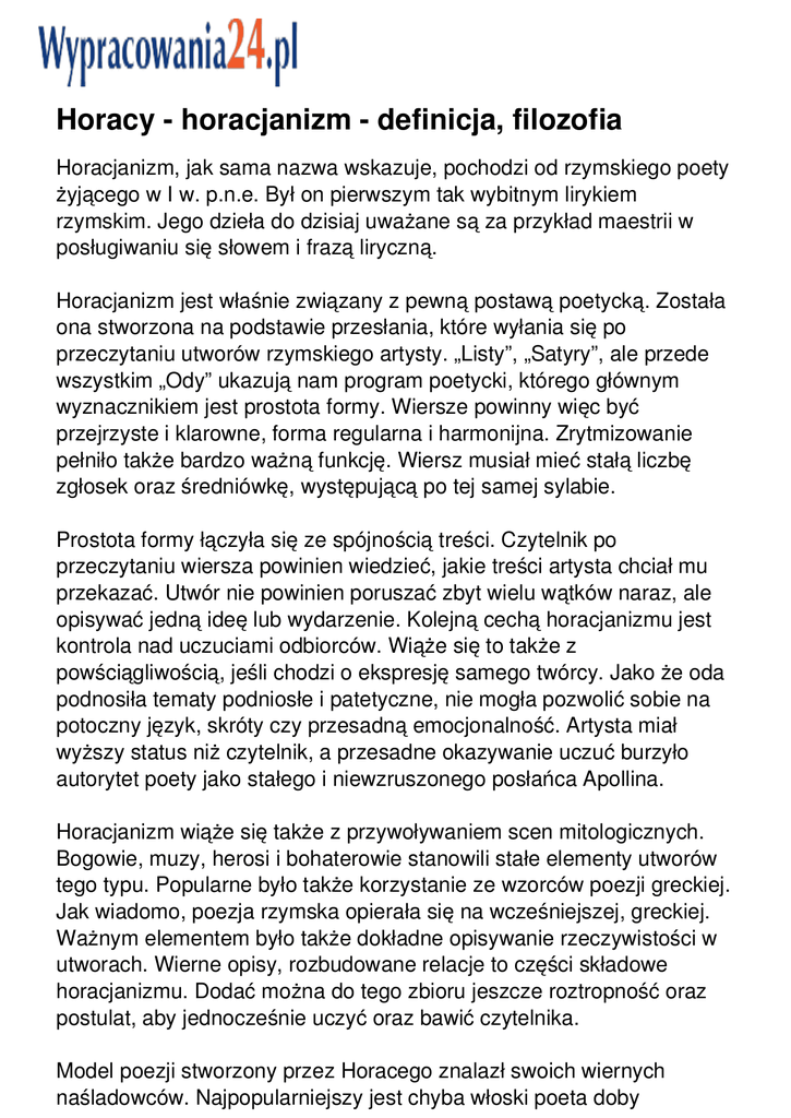 Horacy - horacjanizm - definicja, filozofia Horacjanizm, jak sama nazwa wskazuje, pochodzi od rzymskiego poety żyjącego w I w. p.n.e. Był on pierwszym tak wybitnym lirykiem rzymskim. Jego dzieła do dzisiaj uważane są za przykład maestrii w posługiwaniu się słowem i frazą liryczną. Horacjanizm jest właśnie związany z pewną postawą poetycką. Została ona stworzona na podstawie przesłania, które wyłania się po przeczytaniu utworów rzymskiego artysty. „Listy”, „Satyry”, ale przede wszystkim „Ody” ukazują nam program poetycki, którego głównym wyznacznikiem jest prostota formy. Wiersze powinny więc być przejrzyste i klarowne, forma regularna i harmonijna. Zrytmizowanie pełniło także bardzo ważną funkcję. Wiersz musiał mieć stałą liczbę zgłosek oraz średniówkę, występującą po tej samej sylabie. Prostota formy łączyła się ze spójnością treści. Czytelnik po przeczytaniu wiersza powinien wiedzieć, jakie treści artysta chciał mu przekazać. Utwór nie powinien poruszać zbyt wielu wątków naraz, ale opisywać jedną ideę lub wydarzenie. Kolejną cechą horacjanizmu jest kontrola nad uczuciami odbiorców. Wiąże się to także z powściągliwością, jeśli chodzi o ekspresję samego twórcy. Jako że oda podnosiła tematy podniosłe i patetyczne, nie mogła pozwolić sobie na potoczny język, skróty czy przesadną emocjonalność. Artysta miał wyższy status niż czytelnik, a przesadne okazywanie uczuć burzyło autorytet poety jako stałego i niewzruszonego posłańca Apollina. Horacjanizm wiąże się także z przywoływaniem scen mitologicznych. Bogowie, muzy, herosi i bohaterowie stanowili stałe elementy utworów tego typu. Popularne było także korzystanie ze wzorców poezji greckiej. Jak wiadomo, poezja rzymska opierała się na wcześniejszej, greckiej. Ważnym elementem było także dokładne opisywanie rzeczywistości w utworach. Wierne opisy, rozbudowane relacje to części składowe horacjanizmu. Dodać można do tego zbioru jeszcze roztropność oraz postulat, aby jednocześnie uczyć oraz bawić czytelnika. Model poezji stworzony przez Horacego znalazł swoich wiernych naśladowców. Najpopularniejszy jest chyba włoski poeta doby odrodzenia – Francesco Petrarca, autor słynnych sonetów do Laury. Na gruncie polskim nie mniej znany jest polski mistrz z Czarnolasu – Jan Kochanowski. W późniejszych wiekach do idei horacjanizmu odwoływali się także Maciej Sarbiewski, Ignacy Krasicki czy Leopold Staff. Jednak horacjanizm odnosi się nie tylko do postawy poetyckiej. Oznacza także model życia, który przedstawiony został w utworach Horacego. Jest on połączeniem dwóch filozofii: stoicyzmu, który zakładał harmonię wewnętrzną wynikającą ze zdystansowania się do środowiska zewnętrznego, oraz epikureizmu, którego naczelnym hasłem było „carpe diem”, a więc – „chwytaj dzień”. Fuzja obu idei miała zbliżyć człowieka do szczęścia, które było utożsamiane ze „złotym środkiem”. Optymalną drogą dla człowieczego spełnienia nie jest dążenie do ekstremów, ale harmonia oraz spokój wewnętrzny. Na wysokiej pozycji znajduje się tu natchnienie poetyckie oraz warsztat pisarski. To tworzenie wierszy jest metodą na nieśmiertelność, gdyż, jak głosi oda „Exegi monumentum”, człowiek jest w stanie przetrwać w pamięci pokoleń dzięki swojemu talentowi oraz zaangażowaniu w sztukę. Dobrym przykładem może być także wiersz Horacego „Do Apollina”. Autor przedstawia w nim skromne potrzeby materialne poety, dla którego najwyższą wartością jest życie w dobrym zdrowiu oraz niegasnące natchnienie poetyckie. Horacjanizm, jak wynika z powyższych definicji, może być rozumiany albo jako model poetycki, albo jako postawa moralna. Obie jednak nawiązują do osoby Horacego.
