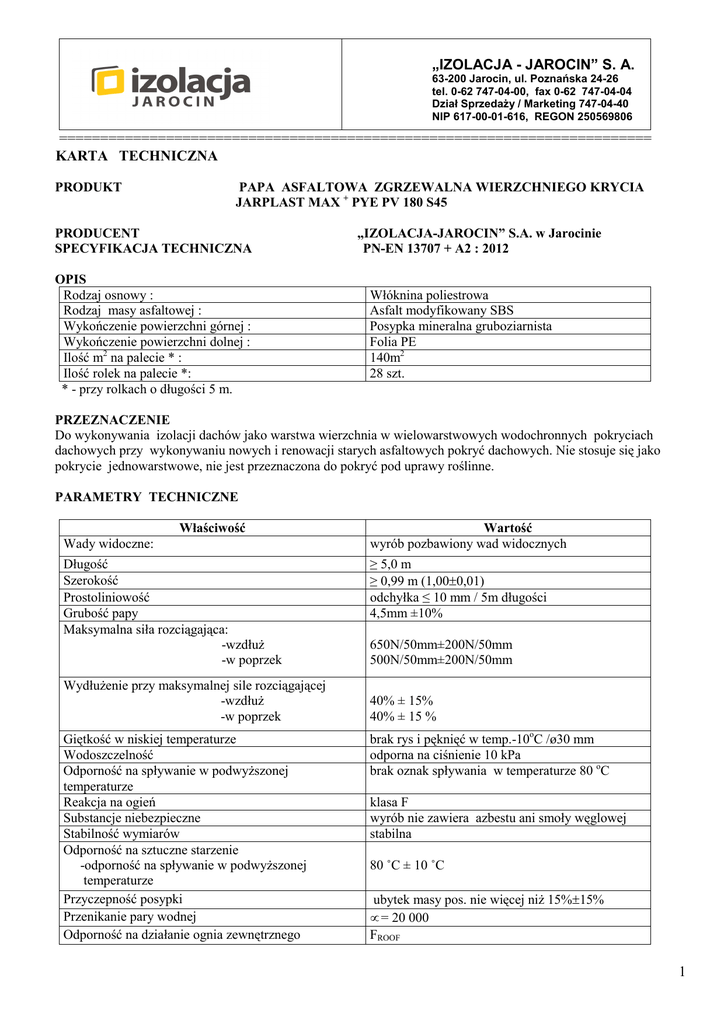 „IZOLACJA - JAROCIN” S. A. 63-200 Jarocin, ul. Poznańska 24-26 tel. 0-62 747-04-00, fax 0-62 747-04-04 Dział Sprzedaży / Marketing 747-04-40 NIP 617-00-01-616, REGON 250569806 ======================================================================== KARTA TECHNICZNA PRODUKT PAPA ASFALTOWA ZGRZEWALNA WIERZCHNIEGO KRYCIA JARPLAST MAX + PYE PV 180 S45 PRODUCENT SPECYFIKACJA TECHNICZNA OPIS Rodzaj osnowy : Rodzaj masy asfaltowej : Wykończenie powierzchni górnej : Wykończenie powierzchni dolnej : Ilość m2 na palecie * : Ilość rolek na palecie *: * - przy rolkach o długości 5 m. „IZOLACJA-JAROCIN” S.A. w Jarocinie PN-EN 13707 + A2 : 2012 Włóknina poliestrowa Asfalt modyfikowany SBS Posypka mineralna gruboziarnista Folia PE 140m2 28 szt. PRZEZNACZENIE Do wykonywania izolacji dachów jako warstwa wierzchnia w wielowarstwowych wodochronnych pokryciach dachowych przy wykonywaniu nowych i renowacji starych asfaltowych pokryć dachowych. Nie stosuje się jako pokrycie jednowarstwowe, nie jest przeznaczona do pokryć pod uprawy roślinne. PARAMETRY TECHNICZNE Właściwość Wady widoczne: Długość Szerokość Prostoliniowość Grubość papy Maksymalna siła rozciągająca: -wzdłuż -w poprzek Wydłużenie przy maksymalnej sile rozciągającej -wzdłuż -w poprzek Giętkość w niskiej temperaturze Wodoszczelność Odporność na spływanie w podwyższonej temperaturze Reakcja na ogień Substancje niebezpieczne Stabilność wymiarów Odporność na sztuczne starzenie -odporność na spływanie w podwyższonej temperaturze Przyczepność posypki Przenikanie pary wodnej Odporność na działanie ognia zewnętrznego Wartość wyrób pozbawiony wad widocznych ≥ 5,0 m ≥ 0,99 m (1,00±0,01) odchyłka ≤ 10 mm / 5m długości 4,5mm ±10% 650N/50mm±200N/50mm 500N/50mm±200N/50mm 40% ± 15% 40% ± 15 % brak rys i pęknięć w temp.-10oC /ø30 mm odporna na ciśnienie 10 kPa brak oznak spływania w temperaturze 80 oC klasa F wyrób nie zawiera azbestu ani smoły węglowej stabilna 80 ˚C ± 10 ˚C ubytek masy pos. nie więcej niż 15%±15% µ = 20 000 FROOF 1 INFORMACJE DLA UŻYTKOWNIKA Warunki układania: Prace dekarskie prowadzić w temperaturze powyżej +5oC (przygotowanie rolek +18oC /24 godz.) Nie należy układać papy w przypadku mokrej powierzchni dachu, jej oblodzenia, podczas opadów atmosferycznych oraz przy silnym wietrze. Warunki stosowania: Układać metodą zgrzewania po uprzednim zagruntowaniu podłoża roztworem asfaltowym wg wytycznych producenta. Nie mocować mechanicznie. Wykonanie izolacji wodochronnych z zastosowaniem papy powinno odbywać się według projektu technicznego opracowanego zgodnie z obowiązującymi przepisami budowlanymi, z uwzględnieniem szczegółowych wytycznych zawartych w instrukcjach producenta. PRZECHOWYWANIE Palety z rolkami należy przechowywać w pomieszczeniach krytych chroniących przed zawilgoceniem, w miejscu zabezpieczonym przed działaniem promieni słonecznych. Palety ustawiać w jednej warstwie. TRANSPORT Palety z rolkami należy przewozić krytymi środkami transportu, ładowane w jednej warstwie w pozycji stojącej obok siebie, zabezpieczone przed przemieszczeniem i uszkodzeniami. DOKUMENTACJA • Deklaracja zgodności • Informacja Techniczna Jarocin, dnia 30.10.2012r 2