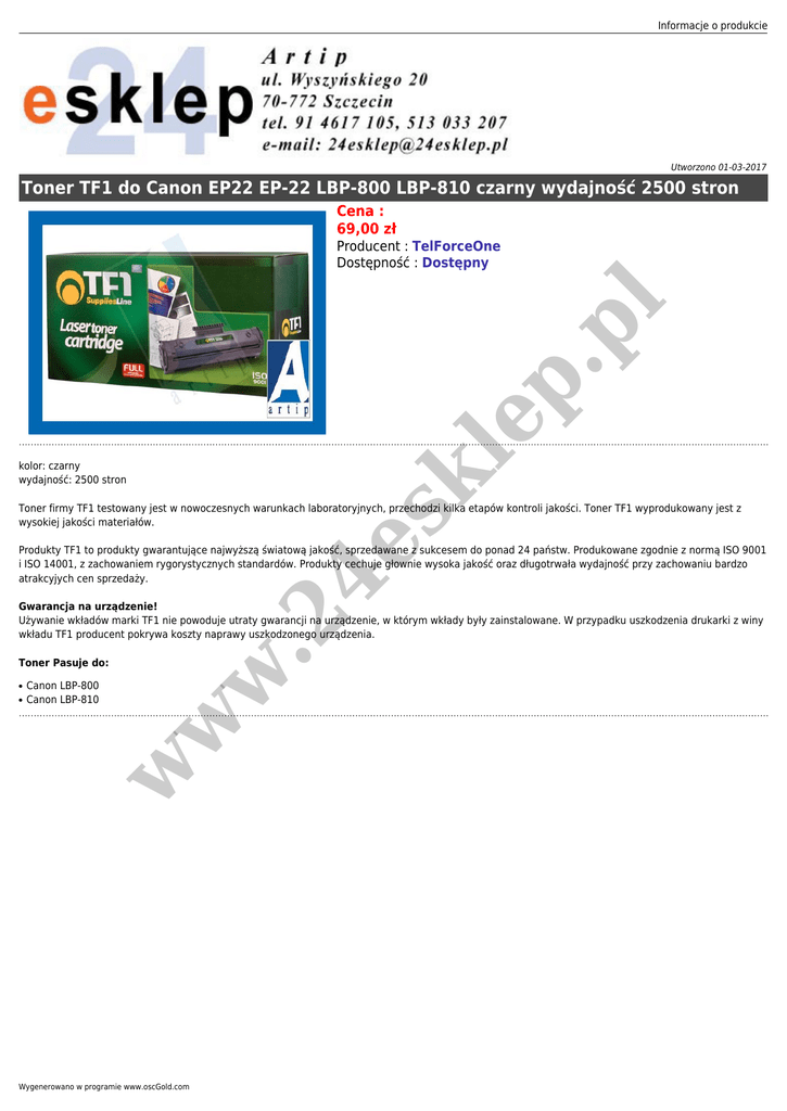 Informacje o produkcie Utworzono 01-03-2017 Toner TF1 do Canon EP22 EP-22 LBP-800 LBP-810 czarny wydajność 2500 stron Cena : 69,00 zł le p. p l Producent : TelForceOne Dostępność : Dostępny sk kolor: czarny wydajność: 2500 stron 4e Toner firmy TF1 testowany jest w nowoczesnych warunkach laboratoryjnych, przechodzi kilka etapów kontroli jakości. Toner TF1 wyprodukowany jest z wysokiej jakości materiałów. Produkty TF1 to produkty gwarantujące najwyższą światową jakość, sprzedawane z sukcesem do ponad 24 państw. Produkowane zgodnie z normą ISO 9001 i ISO 14001, z zachowaniem rygorystycznych standardów. Produkty cechuje głownie wysoka jakość oraz długotrwała wydajność przy zachowaniu bardzo atrakcyjych cen sprzedaży. .2 Gwarancja na urządzenie! Używanie wkładów marki TF1 nie powoduje utraty gwarancji na urządzenie, w którym wkłady były zainstalowane. W przypadku uszkodzenia drukarki z winy wkładu TF1 producent pokrywa koszty naprawy uszkodzonego urządzenia. ● Canon LBP-800 Canon LBP-810 w ● w w Toner Pasuje do: Wygenerowano w programie www.oscGold.com