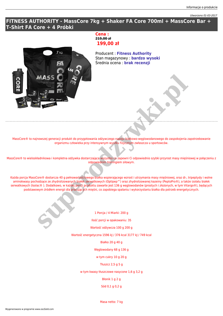 Informacje o produkcie Utworzono 01-03-2017 FITNESS AUTHORITY - MassCore 7kg + Shaker FA Core 700ml + MassCore Bar + T-Shirt FA Core + 4 Próbki Cena : 219,00 zł 199,00 zł w ki .p l Producent : Fitness Authority Stan magazynowy : bardzo wysoki Średnia ocena : brak recenzji ro dz y MassCore® to najnowszej generacji produkt do przygotowania odżywczego napoju białkowo-węglowodanowego do zaspokojenia zapotrzebowanie organizmu człowieka przy intensywnym wysiłku fizycznym zwłaszcza u sportowców. MassCore® to wieloskładnikowa i kompletna odżywka dostarczająca wszystko co zapewni Ci odpowiednio szybki przyrost masy mięśniowej w połączeniu z odpowiednim treningiem siłowym. su pe Każda porcja MassCore® dostarcza 40 g pełnowartościowego białka wspierającego wzrost i utrzymania masy mięśniowej, oraz di-, tripeptydy i wolne aminokwasy pochodzące ze zhydrolizowanych białek serwatkowych (Optipep™) oraz zhydrolizowanej kazeiny (PeptoPro®), a także izolatu białek serwatkowych (Isolac® ). Dodatkowo, w każdej porcji produktu zawarte jest 136 g węglowodanów (prostych i złożonych, w tym Vitargo®), będących podstawowym źródłem energii dla pracujących mięśni, co zapobiega spalaniu i wykorzystaniu białka dla potrzeb energetycznych. 1 Porcja / 4 Miarki: 200 g Ilość porcji w opakowaniu: 35 Wartość odżywcza 100 g 200 g Wartość energetyczna 1596 kJ / 376 kcal 3177 kJ / 749 kcal Białko 20 g 40 g Węglowodany 68 g 136 g w tym cukry 10 g 20 g Tłuszcz 2,5 g 5 g w tym kwasy tłuszczowe nasycone 1,6 g 3,2 g Błonik 1 g 2 g Sód 0,1 g 0,2 g Masa netto: 7 kg Wygenerowano w programie www.oscGold.com Składniki: Kompleks węglowodanowy [maltodekstryna, glukoza, skrobia kukurydziana (Vitargo®)], kompleks białkowy [koncentrat białek mleka, koncentrat białka serwatkowego (Carbelac®), maślanka, izolat białka serwatkowego (Isolac®), hydrolizat białka serwatkowego, zhydrolizowany izolat białka serwatkowego (Optipep™), zhydrolizowana kazeina (PeptoPro®)], kakao1, substancja zagęszczająca (guma ksantanowa), aromaty, barwniki (E150c1,2,3, beta-karoten4,5,6, sproszkowany koncentrat korzenia czerwonego buraka7). Gdzie smaki: 1Czekoladowy, 2Czekoladowy z orzechem laskowym, 3Toffi, 4Bananowy, 5Waniliowy, 6Waniliowo-migdałowy, 7Truskawkowy. Dawkowanie: .p l Zmieszać 4 miarki (200 g) proszku z 400 ml wody lub odtłuszczonego mleka. Spożywać ½-1 porcji na 45-75 minut przed treningiem oraz ½-1 porcji bezpośrednio po zakończonym treningu. W dni bez treningu spożywać 1 porcję pomiędzy posiłkami. Ze względu na wysoką koncentrację składników odżywczych w produkcie, można spożywać ½ porcji MassCore® 2 lub 3 razy dziennie. w ki Uwagi: Nie stosować w przypadku uczulenia na którykolwiek ze składników produktu. Zawiera alergeny mleka. Produkowany w warunkach, w których mogą być obecne śladowe ilości składników pochodzących z: jaj, soi, orzeszków ziemnych, orzechów oraz pszenicy. Produkt nie może być spożywany przez kobiety w ciąży i matki karmiące. Przechowywać w suchym i chłodnym miejscu niedostępnym dla dzieci. Chronić przed bezpośrednim działaniem promieni słonecznych ro dz y T-Shirt FA CORE TEAM - 1szt Koszulka sygnowana logo firmy FA CORE - jednego z największych producentów odżywek. pe Specjalny krój, uwzględniający kulturystyczną budowę - szerokie plecy i odpowiednio dopasowane rękawki, tak by jeszcze lepiej podkreślić Twoją wypracowaną w pocie czoła muskulaturę; Wygodna i przewiewna koszulka z tak charakterystycznym logo jest idealnym strojem dla maniaków pracy z wielkim obciążeniem su Sportowy styl i staranne wykonanie ze 100% bawełny sprawia, że może to być idealny ubiór dla każdego, kto pragnie zamanifestować swoje pasje związane z kulturystyką. Koszulka wykonana z oddychającego materiału. Shaker FA Core - 700ml - Black/Silver - 1szt Trwały, lekki i wygodny, wyposażony w sitko ułatwiające mieszanie odżywek. Ten prosty w użyciu, lekki i wykonany z nietoksycznych materiałów shaker zapewni Ci komfort łatwego przygotowania Twojej odżywki w każdym miejscu i czasie. Informacje o produkcie Idealnie nadaje się do mieszania wszelkiego rodzaju odżywek białkowych, izotonicznych i gainerów; Jest lekki trwały, dzięki czemu nie zwiększy ciężaru Twojej torby treningowej, ani nie zniszczy się podczas transportu. Bardzo łatwo utrzymać go w czystości, dzięki czemu na długo zachowuje wszystkie wymagania higieny. Oryginalny podręczny shaker FA służący do przygotowywania gotowych koktajli z form proszkowych odżywek. .p l Shaker jest modelem zakręcanym dzięki temu możesz zabrać swoją Odżywkę dosłownie wszędzie. ki Shaker posiada podziałkę, dzięki czemu można precyzyjnie odmierzyć ilość wody, mleka czy soku. Łatwy i wygodny w użyciu, stworzony z nietoksycznych materiałów. Bądź pewny że odżywki nie wypłyną Ci w torbie. w FITNESS AUTHORITY - MassCore Bar - 100g ro dz y MassCore Bar to wysokobiałkowy baton, który w jednej porcji dostarcza blisko 31g białka. Dzięki tak bogatemu składowi dochodzi do zwiększenia zdolności anabolicznych, a tym samym osiągnięcia maksymalnych rozmiarów tkanki mięśniowej. Mass Core Bar od Fitness Authority to doskonałe rozwiązanie dla każdego, kto chce zastąpić swoje dotychczasowe posiłki, bądź ma za po prostu zjeść pożywny baton. Skład:Wartość odżywcza: w 100g Wartość energetyczna 399kcal Tłuszcze 12,8g su pe w tym nasycone 4,4g Węglowodany 40,1g w tym cukre 24,3g Błonnik 4,2g Białko 30,6g Sól 1,09g Kwas linolowy 1g Witamina A 223ug Witamina D 1,6ug Witamina E 3,4mg Witamina C 14,3mg Tiamina 0,35mg Ryboflawina 0,51mg Niacyna 5,7mg Witamina B6 0,47mg Witamina B12 0,47ug Kwas foliowy 63,8ug Wygenerowano w programie www.oscGold.com Biotyna 15,9ug Kwas pantotenowy 0,95mg Wapń 229mg Fosfor 461mg Potas 519mg Sód 437mg Żelazo 8,1mg Cynk 4,1mg Miedź 0,69mg Jod 41,9ug .p l Selen 17,55ug Magnez 59,9mg 