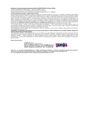 Informacje i instrukcja użytkowania pojazdu 4WD VAPORIZR 900014A2 firmy NIKKO. Zasilanie: akumulator 6V NiMH -pojazd + bateria 9V (6LR61) – pilot. Zestaw zawiera akumulator z ładowarką sieciową oraz baterię 9V do pilota. Instrukcja obrazkowa (strona 3rys.1) przedstawia prawidłową instalację baterii 9V w nadajniku. Ładowanie akumulatora Ni-Mh , instalacja bateri w pilocie. W celu naładowania akumulatora należy go umieścić w ładowarce zgodnie z instrukcją ,strona 3 rys.2 a następnie w obecności osoby dorosłej podłączyć ładowarkę do sieci 230V. Czas ładowania akumulatora wynosi 4 godziny. W przypadku pierwszego ładowania akumulator osiągnie swoją maksymalną pojemność po co najmniej sześciu cyklach ładowania i pełnego rozładowania. Wydłużenie czasu ładowania ponad wartości podane prowadzi do przegrzania pakietu i nieodwracalnego uszkodzenia. Zastosowana ładowarka nie jest ładowarką automatyczną i nie odłączy akumulatora po odpowiednim czasie .Czerwona lampka na ładowarce informuje nas jedynie o prawidłowym procesie ładowania. Zawsze ładuj akumulator tuż przed zabawą. Pamiętaj że akumulatory Ni-Mh rozładowują się samoistnie bez podłączenia do jakiegokolwiek odbiornika. Nie podłączaj do ładowarki akumulatora nie rozładowanego całkowicie. Nie wkładaj do ładowarki ciepłego akumulatora bezpośrednio po zakończeniu zabawy, poczekaj aż ostygnie. Prawidłową instalację akumulatora przedstawiono na stronie 3 rys.2. Przy montażu baterii w pilocie zwróć uwagę na prawidłową polaryzację (+ -).Nie zwieraj baterii, nie próbuj ładować baterii nie przeznaczonych do ładowania. Baterie przeznaczone do ładowania na czas ładowania muszą być wyjęte z pilota - ładowanie wyłącznie pod opieką dorosłych. Wyjmij zużyte baterie z zabawki co zapobiegnie ich wylaniu. W przypadku gdy czerwona lampka LED na nadajniku po włączeniu zasilania nie świeci jasnym światłem ,zasięg aparatury jest mniejszy, należy wymienić baterię na nową. VAPORIZR jest pojazdem przeznaczonym do okresowego przebywania w wodzie. Pamiętaj aby nie wyłączać silników napędowych podczas pokonywania przeszkód wodnych Nie pozostawiaj zabawki pod działaniem deszczu lub na dłuższy czas pod działaniem bezpośrednich promieni słonecznych. Dziwne zachowanie lub utrata kontroli jest powodowane zakłóceniami od CB trafoWN i budynków pomiędzy którymi następuje rozproszenie lub zakłócenie sygnałów z twojego nadajnika. W takich przypadkach musisz zmienić miejsce zabawy. Zachowaj opakowanie do celów gwarancyjnych , serwisowych i informacyjnych. Produkt zgodny z obowiązującymi regulacjami i dyrektywami europejskimi. Przeznaczony dla dzieci od lat 8. Importer/Dystrybutor : Pasja Sp z o.o. nie ponosi odpowiedzialności za wszelkie uszkodzenia mechaniczne ( złamania ,uszkodzenia napędu itd) powstałe na skutek nie stosowania się do niniejszej instrukcji a reklamacje wynikające z nich rozpatrywane będą negatywnie. W w/w przypadkach klient pokrywa koszty transportu przesyłki kurierskiej z serwisu .