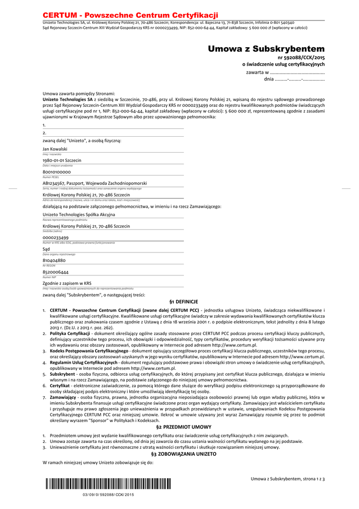 CERTUM - Powszechne Centrum Certyfikacji Unizeto Technologies SA, ul. Królowej Korony Polskiej 21, 70-486 Szczecin; Korespondencja: ul. Bajeczna 13, 71-838 Szczecin, Infolinia 0-801 540340 Sąd Rejonowy Szczecin-Centrum XIII Wydział Gospodarczy KRS nr 0000233499, NIP: 852-000-64-44, Kapitał zakładowy: 5 600 000 zł (wpłacony w całości) Umowa z Subskrybentem nr 592088/CCK/2015 o świadczenie usług certyfikacyjnych zawarta w ........................................ dnia .........-.........-................ Umowa zawarta pomiędzy Stronami: Unizeto Technologies SA z siedzibą w Szczecinie, 70-486, przy ul. Królowej Korony Polskiej 21, wpisaną do rejestru sądowego prowadzonego przez Sąd Rejonowy Szczecin-Centrum XIII Wydział Gospodarczy KRS nr 0000233499 oraz do rejestru kwalifikowanych podmiotów świadczących usługi certyfikacyjne pod nr 1, NIP: 852-000-64-44, kapitał zakładowy (wpłacony w całości): 5 600 000 zł, reprezentowaną zgodnie z zasadami ujawnionymi w Krajowym Rejestrze Sądowym albo przez upoważnionego pełnomocnika: 1. 2. zwaną dalej "Unizeto", a osobą fizyczną: Jan Kowalski Imię i nazwisko 1980-01-01 Szczecin Data i miejsce urodzenia 80010100000 Numer PESEL AB1234567, Paszport, Wojewoda Zachodniopomorski Seria, numer i rodzaj dokumentu tożsamości oraz oznaczenie organu wydającego Królowej Korony Polskiej 21, 70-486 Szczecin Adres do korespondencji (nazwa, ulica i nr domu oraz lokalu, kod i miejscowość) działającą na podstawie załączonego pełnomocnictwa, w imieniu i na rzecz Zamawiającego: Unizeto Technologies Spółka Akcyjna Nazwa reprezentowanego podmiotu Królowej Korony Polskiej 21, 70-486 Szczecin Siedziba (adres) 0000233499 Numer w KRS albo EDG, podstawa prawna funkcjonowania Sąd Dane organu rejestrowego 810404880 Nr REGON 8520006444 Numer NIP Zgodnie z zapisem w KRS Imię i nazwisko osoby/osób upoważnionych do reprezentowania podmiotu zwaną dalej "Subskrybentem", o następującej treści: §1-DEFINICJE 1. CERTUM - Powszechne Centrum Certyfikacji (zwane dalej CERTUM PCC) - jednostka usługowa Unizeto, świadcząca niekwalifikowane i kwalifikowane usługi certyfikacyjne. Kwalifikowane usługi certyfikacyjne świadczy w zakresie wydawania kwalifikowanych certyfikatów klucza publicznego oraz znakowania czasem zgodnie z Ustawą z dnia 18 września 2001 r. o podpisie elektronicznym, tekst jednolity z dnia 8 lutego 2013 r. (Dz.U. z 2013 r. poz. 262). 2. Polityka Certyfikacji - dokument określający ogólne zasady stosowane przez CERTUM PCC podczas procesu certyfikacji kluczy publicznych, definiujący uczestników tego procesu, ich obowiązki i odpowiedzialność, typy certyfikatów, procedury weryfikacji tożsamości używane przy ich wydawaniu oraz obszary zastosowań, opublikowany w Internecie pod adresem http://www.certum.pl. 3. Kodeks Postępowania Certyfikacyjnego - dokument opisujący szczegółowo proces certyfikacji klucza publicznego, uczestników tego procesu, oraz określający obszary zastosowań uzyskanych w jego wyniku certyfikatów, opublikowany w Internecie pod adresem http://www.certum.pl. 4. Regulamin Usług Certyfikacyjnych - dokument regulujący podstawowe prawa i obowiązki stron umowy o świadczenie usług certyfikacyjnych, opublikowany w Internecie pod adresem http://www.certum.pl. 5. Subskrybent - osoba fizyczna, odbiorca usług certyfikacyjnych, do której przypisany jest certyfikat klucza publicznego, działająca w imieniu własnym i na rzecz Zamawiającego, na podstawie załączonego do niniejszej umowy pełnomocnictwa. 6. Certyfikat - elektroniczne zaświadczenie, za pomocą którego dane służące do weryfikacji podpisu elektronicznego są przyporządkowane do osoby składającej podpis elektroniczny i które umożliwiają identyfikację tej osoby. 7. Zamawiający - osoba fizyczna, prawna, jednostka organizacyjna nieposiadająca osobowości prawnej lub organ władzy publicznej, która w imieniu Subskrybenta finansuje usługi certyfikacyjne świadczone przez organ wydający certyfikaty. Zamawiający jest właścicielem certyfikatu i przysługuje mu prawo zgłoszenia jego unieważnienia w przypadkach przewidzianych w ustawie, uregulowaniach Kodeksu Postępowania Certyfikacyjnego CERTUM PCC oraz niniejszej umowie. Ilekroć w umowie używany jest wyraz Zamawiający rozumie się przez to podmiot określany wyrazem "Sponsor" w Politykach i Kodeksach. §2-PRZEDMIOT UMOWY 1. Przedmiotem umowy jest wydanie kwalifikowanego certyfikatu oraz świadczenie usług certyfikacyjnych z nim związanych. 2. Umowa zostaje zawarta na czas określony, od dnia jej zawarcia do czasu ustania ważności certyfikatu wydanego na jej podstawie. 3. Unieważnienie certyfikatu jest równoznaczne z utratą ważności certyfikatu i skutkuje rozwiązaniem niniejszej umowy. §3-ZOBOWIĄZANIA UNIZETO W ramach niniejszej umowy Unizeto zobowiązuje się do: Umowa z Subskrybentem, strona 1 z 3 03/ 09/ 0/ 592088/ CCK/ 2015 CERTUM - Powszechne Centrum Certyfikacji Unizeto Technologies SA, ul. Królowej Korony Polskiej 21, 70-486 Szczecin; Korespondencja: ul. Bajeczna 13, 71-838 Szczecin, Infolinia 0-801 540340 Sąd Rejonowy Szczecin-Centrum XIII Wydział Gospodarczy KRS nr 0000233499, NIP: 852-000-64-44, Kapitał zakładowy: 5 600 000 zł (wpłacony w całości) 1. wydania certyfikatu zgodnie z danymi określonymi we wniosku o wydanie kwalifikowanego certyfikatu stanowiącym integralną część umowy (załącznik nr 1) w terminie 7 dni roboczych od daty przekazania przez Subskrybenta do Unizeto kompletu wymaganych poprawnych dokumentów. Za datę podpisania umowy uznaje się dzień jej wpłynięcia do siedziby Unizeto; 2. świadczenia na rzecz Subskrybenta usług certyfikacyjnych zgodnie z warunkami określonymi w Regulaminie Usług Certyfikacyjnych, Polityce Certyfikacji oraz Kodeksie Postępowania Certyfikacyjnego, a w szczególności do: - unieważnienia lub zawieszenia certyfikatu w przypadku zaistnienia okoliczności uzasadniających jego