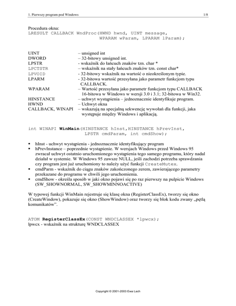 lpfnWndProc - daleki wskaźnik na procedurę obsługi okna (podajemy nazwę wcześniej
