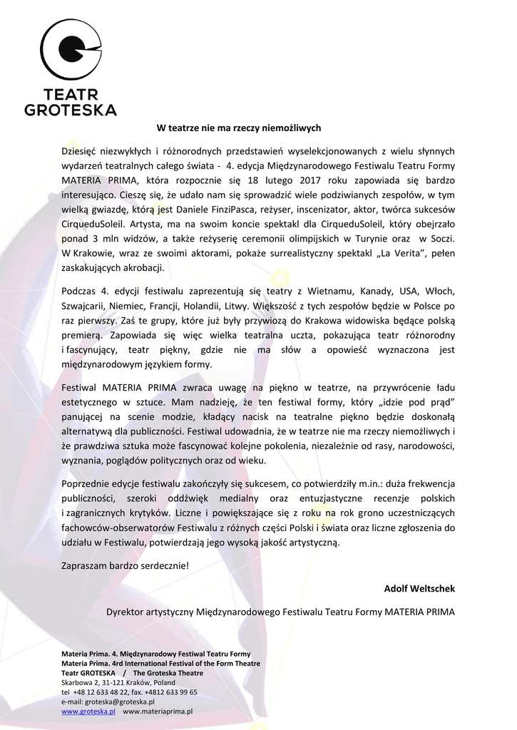 W teatrze nie ma rzeczy niemożliwych Dziesięć niezwykłych i różnorodnych przedstawień wyselekcjonowanych z wielu słynnych wydarzeń teatralnych całego świata - 4. edycja Międzynarodowego Festiwalu Teatru Formy MATERIA PRIMA, która rozpocznie się 18 lutego 2017 roku zapowiada się bardzo interesująco. Cieszę się, że udało nam się sprowadzić wiele podziwianych zespołów, w tym wielką gwiazdę, którą jest Daniele FinziPasca, reżyser, inscenizator, aktor, twórca sukcesów CirqueduSoleil. Artysta, ma na swoim koncie spektakl dla CirqueduSoleil, który obejrzało ponad 3 mln widzów, a także reżyserię ceremonii olimpijskich w Turynie oraz w Soczi. W Krakowie, wraz ze swoimi aktorami, pokaże surrealistyczny spektakl „La Verita”, pełen zaskakujących akrobacji. Podczas 4. edycji festiwalu zaprezentują się teatry z Wietnamu, Kanady, USA, Włoch, Szwajcarii, Niemiec, Francji, Holandii, Litwy. Większość z tych zespołów będzie w Polsce po raz pierwszy. Zaś te grupy, które już były przywiozą do Krakowa widowiska będące polską premierą. Zapowiada się więc wielka teatralna uczta, pokazująca teatr różnorodny i fascynujący, teatr piękny, gdzie nie ma słów a opowieść wyznaczona jest międzynarodowym językiem formy. Festiwal MATERIA PRIMA zwraca uwagę na piękno w teatrze, na przywrócenie ładu estetycznego w sztuce. Mam nadzieję, że ten festiwal formy, który „idzie pod prąd” panującej na scenie modzie, kładący nacisk na teatralne piękno będzie doskonałą alternatywą dla publiczności. Festiwal udowadnia, że w teatrze nie ma rzeczy niemożliwych i że prawdziwa sztuka może fascynować kolejne pokolenia, niezależnie od rasy, narodowości, wyznania, poglądów politycznych oraz od wieku. Poprzednie edycje festiwalu zakończyły się sukcesem, co potwierdziły m.in.: duża frekwencja publiczności, szeroki oddźwięk medialny oraz entuzjastyczne recenzje polskich i zagranicznych krytyków. Liczne i powiększające się z roku na rok grono uczestniczących fachowców-obserwatorów Festiwalu z różnych części Polski i świata oraz liczne zgłoszenia do udziału w Festiwalu, potwierdzają jego wysoką jakość artystyczną. Zapraszam bardzo serdecznie! Adolf Weltschek Dyrektor artystyczny Międzynarodowego Festiwalu Teatru Formy MATERIA PRIMA Materia Prima. 4. Międzynarodowy Festiwal Teatru Formy Materia Prima. 4rd International Festival of the Form Theatre Teatr GROTESKA / The Groteska Theatre Skarbowa 2, 31-121 Kraków, Poland tel +48 12 633 48 22, fax. +4812 633 99 65 e-mail: [email protected] www.groteska.pl www.materiaprima.pl