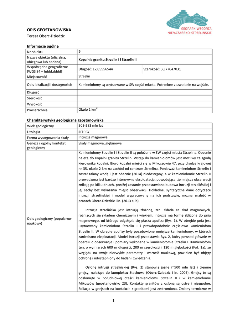 OPIS GEOSTANOWISKA Teresa Oberc-Dziedzic Informacje ogólne Nr obiektu Nazwa obiektu (oficjalna, obiegowa lub nadana) Współrzędne geograficzne [WGS 84 – hddd.dddd] Miejscowość 5 Opis lokalizacji i dostępności: Kamieniołomy są usytuowane w SW części miasta. Potrzebne zezwolenie na wejście. Kopalnia granitu Strzelin I i Strzelin II Długość: 17,05556544 Szerokość: 50,77647031 Strzelin Długość Szerokość Wysokość Powierzchnia Około 1 km 2 Charakterystyka geologiczna geostanowiska Wiek geologiczny 303-283 mln lat Litologia granity Forma występowania skały Geneza i ogólny kontekst geologiczny Intruzja magmowa Skały magmowe, głębinowe Kamieniołomy Strzelin I i Strzelin II są położone w SW części miasta Strzelina. Obecnie należą do Kopalni granitu Strzelin. Wstęp do kamieniołomów jest możliwy za zgodą kierownika kopalni. Biuro kopalni mieści się w Mikoszowie 47, przy drodze krajowej nr 35, około 2 km na zachód od centrum Strzelina. Ponieważ kamieniołom Strzelin I został zalany wodą i jest obecnie (2014) niedostępny, a w kamieniołomie Strzelin II prowadzona jest bardzo intensywna eksploatacja, powodująca, że miejsca obserwacji znikają po kilku dniach, poniżej zostanie przedstawiona budowa intruzji strzelińskiej i jej cechy bez wskazania miejsc obserwacji. Dokładne, syntetyczne dane dotyczące intruzji strzelińskiej i model wypracowany na ich podstawie, można znaleźć w pracach Oberc-Dziedzic i in. (2013 a, b). Opis geologiczny (popularnonaukowy) Intruzja strzelińska jest intruzją złożoną, tzn. składa ze skał magmowych, różniących się składem chemicznym i wiekiem. Intruzja ma formę zbliżoną do pnia magmowego, od którego odgałęzia się płaska apofiza (Rys. 1). W obrębie pnia jest usytuowany kamieniołom Strzelin I i prawdopodobnie częściowo kamieniołom Strzelin II. W obrębie apofizy były posadowione mniejsze kamieniołomy, w których zaniechano eksploatacji. Model intruzji przedstawia Rys. 2, który powstał głównie w oparciu o obserwacje i pomiary wykonane w kamieniołomie Strzelin I. Kamieniołom ten, o wymiarach 600 m długości, 200 m szerokości i 120 m głębokości (Fot. 1a), ze względu na swoje niezwykłe parametry i wartość naukową, powinien być objęty ochroną i udostępniony do badań i zwiedzania. Osłonę intruzji strzelińskiej (Rys. 2) stanowią jasne (~500 mln lat) i ciemne gnejsy, należące do kompleksu Stachowa (Oberc-Dziedzic i in. 2005). Gnejsy te są odsłonięte w południowej części kamieniołomu Strzelin II i w kamieniołomie Mikoszów (geostanowisko 23). Kontakty granitów z osłoną są ostre i niezgodne. Foliacja w gnejsach na kontakcie z granitami jest zestromiona. Zmiany termiczne w 1 skałach metamorficznych na kontakcie z granitami są bardzo słabe, co świadczy o niewielkich rozmiarach intruzji granitowej. Południowa część intruzji jest zbudowana z jasnoszarego, biotytowego granitu średnioziarnistego. Granit ten składa się z kwarcu (27,5-34,5 %), mikroklinu (24,134,0 %), plagioklazu (20,6-40,1 %) i biotytu (3,7-6,6 %) (Morawski i Kościówko 1975). Wielkość ziaren wynosi 2-5 mm, ziarna mikroklinu są nieco większe niż ziarna plagioklazu. Granit wykazuje słabe uporządkowanie ziaren kwarcu i plagioklazu w kierunku ENE-WSW. Granit średnioziarnisty tworzy "płytę" o grubości około 200 m, o rozciągłości WE, stromo nachyloną ku N. Południowy kontakt granitu z osłoną nie jest odsłonięty, jednakże o jego bliskości świadczą ksenolity (enklawy) gnejsów w granicie, czasem otoczone warstwowanym granitem (Fot. 2). W pobliżu południowego kontaktu ze skałami osłony, występuje kilkudziesięciocentymetrowa strefa granitu, zbudowana z warstw średnio i drobnoziarnistego granitu o grubości kilku cm. Składniki mineralne w warstwach wykazują linijne uporządkowanie o kierunku ENE-WSW. "Warstwy" granitu wyznaczają stromą foliację magmową o przebiegu E-W, która została zdeformowana w otwarte i izoklinalne fałdy (Fot. 3). Północna część intruzji strzelińskiej jest zbudowana z granitu drobnoziarnistego, o przeciętnej wielkości ziaren poniżej 1 mm. Jest to skała barwy szarej z niebieskawym odcieniem, zbudowana z kwarcu (28,7-30,9%), mikroklinu (24,133,3%), plagioklazu (29,8-38,7 %) i biotytu (4,6-8,9 %) (Morawski i Kościówko 1975). Granit drobnoziarnisty, podobnie jak granit średnioziarnisty, cechuje subhoryzontalna mineralna lineacja, zorientowana ENE-WSW, wyznaczona przez linijne uporządkowanie ziaren plagioklazu. Słabo widoczna granica między granitem średnio i drobnoziarnistym ma przebieg wschód-zachód i zapada stromo ku północy. W pobliżu granicy, w granicie średnioziarnistym pojawiają się smugi granitu drobnoziarnistego (Fot. 4), a w granicie drobnoziarnistym występują ksenolity skał osłony (Fot. 5) i skupienia ciemnych minerałów, będące pozostałością po roztrawieniu ksenolitów przez magmę. Kilkanaście metrów od kontaktu, ksenolity zanikają, granit drobnoziarnisty staje się monotonny lub zawiera tylko rzadkie 1-3 cm enklawy gnejsów albo wykazuje rytmiczne warstwowanie (Fot. 6). Zarówno granit średnioziarnisty jak i granit drobnoziarnisty są przecięte przez żyły białego, drobnoziarnistego granitu biotytowo-muskowitowego. Żyły te o grubości kilku metrów do kilkudziesięciu cm, mają kierunek E-W do ESE-WNW i są stromo nachylone (Fot. 7 i 8). W północno-wschodniej części kamieniołomu Strzelin I, granit biotytowo-muskowitowy tworzy pień (Fot. 1a). Granit biotytowomuskowitowy jest zbudowany z kwarcu (33,4-34,9%), mikroklinu (30,6-31,3%), plagioklazu (28,4-29,7 %), biotytu (1,8-2,6 %) i muskowitu (2,5-2,8%) (Morawski i Kościówko 1975). Granit ten zawiera również zmienione ziarna kordierytu (pinit) i granat. Granice żył granitu biotytowo-muskowitowego są zazwyczaj ostre. Składniki mineralne w niektórych żyłach są planarnie (foliacja) i linijnie (lineacja) uporządkowane (Fot. 8