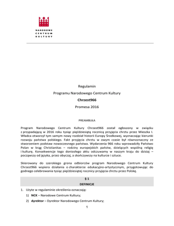 Regulamin Programu Narodowego Centrum Kultury Chrzest966 Promesa 2016 PREAMBUŁA Program Narodowego Centrum Kultury Chrzest966 został ogłoszony w związku z przypadającą w 2016 roku tysiąc pięćdziesiątą rocznicą przyjęcia chrztu przez Mieszka I. Władca otworzył tym samym nowy rozdział historii Europy Środkowej, wyznaczając kierunki rozwoju państwa polskiego. Fakt przyjęcia chrztu w owym czasie był równoznaczny ze stworzeniem podstaw nowoczesnego państwa. Wydarzenia 966 roku wprowadziły Państwo Polan w krąg Christianitas – rodziny europejskich państw, dzielących wspólną religię i kulturę. Konsekwencje tego doniosłego aktu odczuwamy w naszym kraju do dzisiaj – począwszy od języka, przez obyczaj, a skończywszy na kulturze i sztuce. Skierowany do szerokiego grona odbiorców program Narodowego Centrum Kultury Chrzest966 wspiera działania o charakterze edukacyjno-artystycznym, przygotowując do godnego celebrowania tysiąc pięćdziesiątej rocznicy przyjęcia chrztu przez Polskę. §1 DEFINICJE 1. Użyte w regulaminie określenia oznaczają: 1) NCK – Narodowe Centrum Kultury; 2) dyrektor – Dyrektor Narodowego Centrum Kultury; 1 3) minister – Minister Kultury i Dziedzictwa Narodowego; 4) ministerstwo – Ministerstwo Kultury i Dziedzictwa Narodowego; 5) wnioskodawca – podmiot składający wniosek do NCK o dofinansowanie zadania w ramach programu; 6) beneficjent – Wnioskodawca, który uzyskał dofinansowanie w ramach programu na realizację zadania; 7) zadanie – działanie będące przedmiotem wniosku; 8) projekt – koncepcja wnioskodawcy, mieszcząca w swoim zakresie zarówno zadanie, jak i działania przygotowujące do jego realizacji oraz ewentualny plan jego kontynuacji; 9) wniosek – wniosek o dofinansowanie zadania realizowanego ze środków pozostających w dyspozycji NCK, wypełniany i wysyłany przez wnioskodawcę za pośrednictwem EBOI; 10) Elektroniczne Biuro Obsługi Interesanta (EBOI) – system zapewniający komunikację elektroniczną pomiędzy wnioskodawcami a NCK; 11) błędy formalne – wady wniosku wynikające z niedostosowania zadania do wymagań związanych z zakresem programu, które uniemożliwiają udzielenie dofinansowania dla zadania w ramach programu i których wnioskodawca nie może poprawić po terminie zamknięcia naboru do programu; 12) Zespół Oceniający – zespół, w ramach którego każdy z członków dokonuje samodzielnie oceny wniosków złożonych do programu; 13) lista rankingowa – lista wniosków uszeregowanych w kolejności od najwyższej do najniższej przyznanej oceny końcowej; 14) konflikt interesów – sytuacja, w której interes prywatny pracownika NCK lub innej osoby powołanej przez dyrektora do realizacji procedur w ramach programu wpływa na bezstronne i obiektywne wykonanie powierzonych czynności. §2 BUDŻET Prognozowana wielkość środków przeznaczonych na realizację programu wynosi 3 mln zł. 2 §3 INSTYTUCJA ZARZĄDZAJĄCA Instytucją zarządzającą programem jest Narodowe Centrum Kultury. §4 CEL Celem strategicznym programu jest zwiększenie świadomości Polaków na temat roli i znaczenia chrztu Polski jako jednego z najważniejszych wydarzeń w historii państwowości polskiej oraz jego wpływu na kształt współczesnej Polski. Program wspiera inicjatywy kulturalne, których realizacja przyczyni się do: 1) popularyzacji wiedzy na temat chrztu Polski i chrześcijańskich początków ziem, będących kolebką polskiej państwowości, 2) podniesienia świadomości znaczenia chrztu w rozwoju cywilizacyjnym (tj. politycznym, gospodarczym, społecznym, kulturalnym i naukowym) państwa polskiego. §5 UPRAWNIENI WNIOSKODAWCY O dofinansowanie w ramach programu mogą ubiegać się: 1) samorządowe instytucje kultury (z wyłączeniem instytucji współprowadzonych wpisanych w rejestrze instytucji kultury, dla których organizatorem jest Minister Kultury i Dziedzictwa Narodowego oraz instytucji współprowadzonych wpisanych w rejestrze organizatorów samorządowych1). 2) organizacje pozarządowe. §6 RODZAJE KWALIFIKUJĄCYCH SIĘ ZADAŃ 1 Lista instytucji współprowadzonych znajduje się na stronie: http://www.mkidn.gov.pl/pages/stronaglowna/kultura-i-dziedzictwo/instytucje-kultury-w-polsce/instytucje-wspolprowadzone.php . 3 W ramach programu można ubiegać się o dofinansowanie realizacji projektów związanych z upamiętnieniem 1050. rocznicy Chrztu Polski poprzez pokrycie części kosztów realizacji zadań takich, jak: 1) organizacja festiwali, wystaw (wraz z katalogami), koncertów, happeningów, spektakli (teatralnych, muzycznych i innych), konkursów, przeglądów, warsztatów, działań interdyscyplinarnych; 2) nagrania audio, video, rejestracja video spektakli, filmów (w tym: filmów dokumentalnych), wydanie publikacji (w tym publikacji w formach takich, jak: książka drukowana, e-book, audiobook, książka dla niewidomych i słabowidzących); 3) organizacja kampanii edukacyjnych. §7 WYMAGANIA FORMALNE I FINANSOWE DLA ZADANIA 1. Realizacja zadania odbywa się na terenie Rzeczypospolitej Polskiej w 2016 roku. 2. Zadanie może być realizowane od 1 stycznia do 30 listopada 2016 roku, z zastrzeżeniem ust. 3. 3. W szczególnych przypadkach dyrektor może wyrazić zgodę na przesunięcie terminu zakończenia realizacji zadania, o którym mowa w ust. 2. 4. Wnioskodawca może ubiegać się o zgodę dyrektora na przesunięcie terminu zakończenia realizacji zadania, o którym mowa w ust. 2, poprzez umieszczenie we wniosku stosownej informacji wraz z uzasadnieniem. Wniosek nie zawierający takiego uzasadnienia zostanie odrzucony jako błędny formalnie. 5. W przypadku braku zgody, o której mowa w ust. 3-4, wniosek zostanie odrzucony jako błędny formalnie. 6. Jeden wnioskodawca może złożyć maksymalnie 2 wnioski w programie, z zastrzeżeniem § 9 ust. 4 pkt 8. niniejszego regulaminu. 7. Wnioskodawca nie może przeznaczyć na wkład własny środków z dofinansowania uzys