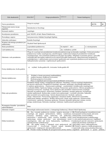 Rok akademicki: Nazwa przedmiotu: 2016/2017 Grupa przedmiotów: podstawowe Numer katalogowy: Wstęp do socjologii ECTS Tłumaczenie nazwy na jęz. angielski: Introduction to Sociology Kierunek studiów: socjologia Koordynator przedmiotu: prof. SGGW, dr hab. Hanna Podedworna, Prowadzący zajęcia: inni pracownicy Zakładu Socjologii Ogólnej, Jednostka realizująca: Katedra Socjologii Wydział, dla którego przedmiot jest realizowany: Wydział Nauk Społecznych Status przedmiotu: a) przedmiot podstawowy b) stopień I rok I Cykl dydaktyczny: Semestr zimowy i letni Jęz. wykładowy: polski Założenia i cele przedmiotu: 10 c) niestacjonarne Wstęp do socjologii jest przedmiotem kształcenia podstawowego na kierunku socjologia. Celem jest przekaz podstawowej wiedzy socjologicznej, umożliwiającej studiowanie kolejnych przedmiotów kształcenia socjologicznego oraz rozumienie podstawowych pojęć dyscypliny. Obejmuje to poznanie genezy i specyfiki socjologii jako dyscypliny naukowej na tle innych dyscyplin społecznych, zaprezentowanie perspektywy socjologicznej w analizowaniu rzeczywistości społecznej oraz wyjaśnienie podstawowych mechanizmów funkcjonowania i przemian współczesnych społeczeństw. a) wykład; liczba godzin 40 , ćwiczenia: liczba godzin 40 Formy dydaktyczne, liczba godzin: Metody dydaktyczne: Pełny opis przedmiotu: 1. Wykład w formie prezentacji multimedialnej. 2. Analiza literatury źródłowej (ćwiczenia) 3. Dyskusja grupowa (ćwiczenia) 4. Praca w zespołach nad rozwiązywaniem problemów (ćwiczenia) Przedmiot oferuje wiedzę z następujących zakresów: Narodziny i rozwój socjologii akademickiej, jej ojcowie założyciele. Perspektywa socjologii, ekonomii, politologii i psychologii społecznej w analizie społeczeństwa. Zastosowania socjologii – socjotechnika i kształtowanie socjologicznej wyobraźni (Mills). Społeczne funkcje socjologii. Poznawanie społeczeństwa. Główne perspektywy i orientacje teoretyczne socjologii. Życie społeczne jako przedmiot zainteresowania socjologii. Stawanie się społeczeństwa: zachowania, działania, interakcje, stosunki społeczne, krystalizacja struktur społecznych. Kultura jako wymiar życia społecznego i wyróżnik człowieka. Jednostka jako uczestnik życia społecznego. System aksjonormatywny i kontrola społeczna. Grupy i zbiorowości. Nowoczesne organizacje i instytucje totalne. Zbiorowość terytorialna, społeczność lokalna, sąsiedztwo. Wielkie zbiorowości: naród, ruchy społeczne. Zróżnicowania i nierówności społeczne. Instytucje społeczne. Elementy dynamiki społecznej: zmiana, rozwój, postęp, modernizacja. Dylematy socjologii i dylematy współczesnych społeczeństw . Wymagania formalne (przedmioty wprowadzające): Brak Założenia wstępne: Równolegle realizowanie kursów z Antropologii kulturowej i Historii Myśli Społecznej Efekty kształcenia: 01. Zna i rozumie podstawowe terminy i pojęcia stosowane w socjologii, jak pojęcie społeczeństwa, kultury, socjalizacji, instytucji, interakcji, grupy społecznej, roli społecznej, nierówności i zróżnicowań, klasy, warstwy, konfliktu, ruchu społecznego, zmiany społecznej oraz najważniejsze teorie socjologiczne, takie jak teoria funkcjonalna, konfliktowa i interakcjonizmu symbolicznego 02. Ma ogólną wiedzę o rodzajach więzi społecznych, jak Gemeinschaft i Gesellschaft, różnych typach interakcji społecznych i rządzących nimi prawidłowościach 03. Posiada wiedzę niezbędną do przygotowania prostej analizy 04. Potrafi posługiwać się podstawowymi koncepcjami teoretycznymi, jak teoria funkcjonalna, teoria konfliktu, teoria interakcjonizmu symbolicznego w celu analizowania przyczyn i implikacji konkretnych zjawisk i procesów społecznych, takich jak przemiany zachodzące w skali makro, mezo i mikrospołecznej 05. Potrafi w oparciu o źródła przygotować wypowiedź ustną i pracę pisemną dotyczącą zagadnień społecznych w języku polskim, Sposób weryfikacji efektów kształcenia: Forma dokumentacji osiągniętych efektów kształcenia: zjawiska lub procesu społecznego, jak zmiany w funkcjonowaniu takich jak zmiany wzorów interakcji instytucji społecznych, modelach ról społecznych, wzorach społecznych w społeczeństwach interakcji i zróżnicowań społecznych zmodernizowanych, analizy modeli ról społecznych, stare i nowe wymiary zróżnicowań społecznych 01- ocena testów egzaminacyjnych, 02- ocena testów egzaminacyjnych 03- ocena pisemnych prac zaliczeniowych (2) 04- Ocena pisemnych prac zaliczeniowych i wystąpień w dyskusji 05- Ocena wystąpień w dyskusji i referatów i eseju Testy egzaminacyjne i prace zaliczeniowe z ćwiczeń Wykład: wynik testu egzaminacyjnego = 80% Wynik eseju =10% udokumentowana obecność na wykładach =10% Łączny wynik ocen z zaliczeń=90% 2) Ćwiczenia: łączny wynik pisemnych prac zaliczeniowych= 65% Aktywność i obecność na zajęciach =25% Referat wygłoszony na zajęciach =10% Łączny wynik ocen z zaliczeń= 65 % Ocena końcowa: 50% zaliczenie ćwiczeń, 50% wynik egzaminu 1) Elementy i wagi mające wpływ na ocenę końcową: Sala dydaktyczna Literatura podstawowa: wykład: 1. Sztompka P., 2012. Socjologia. Analiza społeczeństwa. Nowe poszerzone wydanie, Kraków: Znak. Turner, J., H., 1998. Socjologia. Koncepcje i ich zastosowania, Poznań: Zysk i-Ska 2. Literatura uzupełniająca: wykład 1. Barney D., Społeczeństwo sieci, Warszawa 2008, Sic! 2. Goffman E. Rytuał interakcyjny, Warszawa 2006, PWN 3. Goffman E. Zachowanie w miejscach publicznych, Warszawa 2008, PWN 4. Sennett R, Kultura nowego kapitalizmu, Warszawa 2010, Wyd. Muza 5. Urry J. Spojrzenie turysty, Warszawa 2007, PWN Literatura do eseju (wybór jednej pozycji) 1. Henryk Domański, Zbigniew Karpiński, dariusz Przybysz, Justyna Straczuk, Wzory jedzenia a struktura społeczna, Wyd. Naukowe „Scholar”, Warszawa 2015. 2. Erving Goffman Piętno, Gdańskie Wydawnictwo Psychologiczne, Gdańsk 2003, 