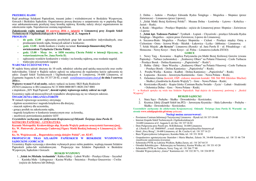 PRZEBIEG RAJDU Rajd przebiega Szlakami Papieskimi, trasami jedno i wielodniowymi w Beskidzie Wyspowym, Gorcach i Beskidzie Sądeckim. Organizatorzy proszą drużyny o zaopatrzenie się w papieską flagę oraz udokumentowanie przebytej trasy kroniką rajdową. Kronikę należy złożyć organizatorom na zakończenie rajdu. Najciekawsze zostaną nagrodzone. Zakończenie rajdu nastąpi 10 czerwca 2016 r. (piątek) w Limanowej przy Zespole Szkół Technicznych i Ogólnokształcących w Limanowej, ul. Z. Augusta 8 PROGRAM do godz. 12.00 - zgłoszenia przybyłych grup lub uczestników indywidualnych, oraz przekazanie kronik rajdu, biorących udział w konkursie; godz. 12.00 – krótki konkurs z wiedzy na temat: Koronacja limanowskiej Piety uwieńczeniem Tysiąclecia Chrztu Polski. godz. 13.00 – Msza św. w 1050 rocznicę Chrztu Polski w intencji Ojczyzny, za wstawiennictwem Św. Jana Pawła II; ogłoszenie wyników konkursów z wiedzy i na kronikę rajdową, oraz rozdanie nagród; tradycyjny poczęstunek (agapa) WARUNKI UCZESTNICTWA W rajdzie biorą udział: drużyny do 10 osób, młodzież szkolna pod opieką nauczyciela oraz osoby indywidualne. Udział w Rajdzie należy zgłosić na załączonej do regulaminu karcie zgłoszenia na adres: Zespół Szkół Technicznych i Ogólnokształcących w Limanowej, 34-600 Limanowa, ul Zygmunta Augusta 8, tel./fax 18 337 26 02, e-mail: [email protected] do dnia 3 czerwca 2016 r. Wpisowe wynosi 5 zł od osoby, należy wpłacić na konto: SKO Rada Rodziców ZSTiO Limanowa w BS Limanowa Nr 33 8804 0000 0071 0020 2367 0001 z dopiskiem „XIV Rajd Papieski”, dowód wpłaty wpisowego należy zabrać na rajd. Uczestnicy rajdu od nieszczęśliwych wypadków ubezpieczają się we własnym zakresie. ŚWIADCZENIA ORGANIZATORÓW W ramach wpisowego uczestnicy otrzymają: - dyplom uczestnictwa i nagroda książkowa dla drużyny, - znaczek rajdowy dla uczestnika, - gorący posiłek na zakończeniu rajdu, - nagrody książkowe w konkursie tematycznym oraz za kronikę, - możliwość potwierdzenia punktów GOT Uczestników zachęcamy do zdobywania Krajoznawczej Odznaki Świętego Jana Pawła II. KONKURS PAPIESKI – LITERATURA Kazanie Metropolity Krakowskiego abp. Karola Wojtyły podczas uroczystości koronacyjnej, Ks. W. Piotrowski „Koronacja Cudownej Figury Matki Boskiej bolesnej w Limanowej (s. 101110) Ks. St. Wojcieszczak „ Bogurodzica ostoją dziejów Polski”, str. 82-87. PROPOZYCJE TRAS SZLAKÓW PAPIESKICH W BESKIDZIE WYSPOWYM, SĄDECKIM i GORCACH Uczestnicy Rajdu wyruszają z dowolnie wybranych przez siebie punktów, wędrują trasami Szlaków Papieskich jedno-lub wielodniowymi. Propozycje tras Szlaków Papieskich w Beskidzie Wyspowym, Sądeckim i Gorcach: BESKID WYSPOWY 1. „Szlak św.Michała Archanioła”: Rabka-Zdrój – Luboń Wielki – Przełęcz Glisne – Szczebel – Kasinka Mała – Lubogoszcz – Kasina Wielka – Śnieżnica – Przełęcz Gruszowiec – Ćwilin (zejście do Jurkowa lub Dobrej); 2. Dobra – Jurków – Przełęcz Edwarda Rydza Śmigłego – Mogielica - Słopnice (przez Zaświercze) – Limanowa (przez Lipowe); 3. „Szlak Matki Bożej Królowej Polski”: Mszana Dolna – Łostówka – Łętowe - Kobylica – Jasień – Rzeki; 4. Rzeki - Mogielica – Przełęcz Słopnicka - zejście do Limanowej przez: Słopnice - Zaświercze i Lipowe 5. „Szlak kpt. Tadeusza Paolone”: Tymbark – Łopień – Chyszówki - przełęcz Edwarda Rydza Śmigłego - Mogielica – zejście przez Zaświercze, Lipowe do Limanowej; 6. Szczawa-Białe: Mogielica - Przełęcz Słopnicka – Cichoń – Przełęcz między Ostrą a Cichoniem – Ostra – Jeżowa Woda – Skiełek – Łukowica – Łyżka – Jabłoniec – Limanowa; 7. Szlak Miejski „do Krzyża”: Limanowa (Rynek)– ul. Jana Pawła II – ul. Piłsudskiego – ul. Słoneczna – Nowy Krzyż – Stary Krzyż – ul. Polna – Limanowa (szkoła ZSTiO) GORCE 1. Nowy Targ – Kowaniec – Kaplica Partyzancka pw.Matki Bożej Królowej Gorców (zwana Papieską) – Turbacz (schronisko) – „Szałasowy Ołtarz” na Polanie Filasowej - Czoło Turbacza – Przełęcz Borek – Dolina Kamienicy – „Papieżówka” – Rzeki*; 2. Rabka –Zdrój – Stare Wierchy - „Szałasowy Ołtarz” na Polanie Filasowej - Czoło Turbacza – Przełęcz Borek – Dolina Kamienicy – „Papieżówka” – Rzeki; 3. Poręba Wielka – Konina – Kudłoń – Dolina Kamienicy – „Papieżówka” – Rzeki; 4. Łopuszna – Kiczora – Jaworzyna Kamienicka – Gorc – Nowa Polana – Rzeki; 5. Ochotnica Górna (kościół, OSP- ciekawe muzeum kontakt: 506 566 980 Zdzisław Błachut) – Skałka („Gazdówka ks.Karola Wojtyły”) – Gorc – Nowa Polana – Rzeki; 6. Krościenko (Rynek) – Kopia Górka /Centrum Ruchu Światło – Życie/ – Lubań – Studzionki - Ochotnica Dolna – Gorc – Nowa Polana – Rzeki; * w Rzekach spotyka się wiele tras Szlaków Papieskich. Stąd dojście do Limanowej: porównaj z „Beskid Wyspowy” 1. 2. BESKID SĄDECKI Stary Sącz – Prehyba – Skałka – Dzwonkówka – Krościenko; Krynica Zdrój (Zespół Szkół im.JP2) – Jaworzyna Krynicka – Hala Łabowska – Prehyba – Skałka – Dzwonkówka – Krościenko; Uczestników zachęcamy do zdobywania Krajoznawczej Odznaki Świętego Jana Pawła II. Warunki na stronie www.szlakipapieskie.pl/strony polecane. Noclegi można zarezerwować: - Powiatowe Centrum Informacji Turystycznej Limanowa – Rynek tel./18/ 337-58-00 - Internat Zespołu Szkół Technicznych i Ogólnokształcących 34-600 Limanowa ul Z. Augusta 8, tel./fax /18/ 337 26 02 - Dom Pielgrzyma przy Parafii pw. M.B.Bolesnej 34-600 Limanowa ul. J.Pawła II 1 tel. 504089847 , e-mail: [email protected] - Hotel „Siwy Brzeg”, 34-600 Limanowa, ul. Br. Czecha 4, tel. /18/ 337 16 23 - Baza Wypoczynkowa Lubogoszcz, Kasinka Mała, tel. /18/ 331 30 01 - Gospodarstwo agroturystyczne Stanisław i Maria Błachut, Zalesie 38, 34-608 Kami