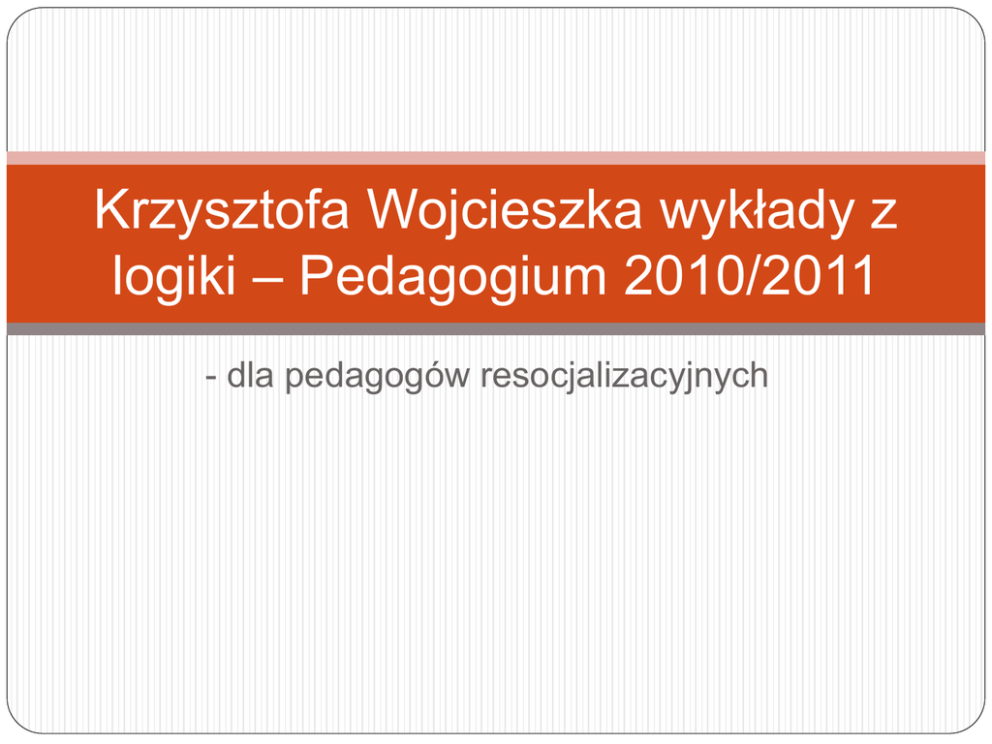 Krzysztofa Wojcieszka wykłady z logiki – Pedagogium 2010/2011 - dla pedagogów resocjalizacyjnych Jak człowiek poznaje i jak o tym oznajmia? (model klasyczny - realizm) Ćwiczenie z „odkrycia naukowego” (ciepło/zimno/plan) Rola precyzji i poprawności w zabiegach poznawczych i w komunikowaniu rezultatów zabiegów poznawczych innym osobom Przykłady braku logiki i ich skutki Jałowe spory Pseudonauka Błędy w ustawodawstwie i orzeczeniach prawnych Ślepe uliczki dociekań naukowych Niekonsekwencje w konstrukcjach światopoglądowych Utrwalanie się fałszu i zła Skąd się wzięła logika jako nauka? Pitagoras i jego program naukowy Klimat wczesnej filozofii greckiej Problem paradoksów poznawczych (Zenon z Elei) Sofiści kontra Sokrates – zręczność czy prawda Klimat Akademii Platońskiej Arystoteles i jego wkład w logikę - Organon Logika Arystotelesa – czym się zajmował i dlaczego? Definiowanie Klasyfikacje logiczne Wnioskowanie, dowodzenie, dyskusje (erystyka) Metoda naukowa – dochodzenie do prawdy WPŁYW ARYSTOTELESA NA DZIEJE NAUKI ( i kultury europejskiej – „organon” jako klasyka nauczania Tzw. trzy zasady myślenia wg Arystotelesa Zasada tożsamości – każdy byt jest tym, czym jest ( „p” wtedy i tylko wtedy gdy „p”), x=x (każdy przedmiot jest identyczny z samym sobą Zasada niesprzeczności • Arystoteles: ten sam przedmiot nie może mieć i nie • • • • mieć jakiejś własności ( nie może być i nie być jednocześnie Inne interpretacje: Z dwu zdań sprzecznych tylko jedno jest prawdziwe Koniunkcja zdania z jego negacją jest zdaniem sprzecznym ( p i nie p – absurd) ( nieprawdą jest, że „p” i nie „p”) Zdanie sprzeczne to tzw. absurd, ale jest zdaniem w sensie logicznym – tyle , że nieprawdziwym Zasada niesprzeczności c.d. Prawo Dunsa Szkota : ze zdania sprzecznego wynika dowolne inne zdanie ! P i nie p to dowolne q Ważne skutki życiowe tego prawa… Zasada wyłączonego środka • „Tertium non datur” – nie ma trzeciej możliwości • W klasycznym rachunku zdań: dla dowolnego zdania w sensie logicznym albo ono samo jest prawdziwe albo jego zaprzeczenie jest prawdziwe • p lub nie – p • W logikach wielowartościowych też obowiązuje, mimo, że żadne ze zdań nie musi być prawdziwe… Pytanie? Czy posługując się prawami logiki wykrywamy prawdę czy raczej jesteśmy ostrzegani przed błędem (fałszem)? Czy prawda jest dla człowieka ważna? Czy błąd jest dla człowieka obojętny? Psychologiczne problemy: system iluzji i zaprzeczeń w uzależnieniu Wkład megarejczyków i stoików w logikę Euklejdes z Megary, uczeń Sokratesa Paradoksy i zagadki: ile trzeba mieć włosów, aby być zaliczonym do łysych (kwestia ostrości wyrażeń) Logicy stoiccy – rachunek zdań, implikacja (wynikanie) – Zenon z Kition , Chryzyp Logika średniowieczna • Czy średniowiecze było zacofane pod względem logiki? • Obalenie mitu o prymitywizmie wieków średnich – od logiki na usługach scholastyki do samodzielnej dziedziny dociekań • Na marginesie sporów o istnienie powszechników • Dlaczego nie doceniamy dorobku wieków średnich? Logika nowożytna Powody i kierunki rozwoju logiki w czasach nowożytnych Związki logiki z matematyką i naukami przyrodniczymi Formalizacja logiki, rachunek kwantyfikatorów Bolzano Wkład Polaków w rozwój logiki • Twardowski • Łukasiewicz • Tarski • Ajdukiewicz • Salamucha • Kotarbiński • Tzw. szkoła lwowsko – warszawska i jej znaczeni w dziejach myśli światowej • Powiązania z rozwojem matematyki w Polsce międzywojennej ( Banach, Steinhaus) – anegdota o Enigmie Semiotyka Relacje semiotyczne: Semantyka – znaki a przedmioty rzeczywiste Syntaktyka – znaki między sobą (niezależnie od znaczenia realnego) Pragmatyka – struktura wyrażania i komunikowania się przy pomocy znaków, znak a jego użytkownik Sądy Wydane lub pomyślane , moment ASERCJI Sprawozdawcze ustosunkowanie się do rzeczywistości Jakieś wyrażenie nazwiemy przy pewnym jego znaczeniu zdaniem oznajmującym ( lub sądem logicznym) jeżeli wyrażenie to wypowiada przy tym znaczeniu jakiś sąd Inne: pytajne, optatywne, rozkazujące Zdania oznajmujące Zdania w sensie logicznym : wszystkie zdania oznajmujące, i tylko takie zdania, są prawdą lub fałszem Prawda lub fałsz to WARTOŚCI LOGICZNE Kategorie syntaktyczne Zdania: z jednego lub więcej wyrazów („pada”, dnieje”). Ta sama kategoria syntaktyczna: gdy zastąpimy w zdaniu wyrażenie A wzięte w znaczeniu Z –a i zastąpimy wyrażeniem B wziętym w znaczeniu Z – b i otrzymamy zdanie – to oba wyrażenia A i B należą do tej samej kategorii syntaktycznej, np. NAZWY Co to są nazwy w znaczeniu logicznym? Nazwy: wszystkie rzeczowniki w znaczeniu przedmiotowym, a nie czasownikowym Wyrażenia typu: najmniejsza wieś w Polsce, źródła Nilu, itp. Uwaga: zawsze badamy znaczenie danej nazwy, bo może ona brzmieć jak nazwa, a nazwą nie być – np. w wyrażeniu „Trzęsienie ziemi!” (ostrzeżenie) ma funkcję wyrażania procesu, dziania się…, a w wyr. „Trzęsienie ziemi trudno przewidzieć” jest nazwą. Pojęcia w sensie logicznym Pojęciem w sensie logicznym ( pojęciem nominalnym) nazywamy znaczenie jakiejś nazwy. Wspólne rozumienie znaczenia jakiegoś wyrażenia ułatwia komunikację społeczną, a rozbieżne ją utrudnia. Inne kategorie syntaktyczne Funktory zdaniotwórcze od jednej nazwy: wyrazy i wyrażenia tworzące zdanie ( zdanie w sensie logicznym) z jedną nazwą. Recydywista Jan siedzi w kryminale. Recydywista Jan maluje. Funktory zdaniotwórcze od dwu nazw: Recydywista Jan bije Piotra. Funktory zdaniotwórcze od zdań Wyrażenia, które odniesione do zdań prostszych tworzą wraz z nimi zdania bardziej złożone. Recydywista Jan zmienia się albo recydywista Jan nie zmienia się. Jan zmienia się i nie zmienia się. Funktory nazwotwórcze od nazw Wyrażenia, które wraz z innymi wy