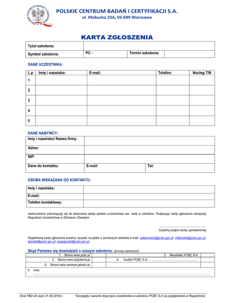 POLSKIE CENTRUM BADAŃ I CERTYFIKACJI S.A. ul. Kłobucka 23A, 02-699 Warszawa KARTA ZGŁOSZENIA Tytuł szkolenia: PC - Symbol szkolenia: Termin szkolenia: DANE UCZESTNIKA: L.p Imię i nazwisko: E-mail: Telefon: Nocleg T/N 1 2 3 4 5 DANE NABYWCY: Imię i nazwisko/ Nazwa firmy: Adres: NIP: Dane do kontaktu: E-mail: Tel: OSOBA WSKAZANA DO KONTAKTU: Imię i nazwisko: E-mail: Telefon kontaktowy: Jednocześnie zobowiązuję się do dokonania opłaty tytułem uczestnictwa ww. osób w szkoleniu. Podpisując kartę zgłoszenia akceptuję Regulamin Uczestnictwa w Szkoleniu Otwartym. ………………………………… Czytelny podpis osoby upoważnionej Wypełnioną kartę zgłoszenia prosimy wysyłać na jeden z poniższych adresów e-mail: [email protected]; [email protected]; [email protected]; [email protected] Skąd Państwo się dowiedzieli o naszym szkoleniu: (proszę zaznaczyć) 1. Strona www.pcbc.pl 3. Strona www.iszkolenia.pl 4. 2. Newsletter PCBC S.A. Auditor PCBC S.A.: …………………………………………. 5. Strona www.centrum.jakości.pl 6. Inne: ………………………………………………………………………………………………………………………………………………………………… Druk FBD-24 (wyd. 01.09.2016r.) *Szczegóły i warunki dotyczące uczestnictwa w szkoleniu PCBC S.A są uwzględnione w Regulaminie. POLSKIE CENTRUM BADAŃ I CERTYFIKACJI S.A. ul. Kłobucka 23A, 02-699 Warszawa REGULAMIN UCZESTNICTWA W SZKOLENIU OTWARTYM Polskie Centrum Badań i Certyfikacji uprzejmie prosi o zapoznanie się z regulaminem szkoleń otwartych. Podpis na karcie zgłoszenia oznacza zapoznanie i akceptację nw. regulaminu. Jest to warunek konieczny do wzięcia udziału w szkoleniu otwartym. ORGANIZATOR 1. Organizatorem szkolenia jest Polskie Centrum Badań i Certyfikacji S.A. z siedzibą w Warszawie, kod pocztowy: 02-699 przy ulicy Kłobuckiej 23A, zarejestrowany w Rejestrze Przedsiębiorców przez Sąd Rejonowy dla M. St. Warszawy w Warszawie, XIII Wydział Gospodarczy Krajowego Rejestru Sądowego pod numerem KRS 0000144813, NIP: 951-20-63-356. SZKOLENIA 1. 2. 3. 4. 5. Organizator realizuje szkolenia w zakresie i terminach szczegółowo opisanych w ofercie szkoleń. Aby wziąć udział w szkoleniu otwartym, organizowanym przez Polskie Centrum Badań i Certyfikacji należy wypełnić Kartę Zgłoszenia i odesłać e-mailem na jeden z poniższych adresów: [email protected]; [email protected]; [email protected]; [email protected]. O przyjęciu na szkolenie decyduje kolejność zgłoszeń. Organizator zastrzega sobie prawo do odmowy przyjęcia zgłoszenia, jeżeli lista Uczestników w danym terminie szkolenia będzie już zamknięta lub w przypadku niezgłoszenia się minimalnej liczby osób, którą przewidział Organizator dla danego szkolenia. Bez kosztowa rezygnacja z udziału w szkoleniu jest możliwa do 5 dni roboczych przed planowaną datą szkolenia, rezygnacja w terminie późniejszym wiąże się z obciążeniem uczestnika pełnymi kosztami udziału w szkoleniu; Na 5 dni roboczych przez terminem rozpoczęcia szkolenia Organizator prześle do osób, które zgłosiły chęć udziału w szkoleniu, za pośrednictwem poczty elektronicznej, potwierdzenie udziału wraz z dodatkowymi informacjami organizacyjnymi dotyczącymi szkolenia CENY SZKOLEŃ I WARUNKI PŁATNOŚCI 1. 2. 3. 4. 5. Cena szkolenia obejmuje: udział w szkoleniu, materiały szkoleniowe oraz certyfikat uczestnictwa/ukończenia szkolenia, a także koszty posiłków (przerwy kawowe i/lub lunch), opcjonalnie koszty pełnego wyżywienia wraz z zakwaterowaniem, zgodnie z ofertą dotyczącą danego szkolenia. Ceny szkoleń podane są w złotych polskich w kwotach netto. Organizator nie zapewnia dojazdu ani zakwaterowania w ramach opłaty za szkolenie, chyba że znajdują się one w ofercie danego szkolenia. Płatność za udział w szkoleniu należy uiścić przed realizacją szkolenia, zaraz po otrzymaniu od Project Managera PCBC S.A. informacji o tym, że szkolenie się odbywa. Numer rachunku oraz termin płatności zostanie podany w materiałach informacyjnych przesłanych przez Project Managera najpóźniej tydzień przed planowanym szkoleniem; Po zaksięgowaniu wpływu na konto PCBC S.A. zostanie wystawiona faktura za udział w szkoleniu. REZYGNACJA Z UCZESTNICTWA – ODSTĄPIENIE OD UMOWY 1. 2. 3. W przypadku otrzymania przez Organizatora oświadczenia o rezygnacji ze szkolenia nie później niż 5 dni roboczych przed datą rozpoczęcia szkolenia, Zamawiający nie ponosi żadnych kosztów związanych z rezygnacją. W przypadku rezygnacji ze szkolenia przez Zamawiającego w terminie krótszym niż 5 dni roboczych przed datą rozpoczęcia szkolenia, lub niewzięcie udziału w szkoleniu, Organizatorowi należy się pełne wynagrodzenie, tak jak za należycie wykonane szkolenie, ewentualne wcześniej wpłacone przez Zamawiającego kwoty nie podlegają zwrotowi, a Zamawiający zobowiązani są do zapłaty dostarczonych im po zakończeniu szkolenia faktur VAT, tak jakby wzięli w nim udział. Odpowiedzialność stron z tytułu utraconych korzyści jest niniejszym wyłączona. ZMIANY TERMINU SZKOLENIA 1. 2. 3. Organizator zastrzega sobie prawo do zmiany terminu szkolenia. W przypadku odwołania szkolenia przez Organizatora, Organizator zwróci wpłaconą przez Zamawiającego kwotę w całości na numer rachunku bankowego wskazany przez Zamawiającego lub zaproponuje udział w szkoleniu w innym terminie. Zamawiający zgłaszający Uczestników szkolenia ma prawo zmieniać osoby delegowane na szkolenie w terminie do 3 dni roboczych przed rozpoczęciem szkolenia. Zmiana powinna nastąpić w takiej samej formie, jak zgłoszenie. REGULAMIN UCZESTNICTWA W SZKOLENIU OTWARTYM