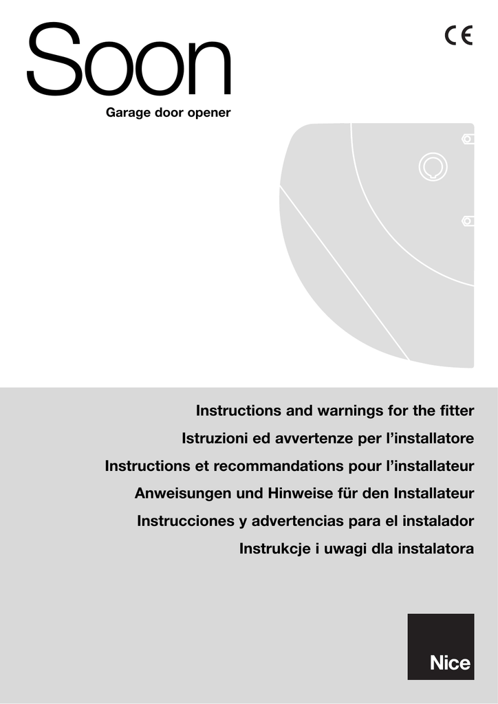 Soon Garage door opener Instructions and warnings for the fitter Istruzioni ed avvertenze per l’installatore Instructions et recommandations pour l’installateur Anweisungen und Hinweise für den Installateur Instrucciones y advertencias para el instalador Instrukcje i uwagi dla instalatora Soon Spis treści Zalecenia dotyczące instalacji i uruchomienia automatyki 1 1.1 Praca w bezpiecznych warunkach Środki ostrożności i ostrzeżenia dotyczące bezpieczeństwa pag. 9 9.1 Zalecenia dotyczące personalizacji działania automatyki Przyciski programujące 92 92 10 10.1 10.2 10.3 10.4 Programowanie Funkcje pierwszego poziomu Programowanie funkcji pierwszego poziomu Funkcje drugiego poziomu Programowanie funkcji drugiego poziomu 92 92 93 93 94 83 83 83 2 2.1 Zapoznanie się z charakterystyką produktu 83 Opis i przeznaczenie produktu, dane techniczne 83 3 3.1 3.2 3.3 Ocena możliwości wykonania instalacji Sprawdzenie elementów produktu Sprawdzenie otoczenia Sprawdzenie ograniczeń eksploatacyjnych produktu 84 84 84 11 11.1 11.2 Przypomnienie o konserwacji Kontrola ilości przeprowadzonych manewrów Zerowanie licznika manewrów 94 95 95 84 12 Historia anomalii 95 4 4.1 4.2 4.3 4.4 Montaż poszczególnych elementów Typowy schemat instalacji Montaż elementów mechanicznych Ułożenie przewodów elektrycznych Ręczne wysprzęglanie i zasprzęglanie 84 84 85 86 86 13 Podłączenie pozostałych urządzeń 95 14 14.1 14.2 Informacje dodatkowe: funkcje specjalne Funkcja “Zawsze otwórz” Funkcja “Wykonaj manewr mimo wszystko” 96 96 96 5 5.1 5.2 5.2.1 5.2.2 5.3 5.4 Wykonanie podłączeń elektrycznych Podłączenie wszystkich urządzeń Podłączenie urządzeń BlueBUS Fotokomórki Fotoczujnik FT210B Podłączenie urządzeń do wejścia STOP Podłączenie zasilania 86 86 88 88 88 88 89 15 Działanie automatyki przy użyciu nadajnika i radioodbiornika typu “SM” 96 Automatyczna kontrola i diagnostyka nieprawidłowego działania 96 Co robić gdy... (Poradnik - rozwiązywanie problemów) 97 6 6.1 Pierwsze uruchomienie instalacji - testy Testy prawidłowego działania 89 89 Utylizacja 97 7 7.1 7.2 Rozpoznawanie urządzeń i pozycji Rozpoznawanie dołączonych urządzeń Rozpoznawanie pozycji 89 89 90 8 8.1 8.2 Końcowy odbiór techniczny instalacji 91 Testy podczas końcowego odbioru technicznego 91 Oddanie do eksploatacji 91 Wstęp Niniejsza instrukcja przedstawia sposoby montażu, programowania i użytkowania siłownika SOON do bram segmentowych. Poszczególne tematy zostały podzielone na trzy części: Część Pierwsza to instrukcja, ilustrująca krok po kroku etapy ˝rzeczywistego˝ montażu produktu oraz jego uruchomienia Część Druga opisuje możliwość personalizacji działania siłownika SOON, poprzez zaprogramowanie funkcji specjalnych, wybór opcji oraz specjalne regulacje. W części tej została omówiona także konserwacja i późniejsza utylizacja produktu. 82 16 17 18 ! Część Pierwsza i Druga instrukcji są skierowane wyłącznie do wykwalifikowanego Personelu Technicznego instalującego. Żadna z zawartych tam informacji nie jest przeznaczona dla końcowego Użytkownika produktu. Zalecenia dotyczące instalacji i uruchomienia automatyki Część Pierwsza opisuje krok po kroku wszystkie etapy montażu automatyki (montaż mechaniczny, podłączenia elektryczne, odbiór techniczny) oraz pierwszego uruchomienia (ustawienia). Etapy te są poprzedzone przez bardzo ważne informacje dotyczące bezpieczeństwa, właściwości produktu i wykonalności instalacji. 1) Praca w bezpiecznych warunkach 1.1) Środki ostrożności i ostrzeżenia dotyczące bezpieczeństwa ! Czynności związane z montażem, programowaniem i uruchomieniem produktu mogą być wykonane wyłącznie przez wykwalifikowany personel techniczny, zgodnie z obowiązującymi przepisami i normami oraz zaleceniami zawartymi w niniejszej instrukcji. Instrukcja została przygotowana tak, by poprowadzić instalatora krok po kroku podczas montażu, programowania i uruchomienia siłownika SOON. Wszystkie czynności, które należy wykonać oraz związane z nimi zalecenia zostały przedstawione w kolejności wykonania poszczególnych etapów pracy. Ważne jest zatem, aby przed przystąpieniem do montażu zapoznać się z wszystkimi rozdziałami instrukcji. Zwracamy szczególną uwagę, na przeczytanie z dużą uwagą rozdziałów, które zawierają podstawowe informacje odnośnie BEZPIECZEŃSTWA, takie jak Rozdział 1, Rozdział 3 - SPRAWDZENIA PRZED MONTAŻEM I OGRANICZENIA EKSPLOATACYJNE oraz Rozdział 8 - ODBIÓR TECHNICZNY I ODDANIE DO EKSPLOATACJI. W związku z możliwością wystąpienia zagrożeń - zarówno podczas montażu, jak i codziennego użytkowania produktu - montaż musi zostać przeprowadzony według Dyrektywy europejskiej nr 98/37/WE (Dyrektywa Maszynowa, określająca wykonanie drzwi lub bram automatycznych), a w szczególności musi odpowiadać normom EN 12445, EN 12453 i EN 12635. Przestrzeganie postanowień Dyrektywy umożliwi Ci wykonanie pracy w maksymalnie bezpiecznych warunkach, pozwalając jednocześnie na wydanie na zakończenie oświadczenia o zgodności, a co za tym idzie, o bezpieczeństwie instalacji. Pamiętaj: Dodatkowe informacje i wytyczne dotyczące analizy ryzyka, które mogłyby okazać się przydane podczas wykonania “Dokumentacji Technicznej” są dostępne na stronie internetowej www.niceforyou.com. • Zabrania się stosowania siłownika SOON w celach innych od wskazanych w niniejszej instrukcji. Niewłaściwe użycie może doprowadzić do uszkodzenia produktu i spowodować zagrożenie dla osób i rzeczy. • Zabrania się wprowadzania modyfikacji w jakimkolwiek elemencie produktu, o ile nie są to zmiany opisane w niniejszej instrukcji. Niedozwolone działania mogą doprowadzić do nieprawidłowego funkcjonowania produktu. Firma Nice® nie bierze odpowiedzialności za szkody spowodowane przez produkt zmodyfikowany na własną rękę. • Przed rozpoczęciem montażu, m