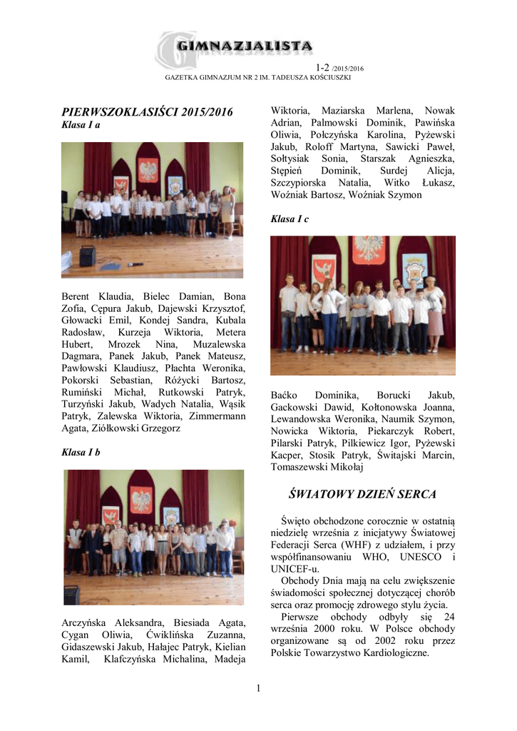1-2 /2015/2016 GAZETKA GIMNAZJUM NR 2 IM. TADEUSZA KOŚCIUSZKI PIERWSZOKLASIŚCI 2015/2016 Wiktoria, Maziarska Marlena, Nowak Adrian, Palmowski Dominik, Pawińska Oliwia, Połczyńska Karolina, Pyżewski Jakub, Roloff Martyna, Sawicki Paweł, Sołtysiak Sonia, Starszak Agnieszka, Stępień Dominik, Surdej Alicja, Szczypiorska Natalia, Witko Łukasz, Woźniak Bartosz, Woźniak Szymon Klasa I a Klasa I c Berent Klaudia, Bielec Damian, Bona Zofia, Cępura Jakub, Dajewski Krzysztof, Głowacki Emil, Kondej Sandra, Kubala Radosław, Kurzeja Wiktoria, Metera Hubert, Mrozek Nina, Muzalewska Dagmara, Panek Jakub, Panek Mateusz, Pawłowski Klaudiusz, Płachta Weronika, Pokorski Sebastian, Różycki Bartosz, Rumiński Michał, Rutkowski Patryk, Turzyński Jakub, Wadych Natalia, Wąsik Patryk, Zalewska Wiktoria, Zimmermann Agata, Ziółkowski Grzegorz Baćko Dominika, Borucki Jakub, Gackowski Dawid, Kołtonowska Joanna, Lewandowska Weronika, Naumik Szymon, Nowicka Wiktoria, Piekarczyk Robert, Pilarski Patryk, Pilkiewicz Igor, Pyżewski Kacper, Stosik Patryk, Świtajski Marcin, Tomaszewski Mikołaj Klasa I b ŚWIATOWY DZIEŃ SERCA Święto obchodzone corocznie w ostatnią niedzielę września z inicjatywy Światowej Federacji Serca (WHF) z udziałem, i przy współfinansowaniu WHO, UNESCO i UNICEF-u. Obchody Dnia mają na celu zwiększenie świadomości społecznej dotyczącej chorób serca oraz promocję zdrowego stylu życia. Pierwsze obchody odbyły się 24 września 2000 roku. W Polsce obchody organizowane są od 2002 roku przez Polskie Towarzystwo Kardiologiczne. Arczyńska Aleksandra, Biesiada Agata, Cygan Oliwia, Ćwiklińska Zuzanna, Gidaszewski Jakub, Hałajec Patryk, Kielian Kamil, Klafczyńska Michalina, Madeja 1 1-2 /2015/2016 GAZETKA GIMNAZJUM NR 2 IM. TADEUSZA KOŚCIUSZKI świętowanie językowej różnorodności w Europie i propagowanie wśród obywateli znajomości większej liczby języków. Wszędzie w Europie odbywają się akcje, które mają zachęcić ludzi do uczenia się nowego języka lub podnosić znajomość języków, które już znają. Uczenie się języków pomaga nie tylko w porozumieniu między ludźmi, ale przyczynia się także do przełamywania barier intelektualnych. ŚWIATOWY DZIEŃ TABLICZKI MNOŻENIA 25 września 2015 r. obchodzony jest już po raz 5. ten dzień. Celem tego święta jest zachęcenie wszystkich do przypomnienia sobie tabliczki mnożenia. WYBORY DO SAMORZĄDU SZKOLNEGO 12 października 2015 r. odbyły się w naszym gimnazjum wybory do Samorządu Szkolnego. W tajnym głosowaniu wyłoniony został zarząd. Oto wyniki: Przewodnicząca - Weronika Petr (99 głosów) Zastępca - Sandra Wiśniewska (49 głosów) Członek zarządu - Wiktoria Galiulin (45 głosów) Rzecznik Praw Ucznia - Paulina Przyłucka (193 głosy) Sekretarz - Kamila Woskowicz EUROPEJSKI DZIEŃ JĘZYKÓW OBCYCH Rok 2001 został ogłoszony przez Radę Europy Europejskim Rokiem Języków. Od tej chwili co roku 26 września obchodzi się Europejski Dzień Języków w 47 krajach członkowskich Rady Europy. Celem Europejskiego Dnia Języków jest 2 1-2 /2015/2016 GAZETKA GIMNAZJUM NR 2 IM. TADEUSZA KOŚCIUSZKI Komisja wyborcza w składzie: Małgorzata Jaros, Kamila Woskowicz, Klaudia Zielińska, Kamil Wegierek, Michał Różański czuwała nad przebiegiem głosowania. 3 1-2 /2015/2016 GAZETKA GIMNAZJUM NR 2 IM. TADEUSZA KOŚCIUSZKI AROMATYCZNE GRUSZKI Klasa III a zachęcała w tym miesiącu do jedzenia gruszek. Zawierają one, jako jedne z nielicznych owoców, jod minerał pozytywnie wpływający na funkcjonowanie tarczycy. Ponadto są skarbnicą boru - minerału poprawiającego pracę mózgu. Dodatkowo gruszki mogą zapobiec udarowi mózgu i rozwojowi nadciśnienia. Z KULTURĄ ZA PAN BRAT Edward Pietkiewicz w swojej pracy „Savoir vivre dla każdego” (Świat Książki, Warszawa 1997) pisze: „Jedni utrzymują, że pierwszy kłania się ten, kto jest lepiej wychowany, inni – że wymiana ukłonów odbywa się jednocześnie, a jeszcze inni formułują pewne reguły. A więc mężczyzna kłania się kobiecie, młodszy – starszemu, pracownik – przełożonemu, idący stojącemu, wchodzący – obecnym, jadący samochodem – idącym pieszo, pojedyncza osoba – grupie, idący schodami w górę – schodzącemu w dół, idący szybciej – idącemu wolniej”. Każdy kto by stosował te zasady konsekwentnie nigdy nie zostanie określony jako źle wychowany. Nie wstydź się – mów dzień dobry! 4 1-2 /2015/2016 GAZETKA GIMNAZJUM NR 2 IM. TADEUSZA KOŚCIUSZKI MOJA ULUBIONA KSIĄŻKA Bieżący rok szkolny został okrzyknięty Rokiem Czytelnictwa, w związku z tym chciałabym przekonać uczniów sceptycznie nastawionych do czytania książek własnymi doświadczeniami w tym zakresie. Rys. Karolina Lipińska Książki mogą rozwijać i kształcić nasze umysły i słownictwo, dlatego chcę przedstawić moją ulubioną książkę, która wiele mnie nauczyła i wciąż wracam do niej myślami. „Złodziejka książek” to bestseller napisany przez Markusa Zusaka i uważam, że nadaje się dla każdego, a zwłaszcza dla osób, które interesują się II wojną światową i tym, jak ludzie sobie wtedy radzili i z jakimi problemami się zmagali. Książka jest nietypowa, ponieważ narratorem jest śmierć przedstawiona jako osoba, która wie wszystko i odczuwa emocje. Główna bohaterka to Liesel Meminger, która podczas podróży do rodziny zastępczej kradnie swoją pierwszą książkę i jest świadkiem śmierci młodszego brata. Dzięki tej książce uczy się czytać i pisać. Dziewczynka poznaje swojego pierwszego przyjaciela, idzie do szkoły, pomaga nowym rodzicom w codziennych rys. Karolina Lipińska 5 1-2 /2015/2016 GAZETKA GIMNAZJUM NR 2 IM. TADEUSZA KOŚCIUSZKI obowiązkach i kradnie następne książki. Jedną podczas palenia wszystkich zakazanych ksiąg, kolejną z domu żony burmistrza, aż w końcu zaczyna sama pisać krótkie opowiadania. Jednak żyje w bardzo trudnych i ni