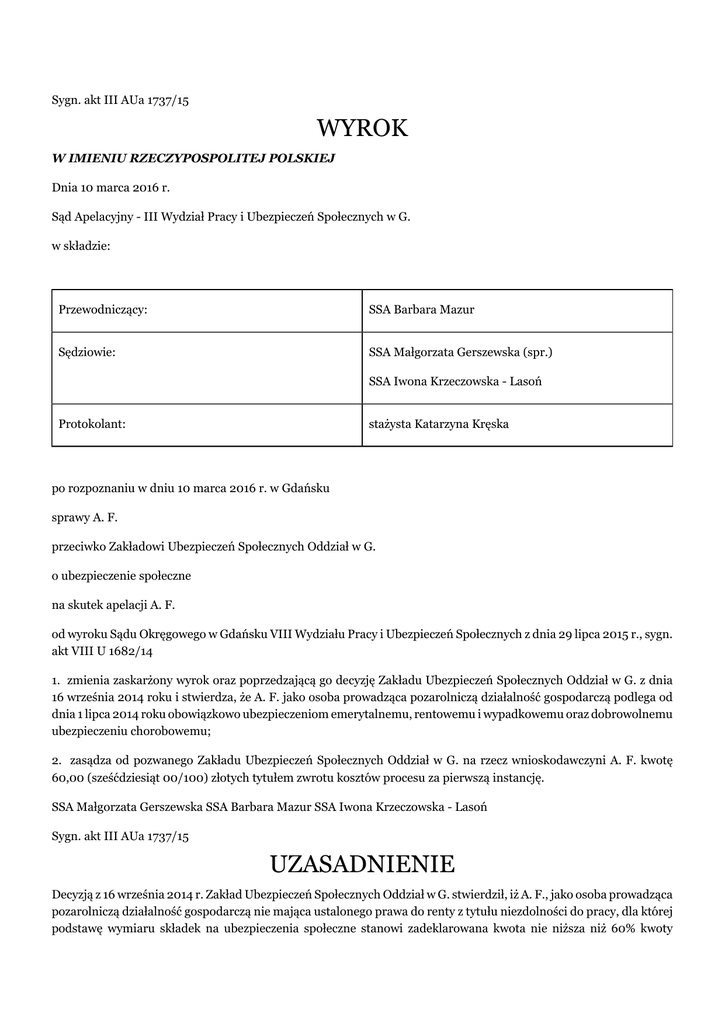 Sygn. akt III AUa 1737/15 WYROK W IMIENIU RZECZYPOSPOLITEJ POLSKIEJ Dnia 10 marca 2016 r. Sąd Apelacyjny - III Wydział Pracy i Ubezpieczeń Społecznych w G. w składzie: Przewodniczący: SSA Barbara Mazur Sędziowie: SSA Małgorzata Gerszewska (spr.) SSA Iwona Krzeczowska - Lasoń Protokolant: stażysta Katarzyna Kręska po rozpoznaniu w dniu 10 marca 2016 r. w Gdańsku sprawy A. F. przeciwko Zakładowi Ubezpieczeń Społecznych Oddział w G. o ubezpieczenie społeczne na skutek apelacji A. F. od wyroku Sądu Okręgowego w Gdańsku VIII Wydziału Pracy i Ubezpieczeń Społecznych z dnia 29 lipca 2015 r., sygn. akt VIII U 1682/14 1. zmienia zaskarżony wyrok oraz poprzedzającą go decyzję Zakładu Ubezpieczeń Społecznych Oddział w G. z dnia 16 września 2014 roku i stwierdza, że A. F. jako osoba prowadząca pozarolniczą działalność gospodarczą podlega od dnia 1 lipca 2014 roku obowiązkowo ubezpieczeniom emerytalnemu, rentowemu i wypadkowemu oraz dobrowolnemu ubezpieczeniu chorobowemu; 2. zasądza od pozwanego Zakładu Ubezpieczeń Społecznych Oddział w G. na rzecz wnioskodawczyni A. F. kwotę 60,00 (sześćdziesiąt 00/100) złotych tytułem zwrotu kosztów procesu za pierwszą instancję. SSA Małgorzata Gerszewska SSA Barbara Mazur SSA Iwona Krzeczowska - Lasoń Sygn. akt III AUa 1737/15 UZASADNIENIE Decyzją z 16 września 2014 r. Zakład Ubezpieczeń Społecznych Oddział w G. stwierdził, iż A. F., jako osoba prowadząca pozarolniczą działalność gospodarczą nie mająca ustalonego prawa do renty z tytułu niezdolności do pracy, dla której podstawę wymiaru składek na ubezpieczenia społeczne stanowi zadeklarowana kwota nie niższa niż 60% kwoty przeciętnego miesięcznego wynagrodzenia, nie podlega obowiązkowo ubezpieczeniom społecznym, tj. emerytalnemu, rentowym, wypadkowemu oraz dobrowolnie chorobowemu od 1 lipca 2014 r. W odwołaniu od powyższej decyzji ubezpieczona wniosła o jej uchylenie, wskazując, iż z dniem 1 lipca 2014 r. rozpoczęła wykonywanie działalności gospodarczej pod firmą (...) i do 28 lipca 2014 r. faktycznie ją wykonywała. W odpowiedzi na odwołanie pozwany wniósł o jego oddalenie. Wyrokiem z dnia 29 lipca 2015 r. Sąd Okręgowy w Gdańsku VIII Wydział Pracy i Ubezpieczeń Społecznych w punkcie 1 oddalił odwołanie i w punkcie 2 zasądził od A. F. na rzecz pozwanego kwotę 60 zł tytułem zwrotu kosztów zastępstwa procesowego, wskazując następujące motywy rozstrzygnięcia: W okresie od 2 listopada 2007 r. do 30 czerwca 2014 r. A. F. (z domu S.) była zatrudniona na podstawie umowy o pracę u D. i T. S. (rodziców), prowadzących działalność gospodarczą pod firmą (...), na stanowisku pracownika biurowego. Od stycznia 2013 r. podstawa wymiaru składek na jej ubezpieczenia społeczne wynosiła kwotę 2.960 zł miesięcznie, przy czym składki na jej ubezpieczenia społeczne nie były przez płatnika składek opłacane począwszy od listopada 2012 r. Ubezpieczona ostatnią miesiączkę miała 8 marca 2014 r. W dniu 13 maja 2014 r. lekarz ginekolog stwierdził u niej 10 tydzień ciąży. Z dniem 1 lipca 2014 r. wnioskodawczyni zarejestrowała pozarolniczą działalność gospodarczą pod firmą (...). Do właściwego rejestru podała, jako przeważającą i wykonywaną działalność gospodarczą (kod (...)) działalność usługową związaną z administracyjną obsługą biura. Z dniem 7 lipca 2014 r. D. i T. S. rozwiązali umowę o pracę z M. N., zatrudnioną na stanowisku spedytora międzynarodowego (na czas określony od 2 listopada 2012 r. do 1 listopada 2014 r.), za porozumieniem stron. Jako przyczynę rozwiązania wskazali likwidację stanowiska pracy. Małżonkowie S. nie zatrudniali innych pracowników. Czynności kierowców międzynarodowych były wykonywane na podstawie umów zlecenia. Dnia 1 lipca 2014 r. ubezpieczona, w ramach zgłoszonej we właściwym rejestrze działalności gospodarczej, spisała z dotychczasowym pracodawcą umowę zlecenia usług z zakresu administracji biurowej i usług spedytora. Następnie w dniu 27 lipca 2014 r. wystawiła rachunek nr (...) za administrację i prowadzenie biura w lipcu 2014 r., na kwotę 4.800 zł. W ewidencji przychodów z działalności gospodarczej ubezpieczonej za lipiec 2014 r. widnieje jeden wpis na kwotę 4.800 zł. Kwota ta odpowiada wartości usługi wykazanej w rachunku nr (...). Według raportu wspomagającego wyliczenie zaliczki miesięcznej na podatek dochodowy przychód ubezpieczonej określony został również na kwotę 4.800 zł Ubezpieczona zgłosiła się do ubezpieczeń społecznych, jako płatnik składek od 1 lipca 2014 r., przy czym od 28 lipca 2014 r. była niezdolna do pracy w związku z ciążą. Za lipiec 2014 r. wnioskodawczyni złożyła w ZUS deklarację rozliczeniową z podstawą wymiaru składek na ubezpieczenia społeczne w kwocie 9.300 zł. W Drugim Urzędzie Skarbowym w G. zarejestrowano zeznanie podatkowe PIT-28 za 2014 r. ubezpieczonej, w którym wskazała ona przychód z tytułu działalności gospodarczej w kwocie 4.800 zł. Za 2014 r. T. S., jako podatnik podatku VAT od 31 grudnia 1995 r., otrzymał zwrot podatku VAT w kwocie 36.226 zł. Z dniem 16 stycznia 2015 r. T. S. zawiesił wykonywanie działalności gospodarczej, w tym działalności w podatku VAT. Przedmiotem sporu pozostawało ustalenie, czy ubezpieczona od 1 lipca 2014 r. prowadziła pozarolniczą działalność gospodarczą oraz podlegała obowiązkowym ubezpieczeniom społecznym i dobrowolnemu ubezpieczeniu chorobowemu z tytułu prowadzenia pozarolniczej działalności gospodarczej. Sąd Okręgowy dokonując analizy zgromadzonego w sprawie materiału dowodowego, przy uwzględnieniu treści przepisów art. 6 ust. 1 pkt 5, art. 13 ust. 4 i art. 11 ust. 2 ustawy z dnia 13 października 1998 r. o systemie ubezpieczeń społecznych oraz art. 2 ustawy z dnia 2 lipca 2004 r. o swobodzie działalności gospodarczej, stanął na stanowisku, że ubezpieczona, ze wzgl