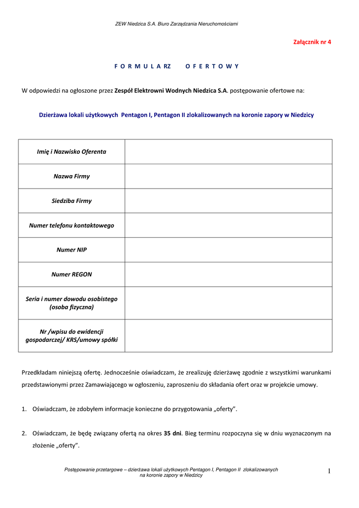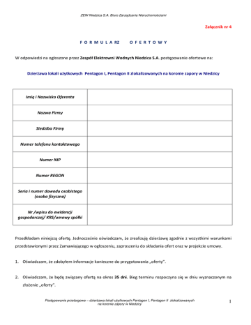 ZEW Niedzica S.A. Biuro Zarządzania Nieruchomościami Załącznik nr 4 F O R M U L A RZ O F E R T O W Y W odpowiedzi na ogłoszone przez Zespół Elektrowni Wodnych Niedzica S.A. postępowanie ofertowe na: Dzierżawa lokali użytkowych Pentagon I, Pentagon II zlokalizowanych na koronie zapory w Niedzicy Imię i Nazwisko Oferenta Nazwa Firmy Siedziba Firmy Numer telefonu kontaktowego Numer NIP Numer REGON Seria i numer dowodu osobistego (osoba fizyczna) Nr /wpisu do ewidencji gospodarczej/ KRS/umowy spółki Przedkładam niniejszą ofertę. Jednocześnie oświadczam, że zrealizuję dzierżawę zgodnie z wszystkimi warunkami przedstawionymi przez Zamawiającego w ogłoszeniu, zaproszeniu do składania ofert oraz w projekcie umowy. 1. Oświadczam, że zdobyłem informacje konieczne do przygotowania „oferty”. 2. Oświadczam, że będę związany ofertą na okres 35 dni. Bieg terminu rozpoczyna się w dniu wyznaczonym na złożenie „oferty”. Postępowanie przetargowe – dzierżawa lokali użytkowych Pentagon I, Pentagon II zlokalizowanych na koronie zapory w Niedzicy 1 ZEW Niedzica S.A. Biuro Zarządzania Nieruchomościami 3. Oświadczam, że w lokalu prowadzona będzie działalność w zakresie: ………………………………………………………………………………………………………………………...…………………...……………………. ………………………………………………………………………………………….……………………………….………………………..……...……… …………………………………………...………………………………………………………….…………………………………………………………... 4. Oświadczam, że na przedmiocie dzierżawy nie będę dokonywał żadnych przeróbek, zmian, dobudowywał dodatkowych pomieszczeń, bez wcześniejszego uzgodnienia z Zamawiającym. 5. Oświadczam, że prowadzę działalność gospodarczą na podstawie aktualnego wpisu do ewidencji działalności gospodarczej oraz posiadam wszelkie wymagane zezwolenia lub koncesje na prowadzenie działalności gospodarczej jeśli wymagają tego odrębne przepisy. 6. Oświadczam, że nie będę prowadzić reklamy usług konkurencyjnych w stosunku do usług Zamawiającego. 7. Proponuję miesięczny czynsz w kwocie: 7.1. dla Pentagonu I -X netto: ……………………………………. złotych / miesięcznie (słownie: …………………………………...............................................………………………………….. złotych) 7.2. dla Pentagonu II -X netto: ……………………………….……. złotych / miesięcznie (słownie: …………………………………...............................................………………………………….. złotych) X/ - właściwe zakreślić i wypełnić 8. Przyjęłam / przyjąłem do wiadomości, że w roku 2016, 2017, 2018, 2019, 2020 miesięczny czynsz ulegnie rewaloryzowacji o wielkość średniorocznego wskaźnika wzrostu cen towarów i usług konsumpcyjnych ogółem ogłoszonego w Komunikacje Prezesa GUS, oraz o wielkość stawki podatku od nieruchomości zgodnie z Postępowanie przetargowe – dzierżawa lokali użytkowych Pentagon I, Pentagon II zlokalizowanych na koronie zapory w Niedzicy 2 ZEW Niedzica S.A. Biuro Zarządzania Nieruchomościami Uchwałą Gminy Łapsze Niżne, jak również zmian wartości środków trwałych na skutek ich przeszacowania, doposażenia lub dokonania przez Zamawiającego nakładów podwyższających wartość tych środków. 9. Oświadczam, że akceptuję podane na dzień składania oferty stawki kosztów eksploatacyjnych wyznaczone przez Zamawiającego, oraz przyjmuję do wiadomości że mogą one ulec zmianie. 10. Oświadczam, że podpiszę stosowne umowy na wywóz śmieci i nieczystości oraz dostawę energii elektrycznej i dostarczę je Zamawiającemu 14 dni od daty podpisania umowy. 11. Oświadczam, że wyrażam zgodę na przetwarzanie danych osobowych* 12. Oświadczam, że przedstawię Zamawiającemu polisę ubezpieczeniową w dniu rozpoczęcia działalności, pod rygorem rozwiązania umowy ze skutkiem natychmiastowym. 13. Zobowiązuję się, że będę dzierżawiła/dzierżawił lokale użytkowe w okresie od 15 kwietnia 2015 do 31 października 2020 14. Oświadczam, że dokonałam / dokonałem wpłaty wadium. 15. W przypadku uznania mojej oferty za odpowiadającą Zamawiającemu deklaruję wniesienie kaucji gwarancyjnej w kwocie miesięcznego czynszu brutto obowiązującego w sezonie za każdy lokal użytkowy najpóźniej w dniu przekazania lokali użytkowych protokołem zdawczo – odbiorczym. 16. Po zapoznaniu się z projektem umowy/umów oświadczam, że akceptuję jej/ich treść bez uwag. …………………. dnia ………………… 2015 roku …………….………………………………………… (czytelny podpis Oferenta) (pieczęć – podpis osób upoważnionych do reprezentowania Oferenta w obrocie prawnym) Postępowanie przetargowe – dzierżawa lokali użytkowych Pentagon I, Pentagon II zlokalizowanych na koronie zapory w Niedzicy 3 ZEW Niedzica S.A. Biuro Zarządzania Nieruchomościami * 1. Informujemy, że Administratorem zebranych danych osobowych jest Zespół Elektrowni Wodnych Niedzica Spółka Akcyjna, ul. Widokowa 1, 34 – 441 Niedzica. 2. Dane te będą przetwarzane zgodnie z ustawą z dnia 29 sierpnia 1997 roku, o ochronie danych osobowych (Dz. U. z 2002 r, Nr 101, poz. 926 ze zm.) w celu realizacji postępowania przetargowego, zakomunikowania oferentom wyniku postępowania przetargowego, umieszczenia informacji o wynikach postępowania na tablicy ogłoszeń, stronie internetowej Zamawiającego i oraz zawarcia umowy w przypadku wyboru oferty. 3. Dane będą udostępnione jedynie uprawnionym podmiotom jeżeli to uprawnienie wynika z obowiązującego przepisu prawa. 4. Osoba, któr