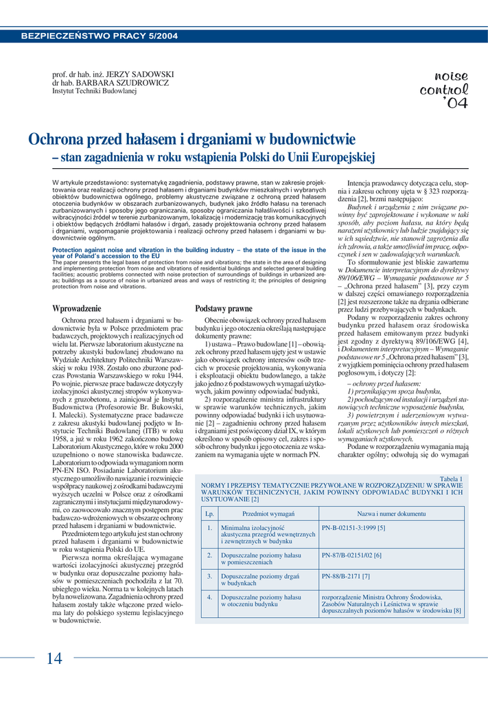 BEZPIECZEŃSTWO PRACY 5/2004 prof. dr hab. inż. JERZY SADOWSKI dr hab. BARBARA SZUDROWICZ Instytut Techniki Budowlanej Ochrona przed hałasem i drganiami w budownictwie – stan zagadnienia w roku wstąpienia Polski do Unii Europejskiej W artykule przedstawiono: systematykę zagadnienia, podstawy prawne, stan w zakresie projektowania oraz realizacji ochrony przed hałasem i drganiami budynków mieszkalnych i wybranych obiektów budownictwa ogólnego, problemy akustyczne związane z ochroną przed hałasem otoczenia budynków w obszarach zurbanizowanych, budynek jako źródło hałasu na terenach zurbanizowanych i sposoby jego ograniczania, sposoby ograniczania hałaśliwości i szkodliwej wibracyjności źródeł w terenie zurbanizowanym, lokalizację i modernizację tras komunikacyjnych i obiektów będących źródłami hałasów i drgań, zasady projektowania ochrony przed hałasem i drganiami, wspomaganie projektowania i realizacji ochrony przed hałasem i drganiami w budownictwie ogólnym. Protection against noise and vibration in the building industry – the state of the issue in the year of Poland’s accession to the EU The paper presents the legal bases of protection from noise and vibrations; the state in the area of designing and implementing protection from noise and vibrations of residential buildings and selected general building facilities; acoustic problems connected with noise protection of surroundings of buildings in urbanized areas; buildings as a source of noise in urbanized areas and ways of restricting it; the principles of designing protection from noise and vibrations. Wprowadzenie Podstawy prawne Ochrona przed hałasem i drganiami w budownictwie była w Polsce przedmiotem prac badawczych, projektowych i realizacyjnych od wielu lat. Pierwsze laboratorium akustyczne na potrzeby akustyki budowlanej zbudowano na Wydziale Architektury Politechniki Warszawskiej w roku 1938. Zostało ono zburzone podczas Powstania Warszawskiego w roku 1944. Po wojnie, pierwsze prace badawcze dotyczyły izolacyjności akustycznej stropów wykonywanych z gruzobetonu, a zainicjował je Instytut Budownictwa (Profesorowie Br. Bukowski, I. Malecki). Systematyczne prace badawcze z zakresu akustyki budowlanej podjęto w Instytucie Techniki Budowlanej (ITB) w roku 1958, a już w roku 1962 zakończono budowę Laboratorium Akustycznego, które w roku 2000 uzupełniono o nowe stanowiska badawcze. Laboratorium to odpowiada wymaganiom norm PN-EN ISO. Posiadanie Laboratorium akustycznego umożliwiło nawiązanie i rozwinięcie współpracy naukowej z ośrodkami badawczymi wyższych uczelni w Polsce oraz z ośrodkami zagranicznymi i instytucjami międzynarodowymi, co zaowocowało znacznym postępem prac badawczo-wdrożeniowych w obszarze ochrony przed hałasem i drganiami w budownictwie. Przedmiotem tego artykułu jest stan ochrony przed hałasem i drganiami w budownictwie w roku wstąpienia Polski do UE. Pierwsza norma określająca wymagane wartości izolacyjności akustycznej przegród w budynku oraz dopuszczalne poziomy hałasów w pomieszczeniach pochodziła z lat 70. ubiegłego wieku. Norma ta w kolejnych latach była nowelizowana. Zagadnienia ochrony przed hałasem zostały także włączone przed wieloma laty do polskiego systemu legislacyjnego w budownictwie. Obecnie obowiązek ochrony przed hałasem budynku i jego otoczenia określają następujące dokumenty prawne: 1) ustawa – Prawo budowlane [1] – obowiązek ochrony przed hałasem ujęty jest w ustawie jako obowiązek ochrony interesów osób trzecich w procesie projektowania, wykonywania i eksploatacji obiektu budowlanego, a także jako jedno z 6 podstawowych wymagań użytkowych, jakim powinny odpowiadać budynki, 2) rozporządzenie ministra infrastruktury w sprawie warunków technicznych, jakim powinny odpowiadać budynki i ich usytuowanie [2] – zagadnieniu ochrony przed hałasem i drganiami jest poświęcony dział IX, w którym określono w sposób opisowy cel, zakres i sposób ochrony budynku i jego otoczenia ze wskazaniem na wymagania ujęte w normach PN. 14 Intencja prawodawcy dotycząca celu, stopnia i zakresu ochrony ujęta w § 323 rozporządzenia [2], brzmi następująco: Budynek i urządzenia z nim związane powinny być zaprojektowane i wykonane w taki sposób, aby poziom hałasu, na który będą narażeni użytkownicy lub ludzie znajdujący się w ich sąsiedztwie, nie stanowił zagrożenia dla ich zdrowia, a także umożliwiał im pracę, odpoczynek i sen w zadowalających warunkach. To sformułowanie jest bliskie zawartemu w Dokumencie interpretacyjnym do dyrektywy 89/106/EWG – Wymaganie podstawowe nr 5 – „Ochrona przed hałasem” [3], przy czym w dalszej części omawianego rozporządzenia [2] jest rozszerzone także na drgania odbierane przez ludzi przebywających w budynkach. Podany w rozporządzeniu zakres ochrony budynku przed hałasem oraz środowiska przed hałasem emitowanym przez budynki jest zgodny z dyrektywą 89/106/EWG [4], i Dokumentem interpretacyjnym – Wymaganie podstawowe nr 5 „Ochrona przed hałasem” [3], z wyjątkiem pominięcia ochrony przed hałasem pogłosowym, i dotyczy [2]: – ochrony przed hałasem: 1) przenikającym spoza budynku, 2) pochodzącym od instalacji i urządzeń stanowiących techniczne wyposażenie budynku, 3) powietrznym i uderzeniowym wytwarzanym przez użytkowników innych mieszkań, lokali użytkowych lub pomieszczeń o różnych wymaganiach użytkowych. Podane w rozporządzeniu wymagania mają charakter ogólny; odwołują się do wymagań Tabela 1 NORMY I PRZEPISY TEMATYCZNIE PRZYWOŁANE W ROZPORZĄDZENIU W SPRAWIE WARUNKÓW TECHNICZNYCH, JAKIM POWINNY ODPOWIADAĆ BUDYNKI I ICH USYTUOWANIE [2] Lp. Przedmiot wymagań Nazwa i numer dokumentu 1. Minimalna izolacyjność PN-B-02151-3:1999 [5] akustyczna przegród wewnętrznych i zewnętrznych w budynku 2. Dopuszczalne poziomy hałasu w pomieszczeniach PN-87/B-02151/02 [6] 3. Dopuszczalne poziomy drgań w budyn