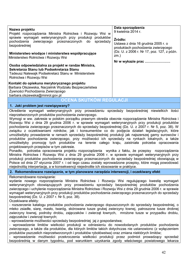 Data sporządzenia Nazwa projektu 9 kwietnia 2014 r. Projekt rozporządzenia Ministra Rolnictwa i Rozwoju Wsi w sprawie wymagań weterynaryjnych przy produkcji produktów Źródło: pochodzenia zwierzęcego przeznaczonych do sprzedaży Ustawa z dnia 16 grudnia 2005 r. o bezpośredniej produktach pochodzenia zwierzęcego (Dz. U. z 2006 r. Nr 17, poz. 127, z późn. Ministerstwo wiodące i ministerstwa współpracujące zm.) Ministerstwo Rolnictwa i Rozwoju Wsi Nr w wykazie prac …………………. Osoba odpowiedzialna za projekt w randze Ministra, Sekretarza Stanu lub Podsekretarza Stanu Tadeusz Nalewajk Podsekretarz Stanu w Ministerstwie Rolnictwa i Rozwoju Wsi Kontakt do opiekuna merytorycznego projektu Barbara Olszewska, Naczelnik Wydziału Bezpieczeństwa Żywności Pochodzenia Zwierzęcego [email protected] OCENA SKUTKÓW REGULACJI 1. Jaki problem jest rozwiązywany? Określenie wymagań weterynaryjnych przy prowadzeniu sprzedaży bezpośredniej niewielkich ilości nieprzetworzonych produktów pochodzenia zwierzęcego. Wymogi w ww. zakresie w polskim porządku prawnym określa obecnie rozporządzenie Ministra Rolnictwa i Rozwoju Wsi z dnia 29 grudnia 2006 r. w sprawie wymagań weterynaryjnych przy produkcji produktów pochodzenia zwierzęcego przeznaczonych do sprzedaży bezpośredniej (Dz. U. z 2007 r. Nr 5, poz. 38). W związku z oczekiwaniami rolników, jak i konsumentów co do podjęcia działań legislacyjnych, które umożliwiłyby prowadzenie w ramach sprzedaży bezpośredniej produkcji jak najszerszej gamy surowców i produktów pochodzenia zwierzęcego, przy możliwości ich sprzedaży na rynkach lokalnych, a także umożliwiłyby promocję tych produktów na terenie całego kraju, zaistniała potrzeba opracowania projektowanych przepisów w tym zakresie. Ponadto, potrzeba opracowania projektu rozporządzenia wynika z faktu, że przepisy rozporządzenia Ministra Rolnictwa i Rozwoju Wsi z dnia 29 grudnia 2006 r. w sprawie wymagań weterynaryjnych przy produkcji produktów pochodzenia zwierzęcego przeznaczonych do sprzedaży bezpośredniej obowiązują w Polsce od dnia 27 stycznia 2007 r. i od tego czasu zostały wprowadzone przepisy, które mogą powodować niejednolitą interpertację, a w konsekwencji niejednolite ich stosowanie w praktyce. 2. Rekomendowane rozwiązanie, w tym planowane narzędzia interwencji, i oczekiwany efekt Rekomendowane rozwiązanie: wydanie nowego rozporządzenia Ministra Rolnictwa i Rozwoju Wsi regulującego kwestię wymagań weterynaryjnych obowiązujących przy prowadzeniu sprzedaży bezpośredniej produktów pochodzenia zwierzęcego i uchylenie rozporządzenia Ministra Rolnictwa i Rozwoju Wsi z dnia 29 grudnia 2006 r. w sprawie wymagań weterynaryjnych przy produkcji produktów pochodzenia zwierzęcego przeznaczonych do sprzedaży bezpośredniej (Dz. U. z 2007 r. Nr 5, poz. 38). Oczekiwane efekty: - rozszerzenie katalogu produktów pochodzenia zwierzęcego dopuszczonych do sprzedaży bezpośredniej, o mleko zsiadłe, siarę, masło, twaróg, skórowane tusze grubej zwierzyny łownej, patroszone tusze drobnej zwierzyny łownej, podroby drobiu, zajęczaków i zwierząt łownych, mrożone tusze w przypadku drobiu, zajęczaków i zwierząt łownych; - wprowadzenie możliwości sprzedaży bezpośredniej jaj z gospodarstwa; - wprowadzenie limitów wielkości produkcji w odniesieniu do nowododanych produktów pochodzenia zwierzęcego, a także dla produktów, dla których limitów takich dotychczas nie ustanowiono (z wyłączeniem produktów pszczelich nieprzetworzonych i produktów rybołówstwa) oraz zmiana niektórych limitów; - wprowadzenie możliwości przekroczenia wielkości produkcji przez podmiot prowadzący sprzedaż bezpośrednią w danym tygodniu, pod warunkiem uzyskania zgody właściwego powiatowego lekarza 42 weterynarii; - określenie minimalnych wymagań higienicznych dla sprzedaży żywności pochodzenia zwierzęcego z obiektów lub urządzeń ruchomych lub tymczasowych, w tym urządzeń dystrybucyjnych do sprzedaży żywności (np. mlekomatów); - zniesienie, pod pewnymi warunkami, ograniczenia dotyczącego obszaru sprzedaży bezpośredniej w przypadku sprzedaży podczas imprez okolicznościowych w szczególności wystaw, festynów, targów oraz kiermaszy organizowanych w celu promocji tych produktów; - określenie minimalnych wymagań jakie powinna spełniać woda używana przy produkcji i sprzedaży bezpośredniej, w tym lód używany przy produkcji produktów rybołówstwa; - wprowadzenie wymogu prowadzenia podstawowej dokumentacji przez podmiot prowadzący sprzedaż bezpośrednią, dotyczącej ilości sprzedanych produktów oraz wyników wszelkich badań i analiz próbek pobranych z produktów; - wprowadzenie dodatkowego wymogu, aby jaja były dostarczane konsumentom końcowym w terminie nie później niż 21 dni od dnia ich zniesienia; - uproszczenie i usystematyzowanie brzmienia przepisów i poprawa ich czytelności. 3. Jak problem został rozwiązany w innych krajach, w szczególności krajach członkowskich OECD/UE? Zgodnie z art. 1 ust. 4 rozporządzenia (WE) nr 853/2004 Parlamentu Europejskiego i Rady z dnia 29 kwietnia 2004 r. ustanawiającego szczególne przepisy dotyczące higieny w odniesieniu do żywności pochodzenia zwierzęcego (Dz. Urz. UE L 139 z 30.04.2004, str. 55, z późn. zm.; Dz. Urz. UE Polskie wydanie specjalne, rozdz. 3, t. 45, str. 14) państwa członkowskie Unii Europejskiej powinny ustanowić, zgodnie z ich prawem krajowym, przepisy regulujące kwestie działalności oraz osób, o których mowa w ust. 3 lit. c) d) i e) ( tj. bezpośrednich dostaw małych ilości surowców pochodzenia zwierzęcego, mięsa z drobiu i zajęczaków poddanych ubojowi w gospodarstwie rolnym, zwierzyny łownej lub mięsa zwierząt łownych, dostarczanych konsumentom końcowym lub do zakładów prowadzących handel detaliczny z przeznaczeniem dla konsumenta końcowego). Przedmiotowe przepisy krajowe mają zapewniać osią
