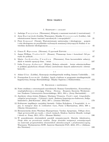 Spis treści I. Rozprawy i analizy 1. Jadwiga P u z y n i n a (Warszawa), Kłopoty z nazwami wartości (i wartościami) 2. Jerzy B a r t m i ń s k i (Lublin/Warszawa), Monika G r z e s z c z a k (Lublin), Jak rekonstruować kanon wartości narodowych i europejskich? . . . . . . . . . . . . . . . . . . . . . 3. Piotr Z e m s z a ł (Toruń), Wartościowanie uniwersalne i ideologiczne – pojęcie i rola ideologemu na przykładzie wybranych nominacji dotyczących Stalina w sowieckim dyskursie ideologicznym . . . . . . . . . . . . . . . . . . . . . . . . . . . . . . . . . . . . . . . . . . . . . . 7 21 45 * 4. Ольга Е. Ф р о л о в а (Москва), О русской Европе . . . . . . . . . . . . . . . . . . . . . . . . . . 57 5. James William U n d e r h i l l (Rouen), Tłumacząc home i homeland . Od poetyki do polityki. . . . . . . . . . . . . . . . . . . . . . . . . . . . . . . . . . . . . . . . . . . . . . . . . . . . . . . . . . . . . . . 87 6. Marta J a c k o w s k a - U w a d i z u (Warszawa), Dom koczowników saharyjskich w świetle opozycji dom / świat . . . . . . . . . . . . . . . . . . . . . . . . . . . . . . . . . . . . . . . . . . 107 7. Lidia N e p o p - A j d a c z y ć (Kijów), Relacje człowiek – kwiat odzwierciedlone w polskim językowym obrazie świata (zestawienie danych ankietowych i słownikowych) . . . . . . . . . . . . . . . . . . . . . . . . . . . . . . . . . . . . . . . . . . . . . . . . . . . . . . . . . . . . . . . . . . . . . . . 129 ** 8. Adam G ł a z (Lublin), Koncepcja etnolingwistyki według Jamesa Underhilla . . 141 9. Przemysław Ł o z o w s k i (Lublin), Język a kultura w programie etnolingwistyki kognitywnej Jerzego Bartmińskiego. Między Sapirem a Malinowskim . . . . . . . . . . . 155 II. Recenzje i omówienia 10. Nowe studium o stereotypach narodowych: Roman Gawarkiewicz, Komunikacja międzykulturowa a stereotypy. Polacy – Niemcy – Rosjanie, Szczecin: Wydawnictwo Naukowe Uniwersytetu Szczecińskiego, 2011, 384 s. (Jerzy Bartmiński) . . . . 11. Językowy obraz świata Bułgara: Marijana Vitanova, Čovek i svjat. Lingvokulturologični proučvanija / Człowiek i świat. Badania lingwistyczno-kulturowe, Sofija: Izdatelstvo „Bul-Korenin”, 2012, 207 s. (Joanna Mleczko) . . . . . . . . . . . . . . . . . . . . . . 12. Kulturowe implikacje rosyjskiej biesiady: Galina Kabakova, L’hospitalité, le repas, le mangeur dans la civilisation russe, Paris: L’Hartmattan, 2013, 308 s. (Maciej Abramowicz). . . . . . . . . . . . . . . . . . . . . . . . . . . . . . . . . . . . . . . . . . . . . . . . . . . . . . . . . . 13. Hermeneutyka słowa Wardana Hajrapetiana: Vardan Ajrapetjan, Tolkuja slovo. Opyt germenevtiki po-russki, v dvuch častjach, Moskva: Institut filosofii, teologii i istorii sv. Fomy, 2011, 672 s. (Roman Shubin) . . . . . . . . . . . . . . . . . . . . . . . . . . . . . . . . 14. W poszukiwaniu słowiańskich paraleli semantycznych: Mariola Jakubowicz, Drogi słów na przestrzeni wieków. Zarys słownika motywacji semantycznych na materiale przymiotników słowiańskich odziedziczonych z prasłowiańszczyzny, Warszawa: Wydawnictwo SOW, Instytut Slawistyki PAN, 2010, 375 s. (Aleksandra Niewiara) . . . . . . . . . . . . . . . . . . . . . . . . . . . . . . . . . . . . . . . . . . . . . . . . . . . . . . . . . . . . . . . . . 177 179 183 186 189 6 Spis treści 15. Nowy Kolberg: czwarta odsłona – lubelska: Polska pieśń i muzyka ludowa. Źródła i materiały, t. 4: Lubelskie, przygotował zespół pod kier. naukowym Jerzego Bartmińskiego, Lublin: Wydawnictwo Muzyczne „Polihymnia”, 2011. Cz. I: Pieśni i obrzędy doroczne, 538 s., nuty, mapy, płyta. Cz. II: Pieśni i obrzędy rodzinne, 756 s., nuty, 2 płyty. Cz. III: Pieśni i teksty sytuacyjne, 681 s., nuty, płyta. Cz. IV: Pieśni powszechne, 716 s., nuty, płyta. Cz. V: Pieśni stanowe i zawodowe, 498 s., nuty, płyta. Cz. VI: Muzyka instrumentalna, 373 s., nuty, 2 płyty. (Zbigniew Jerzy Przerembski) . . . . . . . . . . . . . . . . . . . . . . . . . . . . . . . . . . . . . . . . . . . . . . . . . . . . . . . . . . . . . . . . . . 16. Gwarowe słownictwo temporalne: Władysław Kupiszewski, Wybrane nazwy temporalne w gwarach polskich, [seria:] Z Prac Towarzystwa Kultury Języka, t. 9, Warszawa: Wydawnictwo BEL Studio, 2012, 146 s. + mapy (Joanna Szadura) . 17. O specyfice języka i kultury Łotyszy Łatgalii: Latgales lingvoteritoriālā vārdnı̄ca. 2 sējumos / Лингвотерриториальный словарь Латгалии. В 2 томах / Latgolys lingvoteritorialuo vuordneica. 2 siejumūs / Lingvoterritorial dictionary of Latgale. 2 volumes, Rēzekne: Rēzeknes Augstsskola, 2012, 875 s. (Robert Zawisza) 18. Trójkąt magiczny: słowo, przedmiot, akcja: Olga Solar, Mova magiï – magìja movy. Simvolìka ukraïns’kih zamovljan’, Przemyśl: Państwowa Wyższa Szkoła Wschodnioeuropejska, 2011, 301 s. (Olga Maciupa) . . . . . . . . . . . . . . . . . . . . . . . . . . . . 192 198 200 203 III. Z życia naukowego 19. Светлана М. Толстая, Памяти академика Никиты Ильича Толстого . . . . . . . . 20. Ольга В. Трефилова, Конференция XVII Толстовские чтения в Ясной Поляне (13–16 V 2013) . . . . . . . . . . . . . . . . . . . . . . . . . . . . . . . . . . . . . . . . . . . . . . . . . . . . . . . 21. Алла Кожинова, Этнолингвистика на XV Международнom конгрессe славистов в Минске (20–27 VIII 2013) . . . . . . . . . . . . . . . . . . . . . . . . . . . . . . . . . . . . . . . . . . . . . 22. Алла Кожинова, Международная конференция «Славянская духовная культура: этнолингвистические и филологические исследования» (Вена, 11–13 XII 2013) . . . . . . . . . . . . . . . . .