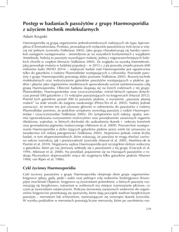 Postęp w badaniach pasożytów z grupy Haemosporidia z użyciem technik molekularnych Adam Krupski Haemosporidia są grupą organizmów jednokomórkowych należących do typu Apicomplexa (Chromalveolata, Protista), prowadzących wyłącznie pasożytniczy tryb życia w więcej niż jednym żywicielu (Valkiūnas 2005). Jako grupa charakteryzują się bardzo szerokim zasięgiem występowania – stwierdzono je na wszystkich kontynentach z wyjątkiem Antarktydy. Należą tu pasożyty wywołujące malarię, jedną z najpowszechniejszych ludzkich chorób w ciepłym klimacie (Valkiūnas 2005). Ze względu na wysoką śmiertelność, jaką powoduje malaria w ludzkiej populacji – w 2013 r. z jej powodu zmarło prawie 600 milionów ludzi (WHO 2014) – większość badań nad Haemosporidia jest ograniczona tylko do gatunków z rodziny Plasmodiidae występujących u człowieka. Pozostałe pasożyty z grupy Haemosporidia pozostają słabo poznane (Valkiūnas 2005). Rozwój technik molekularnych oraz wykorzystanie gatunków pasożytów występujących u ptaków, gadów i płazów jako organizmów modelowych spowodowały wzrost zainteresowania całą grupą Haemosporidia. Obecnie badania skupiają się na trzech rodzinach z tej grupy: Plasmodiidae, Haemoproteidae oraz Leucocytozoidae, wśród których opisano dotychczas ponad 500 gatunków z 15 rodzajów pasożytujących na kręgowcach (Marzal 2012). Pośród tych gatunków ponad 200 to pasożyty ptaków, a wyrażenie „pasożyty ptasiej malarii” na stałe weszło do żargonu naukowego (Pérez-Tris et al. 2005). Należy jednak zaznaczyć, że termin ten jest używany głównie w odniesieniu do pasożytów z rodziny Plasmodiidae pomimo, że podobne symptomy wywołują pasożyty z rodzin Haemoproteidae i Leucocytozoidae (Valkiūnas 2005). Do symptomów tych należą: apatia, anemia (spowodowana rozrywaniem erytrocytów) oraz powiększenie zarażonych organów (śledziona, wątroba), w których dochodzi do uszkodzenia tkanek i nekrozy komórek oraz gromadzenia pigmentu malarycznego (Atkinson et al. 2009). Powszechne występowanie Haemosporidia u dziko żyjących gatunków ptaków przez wiele lat uznawano za świadectwo ich niskiej patogenności (Valkiūnas 2005). Stopniowo jednak rośnie liczba badań, w tym eksperymentalnych, które wskazują, że pasożyty te mogą obniżać zarówno sukces rozrodczy, jak i przeżywalność żywiciela (Marzal et al. 2005, Martínez-de la Puente et al. 2010). Negatywny wpływ Haemosporidia jest szczególnie dobrze widoczny u gatunków, które po raz pierwszy zetknęły się z pasożytami z tej grupy (Graczyk et al. 1994, Atkinson et al. 2000). Na przykład, pojawienie się na Hawajach pasożytów z rodzaju Plasmodium doprowadziło wręcz do wyginięcia kilku gatunków ptaków (Warner 1968, van Riper et al. 1986). Cykl życiowy Haemosporidia Cykl życiowy pasożytów z grupy Haemosporidia obejmuje dwie grupy organizmów: kręgowce (płazy, gady, ptaki i ssaki) oraz pełniące rolę wektorów bezkręgowce (krwiopijne muchówki Diptera). Kręgowce są żywicielami pośrednimi, u których pasożyty rozmnażają się bezpłciowo, natomiast w wektorach ma miejsce rozmnażanie płciowe, co czyni je żywicielami ostatecznymi. Podczas żerowania zarażonych wektorów do organizmów kręgowców przedostają się sporozoity, które dają początek stadiom bezpłciowym pasożyta – merontom lub schizontom, namnażającym się wewnątrz tkanek żywiciela. W wyniku podziałów w merontach powstają liczne merozoity, które po uwolnieniu roz239 Tabela 1. Różnice w cyklu życiowym pasożytów z grupy Haemosporidia Table 1. Differences in life cycle of haemosporidians. (1) – genus, (2) – vector, (3) – merogony inside erythrocytes (+ yes, – no), (5) – place of meronts occurrence, (6) – lungs, (7) – liver, (8) - spleen, (9) – skeletal muscles Wektor (2) Haemoproteus kuczmanowate Ceratopogonidae, narzępikowate Hippoboscidae – Merogonia wewnątrz erytrocytów (4) Miejsce występowania płuca (najczęściej) merontów (5) (6), wątroba (7), śledziona (8), mięśnie szkieletowe (9) Rodzaj (1) Plasmodium komarowate Culicidae Leucocytozoon meszkowate Simuliidae + – śledziona (najczęściej) wątroba (najczęściej) przestrzeniają się po organizmie żywiciela. Kolejne merozoity kontynuują namnażanie lub rozpoczynają rozwój stadiów płciowych (gametocytów) w erytrocytach. Gametocyty przedostają się do organizmu wektora podczas jego żerowania na zarażonym żywicielu pośrednim, a następnie rozpoczynają gametogenezę w jelicie środkowym. Następuje zapłodnienie, a utworzona zygota przekształca się w ookinetę, która przenika do nabłonka jelita środkowego. Ookineta rozwija się w oocystę, w której rozpoczyna się proces sporogonii. Polega on na tworzeniu się licznych form jednojądrowych – sporozoitów. Wraz z dojrzeniem oocysty sporozoity są uwalniane i wnikają do ślinianek wektora, gotowe do zarażenia kręgowców. Przed pobraniem pokarmu wektor wstrzykuje do organizmu gospodarza wydzieliny ślinianek zapobiegające krzepnięciu krwi. Razem z tymi wydzielinami do krwioobiegu kręgowca przedostają się sporozoity pasożytów i rozpoczyna się kolejny cykl życiowy w żywicielu pośrednim. Mimo wielu wspólnych cech, pomiędzy cyklami rozwojowymi pasożytów z rodzajów Haemoproteus, Plasmodium i Leucocytozoon występują znaczące różnice, w tym dotyczące rodzaju wektorów oraz zachodzenia merogonii w erytrocytach (tab. 1). Techniki molekularne a tradycyjna mikroskopia świetlna W ciągu ostatnich kilkunastu lat opisano kilka metod oceny zarażenia pasożytami z grupy Haemosporidia przy wykorzystaniu technik molekularnych. Do oceny statusu zarażenia wykorzystuje się reakcję łańcuchową polimerazy (PCR) lub reakcję łańcuchową polimerazy w czasie rzeczywistym, tzw. ilościowy PCR (ang. quantitative PCR; qPCR). Większość protokołów wykorzystuje namnażanie DNA mitochondrial