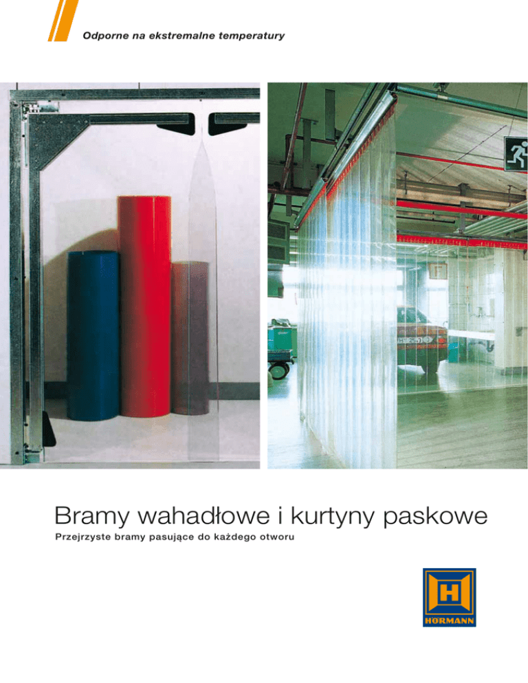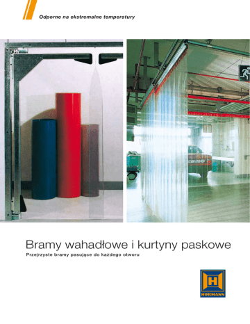Odporne na ekstremalne temperatury Bramy wahadłowe i kurtyny paskowe Przejrzyste bramy pasujące do każdego otworu PFT Bramy wahadłowe Elastyczne rozwiązanie Elastyczne rozwiązanie Bramy wahadłowe firmy Hörmann są przeznaczone do zastosowania wewnątrz budynków, dla normalnego natężenia ruchu wózków widłowych. Dla ułatwienia montażu dostarczane bramy wahadłowe są w całości zmontowane fabrycznie. Wymiary otworów Brama powinna być dwa razy szersza i 500 mm wyższa niż transportowany towar. Wyposażenie dodatkowe • skrzydło bramy z wkładem z siatki odpornej na rozerwanie • kolorowe skrzydło bramy z pełnym wkładem tkaninowym odpornym na rozerwanie i przezroczystą sekcją • skrzydło bramy wykonane z PCV o grubości 10 mm • skrzydło bramy nadaje się do zastosowania w mroźniach, jest odporne na temperatury w zakresie od –40°C do +40°C • zabezpieczenie antykolizyjne z pełnym wkładem tkaninowym odpornym na rozerwanie • blokada elektromagnetyczna ze wspornikiem kątowym, ocynkowana • 2- lub 3-częściowa ościeżnica obejmująca do montażu w ścianach kartonowo-gipsowywch lub betonie komórkowym Specjalne wersje wykonania • bramy wahadłowe PFT w wersji V2A (stal nierdzewna) • bramy wahadłowe z napędem Inne specjalne wersje wykonania na zapytanie PFT Konstrukcja Elementy z ocynkowanej stali Profile ramy 3,0 mm (ciężka wersja przemysłowa), 2,5 mm (półciężka wersja przemysłowa) Skrzydło bramy Miękkie i przezroczyste PCV, grubość ok. 7 mm, dodatkowe wzmocnienia naroży z tworzywa sztucznego jako zabezpieczenie przed rozerwaniem Ościeżnica ciężka wersja przemysłowa profil kołpakowy 165 × płaskownik 80 × 20 mm 8 mm półciężka wersja przemysłowa profil kołpakowy 110 × 20 mm płaskownik 60 × 6 mm fabrycznie wywiercone otwory do montażu na kołki rozporowe Zakres wymiarów ciężka wersja przemysłowa szerokość do 3750 mm wysokość do 4500 mm półciężka wersja przemysłowa szerokość do 3000 mm wysokość do 3000 mm Obsługa ręczna, siła zamykania regulowana do 50 Nm urządzenie zamykające z regulowaną siłą zamykania, zintegrowane z profilem ramy, kąt otwierania bramy obustronnie 90° Odporność na obciążenie wiatrowe brak 2 SVF Kurtyny paskowe Oszczędność miejsca Minimalne straty energii Kurtyny paskowe firmy Hörmann znajdują zastosowanie szczególnie jako niedrogie zamknięcia dużych otworów w halach. Te wytrzymałe pasy wykonane z PCV stanowią niemal szczelne zamknięcie i otwierają się tylko na szerokość pojazdu lub ładunku. Dzięki temu straty energii cieplnej są ograniczone do minimum, nawet przy dużym natężeniu ruchu. Jest to energooszczędne rozwiązanie. Duża przejrzystość kurtyn paskowych poprawia warunki oświetleniowe wewnątrz i pozwala zmniejszyć koszty energii elektrycznej zużywanej na oświetlenie. Kurtyny te nadają się do zastosowania w mroźniach oraz przemyśle spożywczym i farmaceutycznym. System klipsów i prowadnic Dzięki temu systemowi montaż kurtyn paskowych jest szczególnie łatwy. Klips z tworzywa sztucznego wraz z przynitowanym do niego paskiem z PCV zawiesza się na profilowanej szynie aluminiowej bez pomocy narzędzi. Klipsy i pasy PCV są dostarczane jako zestaw gotowy do montażu. Dzięki temu pasy można w razie potrzeby łatwo zdjąć i wymienić. Wyposażenie dodatkowe Osłona światłoszczelna do stanowisk spawalniczych: spawanie S7 gazowe (zielona) lub S9 łukowe (czarna), pasy 300 × 3 mm Materiał PCV do zastosowania w mroźniach: odporny na temperaturę do –35°C, temperatura pękania pod wpływem zimna –55°C (zgodnie z DIN 53372) Specjalna wersja wykonania Napęd elektryczny do wersji rozsuwanej na boki (na zapytanie). SVF Wersje wykonania Szyna aluminiowa Pasy PCV są zawieszane bezpośrednio na szynie aluminiowej i mogą się swobodnie odchylać o 180°. Szyna aluminiowa rozsuwana na boki Szyna aluminiowa wraz z pasami PCV jest mocowana do prowadnicy za pomocą mechanizmów rolkowych. Kurtynę można rozsuwać na boki pociągając za linkę. Opcjonalnie istnieje możliwość wyposażenia prowadnicy w element wygięty pod kątem 90° oraz odpowiedni mechanizm rolkowy do prowadzenia kurtyny po łuku. Zakres wymiarów Materiał 200 / grubość materiału 2 mm maks. wysokość montażu, wewnątrz 2000 mm maks. wysokość montażu, na zewnątrz – maks. szerokość montażu 10000 mm Materiał 300 / grubość materiału 3 mm maks. wysokość montażu, wewnątrz 3000 – 4000 mm maks. wysokość montażu, na zewnątrz 2000 – 2500 mm maks. szerokość montażu 10000 mm Materiał 400 / grubość materiału 4 mm maks. wysokość montażu, wewnątrz 3000 – 6000 mm maks. wysokość montażu, na zewnątrz 3000 – 4500 mm maks. szerokość montażu 10000 mm Większe szerokości na zapytanie, pasy PCV z pełnym przekryciem 100 % lub przekryciem częściowym od 25 % do 75 %. 3 Hörmann: Jakość bez kompromisów Hörmann KG Amshausen, Niemcy Hörmann KG Antriebstechnik, Niemcy Hörmann KG Brandis, Niemcy Hörmann KG Brockhagen, Niemcy Hörmann KG Dissen, Niemcy Hörmann KG Eckelhausen, Niemcy Hörmann KG Freisen, Niemcy Hörmann KG Ichtershausen, Niemcy Hörmann KG Werne, Niemcy Hörmann Genk NV, Belgia Hörmann Alkmaar B.V., Holandia Hörmann Legnica Sp. z o.o., Polska Hörmann Beijing, Chiny Hörmann Tianjin, Chiny Hörmann LLC, Montgomery IL, USA Hörmann Flexon, Leetsdale PA, USA Grupa Hörmann oferuje wszystkie elementy stolarki budowlanej BRAMY GARAŻOWE z jednej ręki – jako jedyny producent na międzynarodowym rynku. NAPĘDY Produkowane są one w wysoko wyspecjalizowanych zakładach, zgodnie BRAMY PRZEMYSŁOWE i serwisu w Europie oraz obecność firmy w Ameryce i Chinach sprawia, TECHNIKA PRZEŁADUNKU DRZWI której jakość nie dopuszcza żadnych kompromisów. OŚCIEŻNICE Stan na 11.2012 / Druk 04.2013 / HF 85723 PL / PDF że Hörmann jest solidnym partnerem w zakresie stolarki budowlanej, www.hoermann.com z najnowszymi osiąg