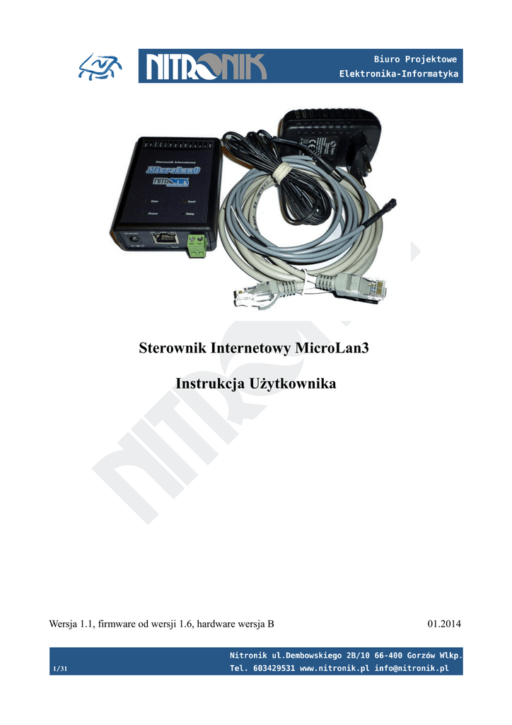 Sterownik Internetowy MicroLan3 Instrukcja Użytkownika Wersja 1.1, firmware od wersji 1.6, hardware wersja B 1/31 01.2014 Sterownik MicroLan3 jest niewielkim urządzeniem, który dołączony do sieci Ethernet pełni rolę serwera http. Umożliwia monitorowanie sygnałów wejściowych oraz sterowanie sygnałami wyjściowymi przy pomocy dowolnej przeglądarki internetowej. Do obsługi może być użyty zarówno komputer jak i telefon komórkowy. Dodatkowo sterownik może reagować na zmiany parametrów wejściowych i sygnalizować je poprzez np. wiadomość email. Zastosowanie zdalne sterowanie zdalne włączanie, wyłączanie, restart serwerów lub routerów powiadamianie o przekroczeniu temperatury pracy urządzeń powiadamianie o obniżeniu temperatury w pomieszczeniu monitorowanie temperatury i wilgotności monitowanie napięć rejestrator temperatury z interfejsem Ethernet monitorowanie pracy i usterek urządzeń powiadamianie o alarmie przez sieć Ethernet Właściwości 2 wejścia cyfrowe 0/3,3V - regulowana czułość (czas reakcji po zmianie stanu 0s...16minut), mogą także pełnić role dodatkowych wejść czujników temperatury 1 wejścia cyfrowe optoizolowane (3...24V)- regulowana czułość (czas reakcji po zmianie stanu 0s...16minut) 4 wejścia czujników temperatury (-50°C...+125°C) - zasięg do 100m. 2 wejścia analogowe (0...5V, 0...10V) z obsługą czujników wilgotności, rezystancja wejściowa >100kΩ 1 wyjście przekaźnikowe (3A/24V) tryb bistabilny tryb monostabilnym z regulowanym czasem zadziałania programowany stan po włączeniu zasilania: wyłączony, włączony, pamięć stanu sprzed zaniku zasilania przycisk „Reset” do przywracania ustawień fabrycznych dioda „Power” sygnalizująca zasilanie - zielona dioda „Relay” sygnalizująca stan przekaźnika (czerwona) dioda „ACT” sygnalizująca transmisję danych ( gniazdko RJ45 żółta) dioda „STA” sygnalizująca pracę urządzenia (gniazdko RJ45 zielona) 2/31 dioda „Send” sygnalizująca wysyłanie wiadomości email lub pakietu TCP - żółta dioda „Data” sygnalizująca transmisje danych SNMP - żółta zasilanie 10V...24V pobór prądu 110mA/12V możliwość zasilania przez sieć LAN PoE (poprzez adapter PoE) wymiary obudowy: 92x62x28 mm Właściwości sieciowe praca w trybie agenta SNMP (bez funkcji TRAP) praca w trybie serwera http obsługa przez przeglądarkę internetową możliwość zmiany portu dostępowego (domyślnie 80) konfiguracja z poziomu przeglądarki www dostęp do podglądu i sterowania zabezpieczony hasłem "user" (możliwość wyłączenia hasła w sieci lokalnej) dostęp do konfiguracji zabezpieczony hasłem "admin" tryb dynamicznego pobierania adresu sieciowego (DHCP) możliwość pracy ze stały adresem IP możliwość zmiany adresu MAC urządzenia standard komunikacji 10Mb (praca w sieciach 10,100,1000Mb) wymiana firmware przez sieć Ethernet dedykowane oprogramowanie do wyszukiwania modułów MicroLan w sieci LAN funkcja przywracania ustawień fabrycznych wysyłanie wiadomości email wysyłanie pakietów TCP w trybie clienta Właściwości alarmowe programowane funkcje alarmu po wystąpienie zdarzenia zmiana stanu wejść wzrost temperatury spadek temperatury przekroczenie zadanego czasu wysyłanie wiadomości email wysyłanie pakietów TCP do zewnętrznego serwera 3/31 Strona główna Wyświetlana jest strona główna umożliwiająca wybór opcji "Status i Sterowanie" lub "Ustawienia". 4/31 Status i Sterowanie Dostęp do zakładki zabezpieczony jest hasłem typu "user". Jako nazwę użytkownika stosuje się "user" a hasło jest zdefiniowanym hasłem w zakładce "Ustawienia Sieciowe". Z sieci zewnętrznej hasło zawsze jest wymagane, a w sieci lokalnej możliwe jest wyłączenie żądania hasła. Zakładka umożliwia podgląd wartości temperatur, stanu wejść cyfrowych i analogowych. Dodatkowo możliwy jest podgląd stanu przekaźnika i jego zmianę. Reakcja przekaźnika na naciśnięcie przycisku "Przełącz" jest zależna od jego trybu pracy (ustawiany w zakładce „Ustawienia Wejść i Wyjść”). 5/31 Wszystkie zakładki ustawień zabezpieczone są hasłem typu "admin". Hasło jest wymagane zarówno w sieci lokalnej jak i zewnętrznej. Nie ma możliwości jego wyłączenia. Zmiana hasła dokonywana jest w zakładce "Ustawienia sieciowe". 6/31 Ustawienia Email Zakładka umożliwia włączenie usługi wysyłania wiadomości email przez sterownik. Należy zdefiniować konto użytkownika, którego ma używać sterownik do wysyłania wiadomości. Niezbędne jest podanie hasła dostępu oraz hasła do logowania do serwera email. Można zdefiniować także port, po którym sterownik ma się komunikować z serwerem, domyślnie jest to port 587. Obsługiwane są tylko połączenia nieszyfrowane. Po skonfigurowaniu konta email należy podać adresata wiadomości oraz tytuł. Po włączeniu usługi zdefiniowane zdarzenia alarmowe będą wysyłane na podany email. Przycisk „Test” umożliwia wysłanie wiadomości email z poziomu strony internetowej. Automatycznie wiadomości email wysyłane są tylko w przypadku wystąpienia zdarzenia alarmowego. Opcja „Źródło alarmu w temacie wiadomości” powoduje wyświetlenie informacji o źródle wiadomości w jej temacie. 7/31 Oprócz standardowych wiadomości email możliwe jest także wysłanie wiadomości SMS na telefon komórkowy. Do tego celu konieczne jest zastosowanie bramki mail2sms. Sterownik został przystosowany do współpracy z serwisem www.serwersms.pl Wiadomość email jest przesyłana na podany adres a następnie za pomocą serwisu przesyłana dalej jako SMS. Aby zmniejszyć ilość wysyłanych wiadomości SMS możliwa jest konfiguracja treści oraz zawartych opisów. W ten sposób informacja może składać się z 1, 2 lub 3 wiadomości SMS. Konfiguracje opisu parametrów można także stosować do zwykłych wiadomości email. Konfiguracja email dla bramki email2sms - przykład Wiadomość email zosta