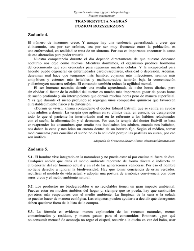 Egzamin maturalny z języka hiszpańskiego Poziom rozszerzony TRANSKRYPCJA NAGRAŃ POZIOM ROZSZERZONY Zadanie 4. El número de insomnes crece. Y aunque hay una tendencia generalizada a creer que el insomnio, sea por ser crónico, sea por ser muy frecuente entre la población, es una enfermedad, en realidad se trata de un síntoma. Por eso es importante encontrar la causa de esa alteración para poder tratarla. Nuestra competencia durante el día depende directamente de que nuestro descanso nocturno nos deje como nuevos. Mientras dormimos, el organismo produce hormonas del crecimiento que son esenciales para regenerar nuestras células. Y la incapacidad para hacerlo puede degenerar en enfermedades cardiovasculares, obesidad o depresión. Además, descansar mal hace que tengamos más hambre, cojamos más infecciones, seamos más antipáticos y estemos más irritables y malhumorados; también baja la concentración y disminuyen nuestros reflejos. El cansancio también reduce la agilidad mental. El ser humano necesita dormir una media aproximada de ocho horas diarias, pero sin olvidar el factor de la calidad del sueño: es mucho más importante gozar de pocas horas de sueño profundo y sin interrupciones que dormir muchas horas pero de manera superficial. Y es que durante el sueño profundo se segregan unos compuestos químicos que favorecen el restablecimiento físico y la distensión. «Dormir es vivir», afirma contundente el doctor Eduard Estivill, que se centra en ayudar a los adultos a dormir. La terapia que aplican en su clínica trata, en esencia, de desaprender todo lo que el paciente ha interiorizado mal en lo referente a los hábitos relacionados con el sueño, la alimentación y el descanso. Por eso, la terapia del doctor Estivill se basa en reaprender las costumbres que antaño nos inculcaban los adultos, cuando nos bañaban, nos daban la cena y nos leían un cuento dentro de un horario fijo. Según el médico, tomar medicamentos para conciliar el sueño no es la solución porque las pastillas no curan, por eso son inútiles. adaptado de Francisco Javier Alonso, xlsemanal.finanzas.com Zadanie 5. 5.1. El hombre vive integrado en la naturaleza y no puede estar ni por encima ni fuera de ésta. Cualquier acción que daña el medio ambiente repercute de forma directa o indirecta en el bienestar del ser humano actual y en el de las generaciones venideras. Por eso el hombre no tiene derecho a ignorar la biodiversidad. Hay que tomar conciencia de estas verdades, rectificar el modelo de vida actual y adoptar una postura de armónica convivencia con otros seres vivos y el medio ambiente natural. 5.2. Los productos no biodegradables o no reciclables tienen un gran impacto ambiental. Pueden estar en muchos ámbitos del hogar y, siempre que se pueda, hay que sustituirlos por otros más respetuosos con el medio ambiente. La limpieza de la casa o la colada se pueden hacer de manera ecológica. Las etiquetas pueden ayudarte a decidir qué detergentes deben quedarse fuera de la lista de la compra. 5.3. La fórmula es evidente: menos explotación de los recursos naturales, menos contaminación y residuos, y menos gastos para el consumidor. Entonces, ¿por qué no consumir menos? Se aconseja no regar el césped, recurrir a la ducha en vez del baño, usar Egzamin maturalny z języka hiszpańskiego Poziom rozszerzony el lavaplatos en vez de fregar, desenchufar los cargadores y otros aparatos si no se usan, comprar electrodomésticos de bajo consumo y apagar las luces cuando no se necesitan. 5.4. Prolongar la vida útil de los bienes contribuye a disminuir el impacto ambiental. En vez de los productos de usar y tirar, hay que optar por un consumo responsable; aprovechar lo que ya tenemos y volver a usar las cosas. Conviene, por ejemplo, llevar bolsas de tela a la compra, intercambiar los libros y la ropa entre familiares y amigos. Además, hay que hacer caso de las recomendaciones de los fabricantes; cuidar de manera adecuada los productos y repararlos siempre que se pueda, ayudará a que duren más. 5.5. Separar los residuos y segregar la basura de manera adecuada para que posteriormente vuelvan a ser utilizados es una acción con múltiples beneficios medioambientales. La basura recuperada no acaba en los vertederos, cada vez más saturados, los materiales desechados se aprovechan para elaborar nuevos productos y, por ello, se evita la extracción de nuevas materias primas. adapatado de www.consumer.es Zadanie 6. Hoy está con nosotros Manolo García, cantante y pintor, que lleva sobre sus espaldas una larga carrera artística y cuyos cuadros están a la misma altura que las canciones que ha compuesto. Hablamos con él antes de que empiece la gira nacional de promoción de su último disco y justo cuando acaba de clausurar una exposición de sus cuadros en Madrid. Buenos días. Hola a todos. Y gracias por invitarme al programa. ¿Cómo trabajas? Yo trabajo en una pequeña habitación en mi piso, donde tengo todos los trastos juntos: el caballete, una mesa, los libros, las tizas, ceras, óleos y un amplificador, un par de guitarras, una grabadora... Es mi mundo, al que nadie tiene acceso, donde yo ejerzo de rey, de déspota, donde desconecto. No sé trabajar de otra manera. Uno de tus dibujos ilustra la cubierta de tu último disco. ¿Desde cuándo sientes esta pasión por los pinceles y los lápices? Desde muy joven. Siempre he tenido la necesidad de dibujar. Y en cuanto a la música, me dejo llevar por una intuición, por una percepción, por una emotividad, y lo único que hago es compartir mis sentimientos con otros. Solo intento ser feliz. ¿Las nuevas tecnologías te ayudan en el trabajo? ¿Te lo facilitan? ¿Te inspiran? Bueno, reconozco que soy un “tecnófobo” declarado. Es algo innato. Yo soy muy cauteloso con la carrera, con las prisas, con el progreso. Adelante, adelante, adelante... No acabo de entender la idea de que cada seis meses haya que cambiar el iPad, el iPod, el 'nosequé'. 