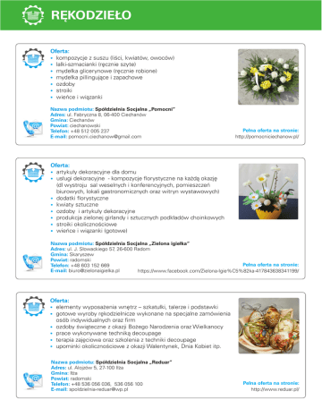 RĘKODZIEŁO Oferta: • kompozycje z suszu (liści, kwiatów, owoców) • lalki-szmacianki (ręcznie szyte) • mydełka glicerynowe (ręcznie robione) • mydełka pillingujące i zapachowe • ozdoby • stroiki • wieńce i wiązanki Nazwa podmiotu: Spółdzielnia Socjalna „Pomocni” Adres: ul. Fabryczna 8, 06-400 Ciechanów Gmina: Ciechanów Powiat: ciechanowski Telefon: +48 512 005 237 E-mail: [email protected] Pełna oferta na stronie: http://pomocniciechanow.pl/ Oferta: • artykuły dekoracyjne dla domu • usługi dekoracyjne - kompozycje florystyczne na każdą okazję (dl wystroju sal weselnych i konferencyjnych, pomieszczeń biurowych, lokali gastronomicznych oraz witryn wystawowych) • dodatki florystyczne • kwiaty sztuczne • ozdoby i artykuły dekoracyjne • produkcja zielonej girlandy i sztucznych podkładów choinkowych • stroiki okolicznościowe • wieńce i wiązanki (gotowe) Nazwa podmiotu: Spółdzielnia Socjalna „Zielona igiełka” Adres: ul. J. Słowackiego 57, 26-600 Radom Gmina: Skaryszew Powiat: radomski Pełna oferta na stronie: Telefon: +48 603 152 669 E-mail: [email protected] https://www.facebook.com/Zielona-Igie%C5%82ka-417843638341199/ Oferta: • elementy wyposażenia wnętrz – szkatułki, talerze i podstawki • gotowe wyroby rękodzielnicze wykonane na specjalne zamówienia osób indywidualnych oraz firm • ozdoby świąteczne z okazji Bożego Narodzenia oraz Wielkanocy • prace wykonywane techniką decoupage • terapia zajęciowa oraz szkolenia z techniki decoupage • upominki okolicznościowe z okazji Walentynek, Dnia Kobiet itp. Nazwa podmiotu: Spółdzielnia Socjalna „Reduar” Adres: ul. Alojzów 5, 27-100 Iłża Gmina: Iłża Powiat: radomski Telefon: +48 536 056 036, 536 056 100 E-mail: [email protected] Pełna oferta na stronie: http://www.reduar.pl/ RĘKODZIEŁO Podmiot wyróżniony Mazowiecką Marką Ekonomii Społecznej’ 2016 Oferta: • bombki i ozdoby świąteczne • korzenne pierniki wyrabiane na miodzie i maśle śmietankowym (ręcznie zdobione i pakowane w folię celofanową) • stroiki kwiatowe (ręcznie wykonane) • wyroby cukiernicze (pierniki, ciasteczka, babeczki i muffinki) • wyroby z wikliny papierowej. • zapachy do aromaterapii (pokrzywa, mięta, rumianek, nagietek, chaber) do wykorzystania w salonach, mieszkaniach, hotelach, samochodach - w oryginalnych opakowaniach - haftowanych woreczkach zapachowych Nazwa podmiotu: Spółdzielnia Socjalna „Zioła Siedleckie” Adres: ul. Jana Kilińskiego 29, 08-110 Siedlce Gmina: Siedlce Powiat: siedlecki Pełna oferta na stronie: Telefon: (25) 632 43 78 http://www.ziolasiedleckie.pl/ E-mail: [email protected] OPIEKA NAD DZIEĆMI Oferta: • • • • • Nazwa podmiotu: Adres: Gmina: Powiat: Telefon: E-mail: Pełna oferta na stronie: