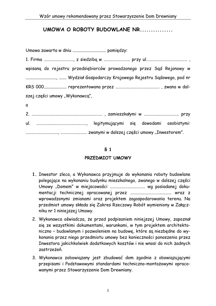 Wzór umowy rekomendowany przez Stowarzyszenie Dom Drewniany UMOWA O ROBOTY BUDOWLANE NR............... Umowa zawarta w dniu ............................... pomiędzy: 1. Firma …………………………, z siedzibą w ……………………… przy ul…………………………………… , wpisaną do rejestru przedsiębiorców prowadzonego przez Sąd Rejonowy w ............................, ....... Wydział Gospodarczy Krajowego Rejestru Sądowego, pod nr KRS 000..................... reprezentowana przez ……………………………………… , zwana w dalszej części umowy „Wykonawcą”, a 2. ……………………………………………………………… , zamieszkałymi w ……………………………… przy ul. ……………………………………………, legitymującymi się dowodami osobistymi: ……………………………, ……………………… zwanymi w dalszej części umowy „Inwestorem”. § 1 PRZEDMIOT UMOWY 1. Inwestor zleca, a Wykonawca przyjmuje do wykonania roboty budowlane polegające na wykonaniu budynku mieszkalnego, zwanego w dalszej części Umowy „Domem” w miejscowości ……………………………… wg posiadanej dokumentacji technicznej opracowanej przez …………………………………… wraz z wprowadzonymi zmianami oraz projektem zagospodarowania terenu. Na przedmiot umowy składa się Zakres Rzeczowy Robót wymieniony w Załączniku nr 1 niniejszej Umowy. 2. Wykonawca oświadcza, że przed podpisaniem niniejszej Umowy, zapoznał się ze wszystkimi dokumentami, warunkami, w tym projektem architektoniczno – budowlanym i pozwoleniem na budowę, które są niezbędne do wykonania przez niego przedmiotu umowy bez konieczności ponoszenia przez Inwestora jakichkolwiek dodatkowych kosztów i nie wnosi do nich żadnych zastrzeżeń. 3. Wykonawca zobowiązany jest zbudować dom zgodnie z obowiązującymi przepisami i Podstawowymi standardami techniczno-montażowymi opracowanymi przez Stowarzyszenie Dom Drewniany. 1 Wzór umowy rekomendowany przez Stowarzyszenie Dom Drewniany 4. W razie konieczności wykonania na prośbę Inwestora, w toku realizacji przedmiotu umowy, robót dodatkowych, nie przewidywanych dokumentacją techniczną Inwestor zobowiązany jest do pokrycia wszelkich dodatkowych kosztów. 5. Wykonawca zapewnia odpowiedni zespół pracowników i sprzęt potrzebny do wykonania przedmiotu umowy. 6. Przedmiot niniejszej umowy musi być oddany Inwestorowi w stanie określonym umową po dokonaniu wszystkich odbiorów technicznych w obecności Inwestora i powołanego w jego imieniu Inspektora Nadzoru w zakresie objętym Umową. 7. Inwestor zobowiązuje się do dokonania określonych w §6 Umowy czynności związanych z przygotowaniem wykonania przedmiotu Umowy, dokonania odbioru i zapłaty umówionego wynagrodzenia za jego wykonanie. 8. Wykonawca wykona przedmiot umowy siłami własnymi lub siłami podwykonawców. Wykonawca ponosi pełną odpowiedzialność za roboty, które wykona przy pomocy podwykonawców. 9. Wykonawca zobowiązuje się w trakcie wykonywania przedmiotu umowy do stosowania się do poleceń przedstawiciela Inwestora. §2 TERMIN REALIZACJI 1. Przekazanie placu budowy nastąpi w dniu ........................... Zakończenie całości robót nastąpi do dnia ......................... Za datę zakończenia inwestycji rozumie się datę podpisania końcowego protokołu odbioru bezusterkowego prac. Strony zgodnie ustalają, że termin wykonania Umowy obejmuje również termin przeznaczony na usunięcie stwierdzonych przy dokonywaniu odbioru technicznego przedmiotu umowy usterek i wad dotyczących etapów budowy. 2. Wytyczenie geodezyjne obiektu wykona uprawniony geodeta i przekaże Wykonawcy zgodnie z protokołem przekazania placu budowy. 3. W razie stwierdzenia przez Wykonawcę braków w dokumentacji uniemożliwiających kontynuowanie robót, Wykonawca jest zobowiązany do bezzwłocznego powiadomienia Inwestora. Umowny termin zakończenia całości robót może wówczas ulec przesunięciu. 4. Termin realizacji może ulec zmianie ze względu na wystąpienie sił wyższych wg kodeksu cywilnego niezależnych od Wykonawcy. 2 Wzór umowy rekomendowany przez Stowarzyszenie Dom Drewniany §3 WARUNKI ODBIORU ROBÓT 1. Odbiór poszczególnych etapów robót będzie dokonany przez Inwestora lub upoważnionego przez niego Inspektora nadzoru inwestorskiego, w obecności Kierownika budowy w terminie 3 dni od daty zgłoszenia przez Wykonawcę zakończenia prac danego etapu. 2. Inwestor ma prawo zgłosić zastrzeżenia do wykonanych robót w terminie 7 dni od dokonania odbioru. Nie zgłoszenie zastrzeżeń w powyższym terminie jest traktowane przez Strony jak podpisanie protokołu odbioru bezusterkowego poszczególnych etapów robót. 3. Wykonawca zobowiązany jest w terminie 14 dni usunąć wszelkie zgłoszone przez Zamawiającego wady, jak i przyczyny ich powstania zaistniałe z winy Wykonawcy. W takim wypadku protokół bezusterkowego odbioru zostanie podpisany po usunięciu tych wad i usterek. 4. Podpisanie protokołu odbioru bezusterkowego poszczególnych etapów robót jest warunkiem wypłaty wynagrodzenia za dany etap robót. 5. W przypadku nie usunięcia wad w oznaczonym terminie, Inwestor ma prawo je usunąć w zastępstwie Wykonawcy i na jego koszt, bez wyznaczania mu dodatkowego terminu na usunięcie wad. 6. Inwestor ma prawo zgłaszać zastrzeżenia w toku wykonywania poszczególnych prac. W przypadku stwierdzenia wad, Inwestor zgłosi zastrzeżenia Wykonawcy. Do usunięcia wad stosuje się postanowienia niniejszego paragrafu. §4 NADZÓR 1. Inwestor powołuje Inspektora Nadzoru w osobie ......................., Inspektor działa w granicach umocowania określonego przepisami ustawy z dnia 7 lipca 1994 r. Prawo Budowlane (Dz. U. Nr 89, poz. 414) 2. Wykonawca jest zobowiązany zapewnić Inspektorowi dostęp do placu budowy i Dziennika Budowy. 3. Wykonawca jest zobowiązany sto