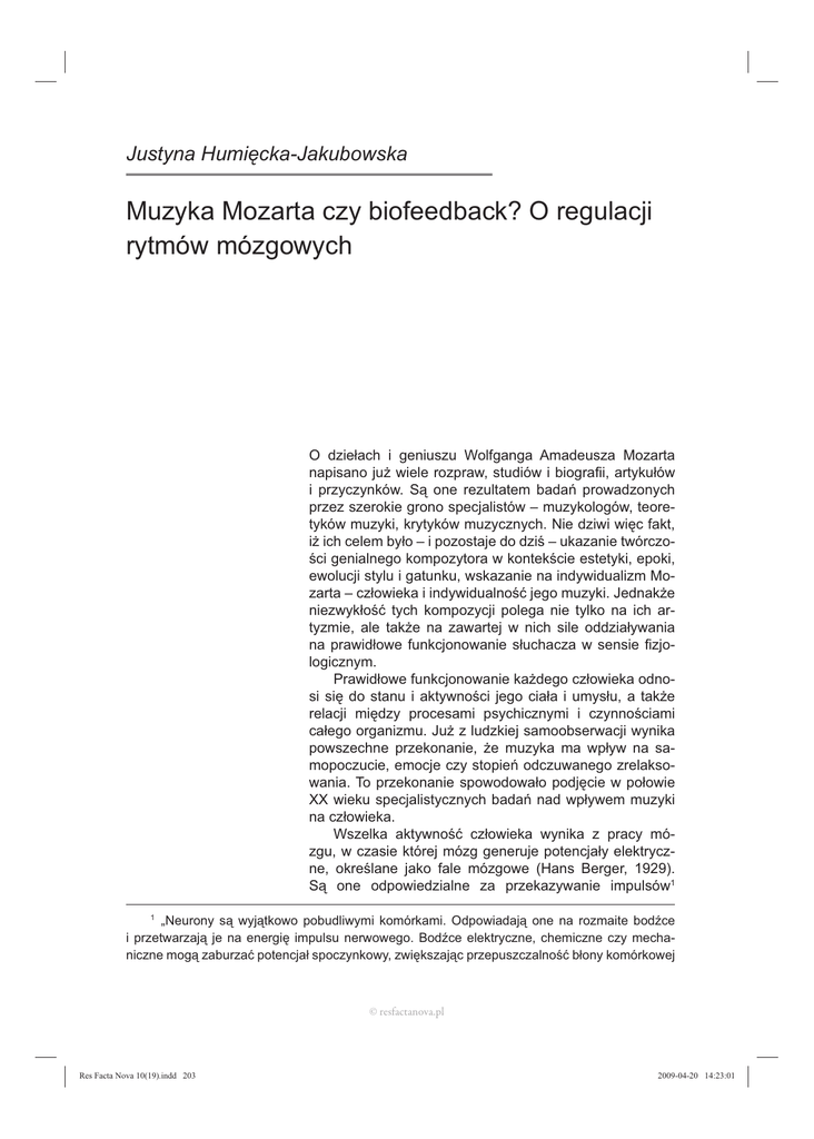 Justyna Humięcka-Jakubowska Muzyka Mozarta czy biofeedback? O regulacji rytmów mózgowych O dziełach i geniuszu Wolfganga Amadeusza Mozarta napisano już wiele rozpraw, studiów i biografii, artykułów i przyczynków. Są one rezultatem badań prowadzonych przez szerokie grono specjalistów – muzykologów, teoretyków muzyki, krytyków muzycznych. Nie dziwi więc fakt, iż ich celem było – i pozostaje do dziś – ukazanie twórczości genialnego kompozytora w kontekście estetyki, epoki, ewolucji stylu i gatunku, wskazanie na indywidualizm Mozarta – człowieka i indywidualność jego muzyki. Jednakże niezwykłość tych kompozycji polega nie tylko na ich artyzmie, ale także na zawartej w nich sile oddziaływania na prawidłowe funkcjonowanie słuchacza w sensie fizjologicznym. Prawidłowe funkcjonowanie każdego człowieka odnosi się do stanu i aktywności jego ciała i umysłu, a także relacji między procesami psychicznymi i czynnościami całego organizmu. Już z ludzkiej samoobserwacji wynika powszechne przekonanie, że muzyka ma wpływ na samopoczucie, emocje czy stopień odczuwanego zrelaksowania. To przekonanie spowodowało podjęcie w połowie XX wieku specjalistycznych badań nad wpływem muzyki na człowieka. Wszelka aktywność człowieka wynika z pracy mózgu, w czasie której mózg generuje potencjały elektryczne, określane jako fale mózgowe (Hans Berger, 1929). Są one odpowiedzialne za przekazywanie impulsów1 1 „Neurony są wyjątkowo pobudliwymi komórkami. Odpowiadają one na rozmaite bodźce i przetwarzają je na energię impulsu nerwowego. Bodźce elektryczne, chemiczne czy mechaniczne mogą zaburzać potencjał spoczynkowy, zwiększając przepuszczalność błony komórkowej © resfactanova.pl Res Facta Nova 10(19).indd 203 2009-04-20 14:23:01 między neuronami kory mózgowej. Jeśli przekazywanie impulsów jest utrudnione, to informacje w nich zawarte zostaną utracone. Badania wpływu muzyki na człowieka (Alfred Tomatis2) pokazały, że bodźce dźwiękowe3 – odbierane przez ucho w czasie słuchania muzyki i transformowane w nerwowym systemie słuchowym w neuronalne impulsy – dynamizują impulsację neuronów w korze mózgowej, co wywołuje wiele objawów pozytywnych dla prawidłowego funkcjonowania człowieka, takich, jak m.in. poprawa procesów pamięciowych, wzrost kreatywności, harmonizowanie napięcia mięśniowego, opóźnienie objawów zmęczenia czy poprawa koordynacji ruchowej. Wspomniana powyżej dynamizacja kory mózgowej jest efektem synchronizacji fal mózgowych, w czasie której poszczególne części mózgu pracują w tym samym rytmie. Jeśli dwie fale mózgowe – występujące w dwóch miejscach kory mózgowej – jednocześnie osiągają maksimum natężenia oraz jego minimum, to stan synchronizacji fal mózgowych jest wysoki. Taki stan umożliwia sprawne przekazywanie pobudzeń między neuronami (sprawny przekaz impulsów) zarówno wewnątrz półkuli mózgowej, jak i między półkulami. Warto w tym miejscu przypomnieć, iż synchronizacja międzypółkulowa ma wpływ na akt poznania, w którym dochodzi do zjednoczenia analitycznego (lewa półkula) i syntetycznego (prawa półkula) przetwarzania informacji. Rytmy mózgowe mają zdolność osiągania różnych wartości, które z kolei zależą od stanu świadomości oraz umiejscowienia (części kory mózgowej lub ośrodków podkorowych). Związek między typem fali mózgowej a wywołanym przez nią stanem świadomości przedstawia poniższa tabela. Typ fali mózgowej Zakres częstotliwości Cechy charakteryzujące fale Charakter aktywności umysłowej 1 2 3 4 Delta 0,5-4 Hz Rzadko i spontanicznie generowane, o znacznej amplitudzie i niewielkiej częstotliwości. Stan głębokiego snu4, nieświadomy. Okresowo występują dynamiczne marzenia senne. dla kationów sodu. Jeśli błona komórkowa jest tylko nieznacznie podrażniona, może skończyć się na lokalnym zaburzeniu potencjału. Natomiast bodziec wystarczająco silny może wzbudzić potencjał czynnościowy, innymi słowy przewodzenie impulsu nerwowego”. (E. Solomon, L. Berg, D. Martin, i in., Biologia. Warszawa 2000, s. 822). 2 A. Tomatis, A., The Conscious Ear, Station Hill Press, 1991. 3 Energia mechaniczna bodźca jest przetwarzana w energię elektryczną, która prowadzi do powstania potencjału receptorowego, czyli stanu depolaryzacji receptora na skutek działania bodźca. Powstanie potencjału receptorowego warunkuje wywołanie potencjału czynnościowego, który jest lokalną zmianą potencjału elektrycznego komórki nerwowej w czasie jej aktywności. 4 Stan snu charakteryzują dwie fazy: snu paradoksalnego (faza REM) i snu normalnego (faza SEM). Faza REM występuje okresowo (co ok. 90 min.) i zajmuje ok. 1/4 całego czasu snu, a mózg wysyła wówczas nieregularne fale beta. Faza SEM charakteryzuje się występowaniem spontanicznie generowanych fal delta (za: Solomon, op. cit., s. 847). © resfactanova.pl Res Facta Nova 10(19).indd 204 2009-04-20 14:23:01 1 2 3 4 Theta 4-8 Hz Występują krótkookresowo, z dużą amplitudą i bardzo wysokim wskaźnikiem synchronizacji. Stan wysokiej kreatywności, głębokiej medytacji oraz powolnego opadania w sen. Często obserwowane występowanie spontanicznej hipnagogii5, która pojawia się w czasie „półsnu”, a także iluzji i omamów przy pewnym poziomie świadomości. Występowanie marzeń sennych ma w tym stanie charakter mniej dynamiczny i jest nacechowane emocjonalnie. Alfa 8-12 Hz Są emitowane rytmicznie, z dość dużą amplitudą (a zatem także synchronizacją). Stan całkowitego spoczynku (oczy zamknięte), także stan relaksu, odprężenia; osiągnięcie górnej granicy częstotliwości wskazuje też stan wzmożonej uwagi przy oczekiwaniu na pojawienie się bodźca; dolną granicę częstotliwości osiąga mózg znajdujący się na granicy snu i czuwania. Beta 13-30 Hz Charakteryzują się zmienną amplitudą i wysoką częstotliwością, odpo
