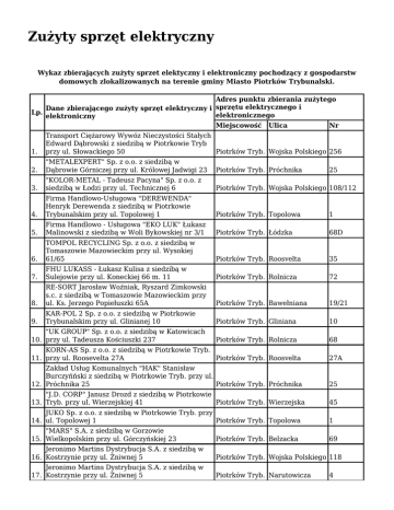 Zużyty sprzęt elektryczny Wykaz zbierających zużyty sprzet elektyczny i elektroniczny pochodzący z gospodarstw domowych zlokalizowanych na terenie gminy Miasto Piotrków Trybunalski. Adres punktu zbierania zużytego Dane zbierającego zużyty sprzęt elektryczny i sprzętu elektrycznego i Lp. elektronicznego elektroniczny Miejscowość Ulica Nr 1. Transport Ciężarowy Wywóz Nieczystości Stałych Edward Dąbrowski z siedzibą w Piotrkowie Tryb przy ul. Słowackiego 50 Piotrków Tryb. Wojska Polskiego 256 2. "METALEXPERT" Sp. z o.o. z siedzibą w Dąbrowie Górniczej przy ul. Królowej Jadwigi 23 Piotrków Tryb. Próchnika 3. "KOLOR-METAL - Tadeusz Pacyna" Sp. z o.o. z siedzibą w Łodzi przy ul. Technicznej 6 Piotrków Tryb. Wojska Polskiego 108/112 4. Firma Handlowo-Usługowa "DEREWENDA" Henryk Derewenda z siedzibą w Piotrkowie Trybunalskim przy ul. Topolowej 1 Piotrków Tryb. Topolowa 1 5. Firma Handlowo - Usługowa "EKO LUK" Łukasz Malinowski z siedzibą w Woli Bykowskiej nr 3/1 Piotrków Tryb. Łódzka 68D 6. TOMPOL RECYCLING Sp. z o.o. z siedzibą w Tomaszowie Mazowieckim przy ul. Wysokiej 61/65 Piotrków Tryb. Roosvelta 35 7. FHU LUKASS - Łukasz Kulisa z siedzibą w Sulejowie przy ul. Koneckiej 66 m. 11 Piotrków Tryb. Rolnicza 72 8. RE-SORT Jarosław Woźniak, Ryszard Zimkowski s.c. z siedzibą w Tomaszowie Mazowieckim przy ul. Ks. Jerzego Popiełuszki 65A Piotrków Tryb. Bawełniana 19/21 9. KAR-POL 2 Sp. z o.o. z siedzibą w Piotrkowie Trybunalskim przy ul. Glinianej 10 Piotrków Tryb. Gliniana 10 Piotrków Tryb. Rolnicza 68 "UK GROUP" Sp. z o.o. z siedzibą w Katowicach 10. przy ul. Tadeusza Kościuszki 237 25 KORN-AS Sp. z o.o. z siedzibą w Piotrkowie Tryb. 11. przy ul. Roosevelta 27A Piotrków Tryb. Roosvelta 27A Zakład Usług Komunalnych "HAK" Stanisław Burczyńński z siedzibą w Piotrkowie Tryb. przy ul. 12. Próchnika 25 Piotrków Tryb. Próchnika 25 "J.D. CORP" Janusz Drozd z siedzibą w Piotrkowie 13. Tryb. przy ul. Wierzejskiej 41 Piotrków Tryb. Wierzejska 45 JUKO Sp. z o.o. z siedzibą w Piotrkowie Tryb. przy 14. ul. Topolowej 1 Piotrków Tryb. Topolowa 1 "MARS" S.A. z siedzibą w Gorzowie 15. Wielkopolskim przy ul. Górczyńskiej 23 Piotrków Tryb. Belzacka 69 Jeronimo Martins Dystrybucja S.A. z siedzibą w 16. Kostrzynie przy ul. Żniwnej 5 Piotrków Tryb. Wojska Polskiego 118 Jeronimo Martins Dystrybucja S.A. z siedzibą w 17. Kostrzynie przy ul. Żniwnej 5 Piotrków Tryb. Narutowicza 4 Jeronimo Martins Dystrybucja S.A. z siedzibą w 18. Kostrzynie przy ul. Żniwnej 5 Piotrków Tryb. Wolborska 6 Jeronimo Martins Dystrybucja S.A. z siedzibą w 19. Kostrzynie przy ul. Żniwnej 5 Piotrków Tryb. Sienkiewicza 19 Jeronimo Martins Dystrybucja S.A. z siedzibą w 20. Kostrzynie przy ul. Żniwnej 5 Piotrków Tryb. Belzacka 9 Jeronimo Martins Dystrybucja S.A. z siedzibą w 21. Kostrzynie przy ul. Żniwnej 5 Piotrków Tryb. Kostromska 51a Jeronimo Martins Dystrybucja S.A. z siedzibą w 22. Kostrzynie przy ul. Żniwnej 5 Piotrków Tryb. Dzielna 10 Jeronimo Martins Dystrybucja S.A. z siedzibą w 23. Kostrzynie przy ul. Żniwnej 5 Piotrków Tryb. Wojska Polskiego 24 Jeronimo Martins Dystrybucja S.A. z siedzibą w 24. Kostrzynie przy ul. Żniwnej 5 Piotrków Tryb. Sulejowska 45 Polska Telefonia Cyfrowa Sp. z o.o. z siedzibą w 25. Warszawie przy Al.. Jerozolimskich 181 Piotrków Tryb. 3-go Maja 2 Kaufland Polska Markety Sp. z o.o. z siedzibą we 26. Wrocławiu przy ul. Szybkiej 6-10 Piotrków Tryb. Wojska Polskiego 121 "HEMPIS" Sp. z o.o. z siedzibą w Piotrkowie 27. Trybunalskim przy ul. Demczyka 16-28 Piotrków Tryb. Demczyka Sklep Ogrodniczo Przemysłowy Środki Ochrony oślin Roman Kaczmarek z siedzibą w Piotrkowie 28. Trybunalskim przy ul. Wojska Polskiego 63 Piotrków Tryb. Wojska Polskiego 63 WJM - BUD HURT, DETAL s.c. K.Z. Wiśniewscy, B.M. Muszelik z siedzibą w Piotrkowie 29. rybunalskim przy ul. Wojska Polskiego 63 Piotrków Tryb. Wojska Polskiego 63 16-28 FH PLON Zaopatrzenie Ogrodniczo Pszczelarskie Antoni Słomecki z siedzibą w 30. Piotrkowie Trybunalskim przy ul. Wierzejskiej 94 Piotrków Tryb. Wierzejska 94 FHU MADEX z siedzibą w Piotrkowie Tryb. przy 31. ul. Zawiłej 32 Piotrków Tryb. Zawiła 32 Domator Sp. z o.o. z siedzibą w Koninie przy ul. 32. Spółdzielców 5 Piotrków Tryb. Kostromska 51A Domator Sp. z o.o. z siedzibą w Koninie przy ul. 33. Spółdzielców 5 Piotrków Tryb. Sikorskiego 7 SZKWAŁ Sp. z .o. z siedzibą w Piotrkowie Tryb. 34. przy Al.. Sikorskiego 7 Piotrków Tryb. Sikorskiego 7 POLBITA Sp. z o.o. z siedziba w Warszawie przy 35. ul. Jana Kazimierza 57 Piotrków Tryb. Słowackiego 22 Mix-electronics S.A. z sziedzibą w Krakowie przy 36. ul. Grzegórzeckiej 79 Piotrków Tryb. Sikorskiego 13/17 McDonald's Polska Sp. z o.o. z sedzibą w 37. Warszawie przy ul. Domaniewskiej 41 Piotrków Tryb. Słowackiego 80 Naprawa Sprzętu AGD Janusz Kusideł z siedzibą 38. w Piotrkowie Tryb. przy ul. Leonarda 13/17 Piotrków Tryb. Leonarda 13/17 Cefarm Śląski Sp. z o.o. z siedzibą w Warszawie 39. przy ul. Jana Sebastiana Bacha 2 Piotrków Tryb. Sikorskiego 11 PUH Winicjusz Szulc z siedzibą w Gorzkowicach, 40. Kolonia Plucice 51A Piotrków Tryb. 3-go Maja 18 PUH Winicjusz Szulc z siedzibą w Gorzkowicach, M. Skłodowskiej 41. Kolonia Plucice 51A Piotrków Tryb. 8 Comp-An Andrzej Radomiak z siedzibą w Piotrkowie Trybunalskim przy ul. Kotarbińskiego 42. 12A/20 Piotrków Tryb. Szkolna 45b Euro-Net Sp. z o.o. z siedzibą w Warszawie przy 43. ul. Muszkieterów 15 Piotrków Tryb. Sikorskiego 13/17 ART.-DOM Sp. jawna z siedzibą w Łodzi przy ul. 44. Kasprzaka 3 Krakowskie Piotrków Tryb. Przedmieście 14-gru Farmacja Kolejowa Sp. z o.o. z siedzibą w 45. Warszawie przy ul. Radzymińskiej 94 Piotrków Tryb. POW 3 Lindal Sp. z o.o. z siedzibą w Piotrkowie Tryb. 46. przy Al.. Sikorskiego 7 Piotrków Tryb. Sikorskiego 7 Carrefour Polska Sp. z o.o. z siedzibą w 47. Warszawie przy ul. Targowej 72 Piotrków Tryb. Belzacka 93 Fotojoker Sp. z o.o. 