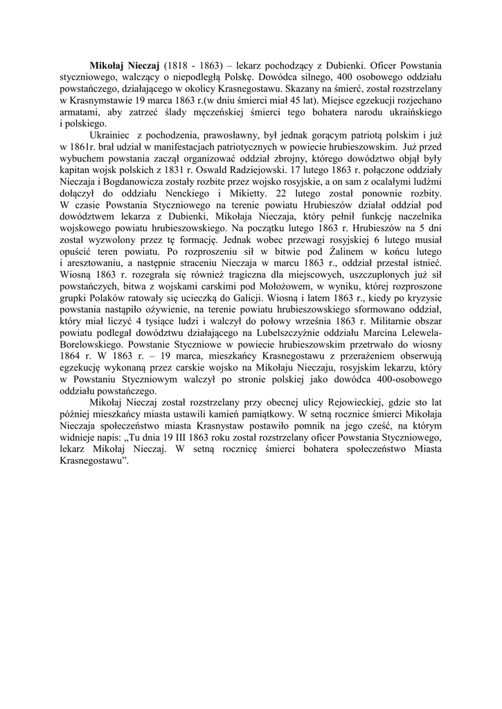 Mikołaj Nieczaj (1818 - 1863) – lekarz pochodzący z Dubienki. Oficer Powstania styczniowego, walczący o niepodległą Polskę. Dowódca silnego, 400 osobowego oddziału powstańczego, działającego w okolicy Krasnegostawu. Skazany na śmierć, został rozstrzelany w Krasnymstawie 19 marca 1863 r.(w dniu śmierci miał 45 lat). Miejsce egzekucji rozjechano armatami, aby zatrzeć ślady męczeńskiej śmierci tego bohatera narodu ukraińskiego i polskiego. Ukrainiec z pochodzenia, prawosławny, był jednak gorącym patriotą polskim i już w 1861r. brał udział w manifestacjach patriotycznych w powiecie hrubieszowskim. Już przed wybuchem powstania zaczął organizować oddział zbrojny, którego dowództwo objął były kapitan wojsk polskich z 1831 r. Oswald Radziejowski. 17 lutego 1863 r. połączone oddziały Nieczaja i Bogdanowicza zostały rozbite przez wojsko rosyjskie, a on sam z ocalałymi ludźmi dołączył do oddziału Nenckiego i Mikietty. 22 lutego został ponownie rozbity. W czasie Powstania Styczniowego na terenie powiatu Hrubieszów działał oddział pod dowództwem lekarza z Dubienki, Mikołaja Nieczaja, który pełnił funkcję naczelnika wojskowego powiatu hrubieszowskiego. Na początku lutego 1863 r. Hrubieszów na 5 dni został wyzwolony przez tę formację. Jednak wobec przewagi rosyjskiej 6 lutego musiał opuścić teren powiatu. Po rozproszeniu sił w bitwie pod Żalinem w końcu lutego i aresztowaniu, a następnie straceniu Nieczaja w marcu 1863 r., oddział przestał istnieć. Wiosną 1863 r. rozegrała się również tragiczna dla miejscowych, uszczuplonych już sił powstańczych, bitwa z wojskami carskimi pod Mołożowem, w wyniku, której rozproszone grupki Polaków ratowały się ucieczką do Galicji. Wiosną i latem 1863 r., kiedy po kryzysie powstania nastąpiło ożywienie, na terenie powiatu hrubieszowskiego sformowano oddział, który miał liczyć 4 tysiące ludzi i walczył do połowy września 1863 r. Militarnie obszar powiatu podlegał dowództwu działającego na Lubelszczyźnie oddziału Marcina LelewelaBorelowskiego. Powstanie Styczniowe w powiecie hrubieszowskim przetrwało do wiosny 1864 r. W 1863 r. – 19 marca, mieszkańcy Krasnegostawu z przerażeniem obserwują egzekucję wykonaną przez carskie wojsko na Mikołaju Nieczaju, rosyjskim lekarzu, który w Powstaniu Styczniowym walczył po stronie polskiej jako dowódca 400-osobowego oddziału powstańczego. Mikołaj Nieczaj został rozstrzelany przy obecnej ulicy Rejowieckiej, gdzie sto lat później mieszkańcy miasta ustawili kamień pamiątkowy. W setną rocznice śmierci Mikołaja Nieczaja społeczeństwo miasta Krasnystaw postawiło pomnik na jego cześć, na którym widnieje napis: „Tu dnia 19 III 1863 roku został rozstrzelany oficer Powstania Styczniowego, lekarz Mikołaj Nieczaj. W setną rocznicę śmierci bohatera społeczeństwo Miasta Krasnegostawu”.