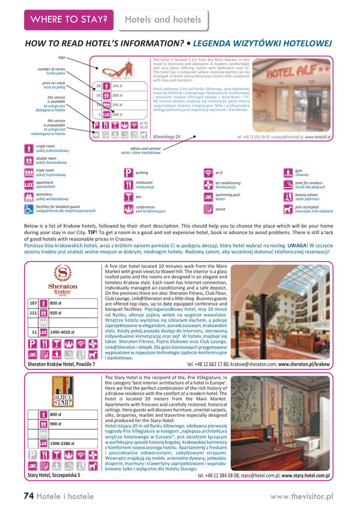 WHERE TO STAY? Hotels and hostels HOW TO READ HOTEL’S INFORMATION? • LEGENDA WIZYTÓWKI HOTELOWEJ logo The hotel is located 3 km from the Main Market on the route to Wieliczka and Zakopane. A modern, comfortable and cozy place offering rooms with bathroom and TV. The hotel has a restaurant where incentive parties can be arranged. Friendly and professional service with assistance with trips and transfers. number of rooms liczba pokoi price rer room cena za pokój 30 145 zł this service is available ta usługa jest dostępna w hotelu 50 200 zł 14 245 zł 1 300 zł this service is unavailable ta usługa jest niedostępna w hotelu single room pokój jednoosobowy double room pokój dwuosobowy triple room pokój trzyosobowy apartment apartament dormitory pokój wieloosobowy facilities for disabled guests udogodnienia dla niepełnosprawnych Hotel położony 3 km od Rynku Głównego, przy wylotowej trasie do Wieliczki i Zakopanego. Nowoczesne, komfortowe i przytulne miejsce oferujące pokoje z łazienkami i TV. Na terenie obiektu znajduje się restauracja, gdzie można zorganizować imprezy integracyjne. Miła i profesjonalna obsługa pomocna przy organizacji wycieczek i transferów. Klimeckiego 24 tel. +48 12 656 19 42; [email protected]; www.hotelalf.pl adress and contact adres i dane kontaktowe parking wi-fi bar swimming pool basen restaurant restauracja air conditioning klimatyzacja conferences sale konferencyjne sauna gym siłownia zone for smokers strefa dla palących beauty saloon salon piękności pets acctepted zwierzęta mile widziane Below is a list of Krakow hotels, followed by their short description. This should help you to choose the place which will be your home during your stay in our City. TIP! To get a room in a good and not expensive hotel, book in advance to avoid problems. There is still a lack of good hotels with reasonable prices in Cracow. Poniższa lista krakowskich hoteli, wraz z krótkim opisem pomoże Ci w podjęciu decyzji, który hotel wybrać na nocleg. UWAGA! W szczycie sezonu trudno jest znaleźć wolne miejsce w dobrym, niedrogim hotelu. Radzimy zatem, aby wcześniej dokonać telefonicznej rezerwacji! 107 111 11 850 zł 920 zł 1495-4010 zł Sheraton Kraków Hotel, Powiśle 7 800 zł 900 zł 1900-2280 zł Stary Hotel, Szczepańska 5 74 Hotele i hostele A five star hotel located 10 minutes walk from the Main Market with great views to Wawel hill. The interior is a glass roofed patio and the rooms are designed in an elegant and timeless Krakow style. Each room has Internet connection, individually managed air-conditioning and a safe deposit. On the premises there are also: Sheraton Fitness, Club Floor, Club Lounge, Link@Sheraton and a little shop. Business guests are offered top class, up to date equipped conference and banquet facilities. Pięciogwiazdkowy hotel, leży 10 minut od Rynku, oferuje piękny widok na wzgórze wawelskie. Wnętrze hotelu wyróżnia się szklanym dachem, a pokoje zaprojektowane w eleganckim, ponadczasowym, krakowskim stylu. Każdy pokój posiada dostęp do Internetu, sterowaną indywidualnie klimatyzację oraz sejf. W hotelu znajduje się także: Sheraton Fitness, Piętro Klubowe oraz Club Lounge, Link@Sheraton i sklepik. Dla gości biznesowych przygotowano wyposażone w najwyższe technologie zaplecze konferencyjne i bankietowe. tel. +48 12 662 17 80; [email protected]; www.sheraton.pl/krakow The Stary Hotel is the recipient of the, Prix Villégiature, in the category ‘best interior architecture of a hotel in Europe’. Here we find the perfect combination of the rich history of a Krakow residence with the comfort of a modern hotel. The hotel is located 20 meters from the Main Market. Apartments with frescoes and carefully restored, historical ceilings. Here guests will discover furniture, oriental carpets, silks, draperies, marble and travertine especially designed and produced for the Stary Hotel. Hotel stojący 20 m od Rynku Głównego, zdobywca pierwszej nagrody Prix Villégiature w kategorii „najlepsza architektura wnętrza hotelowego w Europie”, jest obiektem łączącym w perfekcyjny sposób historię bogatej, krakowskiej kamienicy z komfortem nowoczesnego hotelu. Apartamenty z freskami i pieczołowicie odtworzonymi, zabytkowymi stropami. Wewnątrz znajdują się meble, orientalne dywany, jedwabie, draperie, marmury i trawertyny zaprojektowane i wyprodukowane tylko i wyłącznie dla Hotelu Starego. tel. +48 12 384 08 08; [email protected]; www.stary.hotel.com.pl www.thevisitor.pl Hotels and hostels 13 170 153 € 153 € Fourstar hotel located just at the Vistula bank in direct neighboring with Kazimierz district. Modern facility of business character offers professional Business Centre with fully airconditioned conference rooms hosting at the same time for up to 650 guests. Banquets and event organizing is available. There are popular music clubs Piano Bar and Jazz Club on the premises as well. Czterogwiazdkowy hotel położony jest tuż nad brzegiem Wisły, w bezpośrednim sąsiedztwie dzielnicy Kazimierz. Nowoczesny obiekt o charakterze biznesowym ma w swojej ofercie Centrum Biznesu oraz w pełni klimatyzowane sale konferencyjne, mieszczące jednorazowo do 650 osób. Do dyspozycji gości sejf hotelowy, obsługa bankietów oraz imprez. W hotelu znajdują się popularne kluby muzyczne Piano Bar i Jazz Club. Qubus Hotel, Nadwiślańska 6 140 € / 600 zł 150 € / 645 zł 170 € / 730 zł 300 € / 1290 zł tel. +48 12 374 51 00; [email protected]; www.qubushotel.com The Metropolitan Boutique Hotel is a newly opened hotel in Krakow. It is located in a beautifully restored historic nineteenth - century building situated on the route between the Market Square and Kazimierz. The combination of tradition, elegance and modernity gives the hotel its unique boutique character. The hotel’s distinct advantage is its excellent location and professional service. Designed with attention to detail it is the ideal place for re