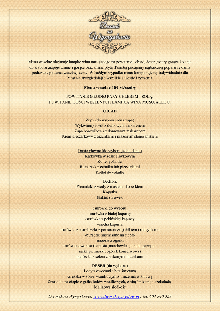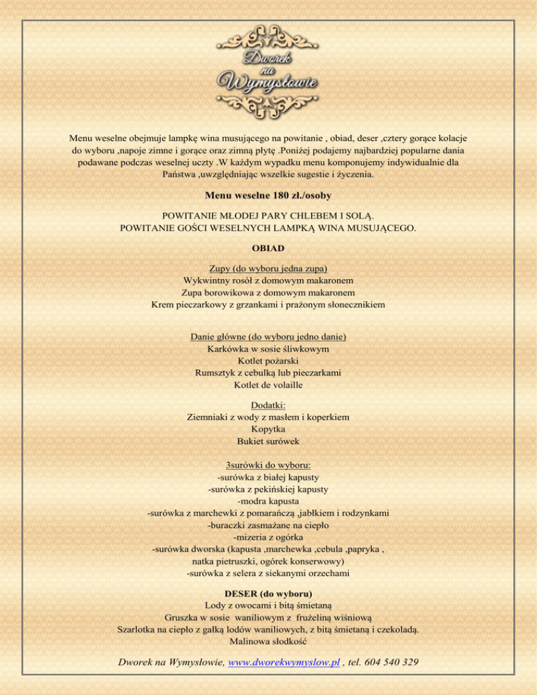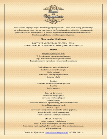 Menu weselne 180 zł./osoby Dworek na Wymysłowie, www