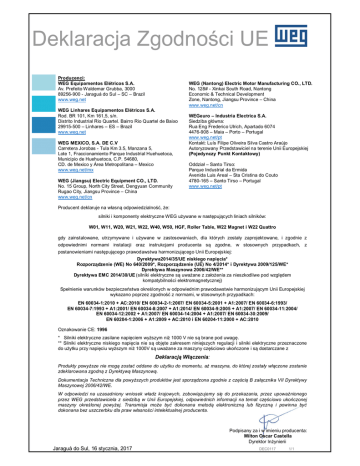 Deklaracja Zgodności UE Producenci: WEG Equipamentos Elétricos S.A. Av. Prefeito Waldemar Grubba, 3000 89256-900 - Jaraguá do Sul – SC – Brazil www.weg.net WEG (Nantong) Electric Motor Manufacturing CO., LTD. No. 128# - Xinkai South Road, Nantong Economic & Technical Development Zone, Nantong, Jiangsu Province – China www.weg.net/cn WEG Linhares Equipamentos Elétricos S.A. Rod. BR 101, Km 161,5, s/n. Distrito Industrial Rio Quartel. Bairro Rio Quartel de Baixo 29915-500 – Linhares – ES – Brazil www.weg.net WEG MEXICO, S.A. DE C.V Carretera Jorobas - Tula Km 3.5, Manzana 5, Lote 1, Fraccionamiento Parque Industrial Huehuetoca, Municipio de Huehuetoca, C.P. 54680, CD. de Mexico y Área Metropolitana – Mexico www.weg.net/mx WEG (Jiangsu) Electric Equipment CO., LTD. No. 15 Group, North City Street, Dengyuan Community Rugao City, Jiangsu Province – China www.weg.net/cn WEGeuro – Industria Electrica S.A. Siedziba główna: Rua Eng Frederico Ulrich, Apartado 6074 4476-908 – Maia – Porto – Portugal www.weg.net/pt Kontakt: Luís Filipe Oliveira Silva Castro Araújo Autoryzowany Przedstawiciel na terenie Unii Europejskiej (Pojedynczy Punkt Kontaktowy) Oddział – Santo Tirso: Parque Industrial da Ermida Avenida Luis Areal – Sta Cristina do Couto 4780-165 – Santo Tirso – Portugal www.weg.net/pt Producent deklaruje na własną odpowiedzialność, że: silniki i komponenty elektryczne WEG używane w następujących liniach silników: W01, W11, W20, W21, W22, W40, W50, HGF, Roller Table, W22 Magnet i W22 Quattro gdy zainstalowane, utrzymywane i używane w zastosowaniach, dla których zostały zaprojektowane, i zgodnie z odpowiednimi normami instalacji oraz instrukcjami producenta są zgodne, w stosownych przypadkach, z postanowieniami następującego prawodawstwa harmonizującego Unii Europejskiej: Dyrektywa2014/35/UE niskiego napięcia* Rozporządzenie (WE) No 640/2009*, Rozporządzenie (UE) No 4/2014* i Dyrektywa 2009/125/WE* Dyrektywa Maszynowa 2006/42/WE** Dyrektywa EMC 2014/30/UE (silniki elektryczne są uważane z założenia za nieszkodliwe pod względem kompatybilności elektromagnetycznej) Spełnienie warunków bezpieczeństwa określonych w odpowiednim prawodawstwie harmonizującym Unii Europejskiej wykazano poprzez zgodność z normami, w stosownych przypadkach: EN 60034-1:2010 + AC:2010/ EN 60034-2-1:2007/ EN 60034-5:2001 + A1:2007/ EN 60034-6:1993/ EN 60034-7:1993 + A1:2001/ EN 60034-8:2007 + A1:2014/ EN 60034-9:2005 + A1:2007/ EN 60034-11:2004/ EN 60034-12:2002 + A1:2007/ EN 60034-14:2004 + A1:2007/ EN 60034-30:2009/ EN 60204-1:2006 + A1:2009 + AC:2010 i EN 60204-11:2000 + AC:2010 Oznakowanie CE: 1996 * Silniki elektryczne zasilane napięciem wyższym niż 1000 V nie są brane pod uwagę. ** Silniki elektryczne niskiego napięcia nie są objęte zakresem niniejszych regulacji i silniki elektryczne przeznaczone do użytku przy napięciu wyższym niż 1000V są uważane za maszyny częściowo ukończone i są dostarczane z Deklaracją Włączenia: Produkty powyższe nie mogą zostać oddane do użytku do momentu, aż maszyna, do której zostały włączone zostanie zdeklarowana zgodną z Dyrektywą Maszynową. Dokumentacja Techniczna dla powyższych produktów jest sporządzona zgodnie z częścią B załącznika VII Dyrektywy Maszynowej 2006/42/WE. W odpowiedzi na uzasadniony wniosek władz krajowych, zobowiązujemy się do przekazania, przez upoważnionego przez WEG przedstawiciela z siedzibą w Unii Europejskiej, odpowiednich informacji na temat częściowo ukończonej maszyny określonej powyżej. Transmisja może być dokonana metodą elektroniczną lub fizyczną i powinna być dokonana bez uszczerbku dla praw własności intelektualnej producenta. Podpisany za i w imieniu producenta: Milton Oscar Castella Dyrektor Inżynierii Jaraguá do Sul, 16 stycznia, 2017 DEC0117 1/1