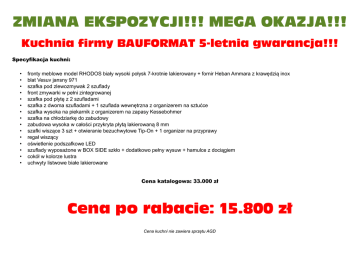 ZMIANA EKSPOZYCJI!!! MEGA OKAZJA!!! Kuchnia firmy BAUFORMAT 5-letnia gwarancja!!! Specyfikacja kuchni: • • • • • • • • • • • • • • • fronty meblowe model RHODOS biały wysoki połysk 7-krotnie lakierowany + fornir Heban Ammara z krawędzią inox blat Vesuv jansny 971 szafka pod zlewozmywak 2 szuflady front zmywarki w pełni zintegrowanej szafka pod płytę z 2 szufladami szafka z dwoma szufladami + 1 szuflada wewnętrzna z organizerem na sztućce szafka wysoka na piekarnik z organizerem na zapasy Kessebohmer szafka na chłodziarkę do zabudowy zabudowa wysoka w całości przykryta płytą lakierowaną 8 mm szafki wiszące 3 szt + otwieranie bezuchwytowe Tip-On + 1 organizer na przyprawy regał wiszący oświetlenie podszafkowe LED szuflady wyposażone w BOX SIDE szkło + dodatkowo pełny wysuw + hamulce z dociągiem cokół w kolorze lustra uchwyty listwowe białe lakierowane Cena katalogowa: 33.000 zł Cena po rabacie: 15.800 zł Cena kuchni nie zawiera sprzętu AGD