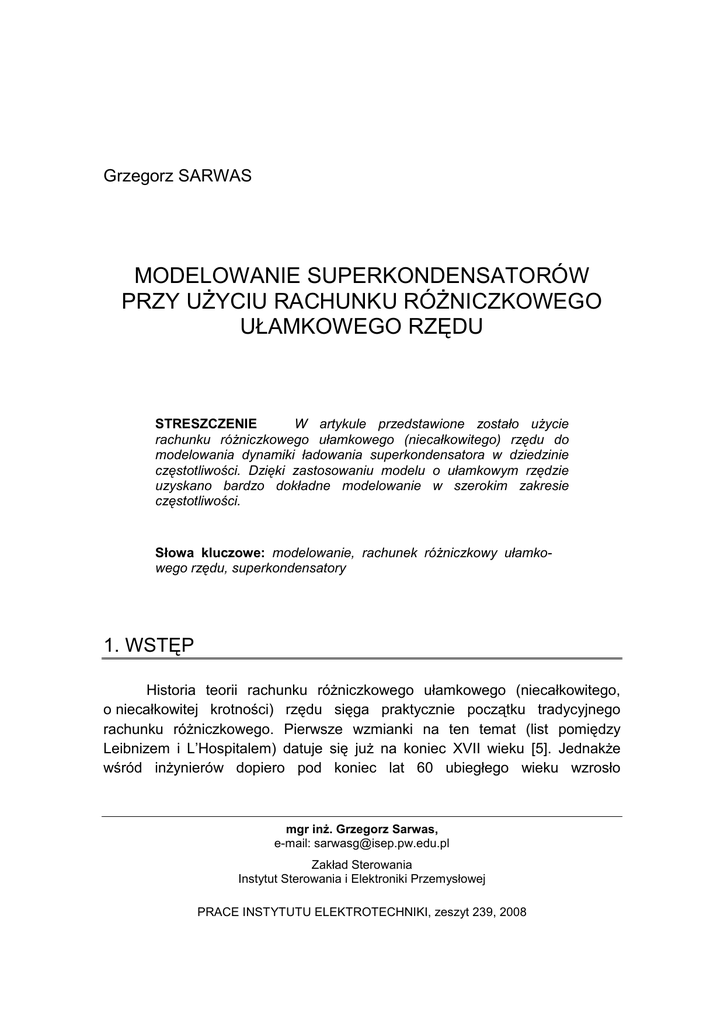 Grzegorz SARWAS MODELOWANIE SUPERKONDENSATORÓW PRZY UśYCIU RACHUNKU RÓśNICZKOWEGO UŁAMKOWEGO RZĘDU STRESZCZENIE W artykule przedstawione zostało uŜycie rachunku róŜniczkowego ułamkowego (niecałkowitego) rzędu do modelowania dynamiki ładowania superkondensatora w dziedzinie częstotliwości. Dzięki zastosowaniu modelu o ułamkowym rzędzie uzyskano bardzo dokładne modelowanie w szerokim zakresie częstotliwości. Słowa kluczowe: modelowanie, rachunek róŜniczkowy ułamkowego rzędu, superkondensatory 1. WSTĘP Historia teorii rachunku róŜniczkowego ułamkowego (niecałkowitego, o niecałkowitej krotności) rzędu sięga praktycznie początku tradycyjnego rachunku róŜniczkowego. Pierwsze wzmianki na ten temat (list pomiędzy Leibnizem i L’Hospitalem) datuje się juŜ na koniec XVII wieku [5]. JednakŜe wśród inŜynierów dopiero pod koniec lat 60 ubiegłego wieku wzrosło mgr inŜ. Grzegorz Sarwas, e-mail: [email protected] Zakład Sterowania Instytut Sterowania i Elektroniki Przemysłowej PRACE INSTYTUTU ELEKTROTECHNIKI, zeszyt 239, 2008 18 G. Sarwas zainteresowanie tą tematyką. Jak się szybko okazało, istnieje w technice wiele problemów które łatwiej jest opisać właśnie przy pomocy rachunku róŜniczkowego ułamkowego rzędu. Pozwala on na przykład na dokładniejszy opis ośrodków stratnych i dyspersyjnych (elektrodynamika, mechanika ośrodków lepko-spręŜystych, procesy elektrochemiczne, układy, w których występuje tarcie). W procesach takich jak dyfuzja, transport ciepła, linia długa (opisanych równaniami róŜniczkowymi cząstkowymi), w których rozwiązaniu występuje s , moŜe być on interpretowany jako pochodna rzędu 12 . Innym przykładem zastosowania rachunku róŜniczkowego ułamkowego rzędu, które zostało szerzej przedstawione w tym artykule, jest modelowanie superkondensatorów. Artykuł zorganizowany jest następująco: rozdział 2.1 zawiera krótkie wprowadzenie do tematyki superkondensatorów, ich budowy i zasady działania. W rozdziale 2.2 znajduje się wprowadzenie do rachunku róŜniczkowego ułamkowego rzędu, podstawowe definicje, charakterystyki częstotliwościowe. Rozdział 2.3 przedstawia definicję oraz charakterystykę Bode’go członu całkującego ułamkowego rzędu. Rozdział 3 zawiera natomiast wyniki przeprowadzonych eksperymentów modelowania superkondensatorów. 2. WPROWADZENIE 2.1. Wprowadzenie do superkondensatorów Superkondensatory (nazywane teŜ ultrakondesatorami lub kondensatorami dwuwarstwowymi (ang. double-layer)) powstały pod koniec lat siedemdziesiątych. Posiadają one znacznie większe pojemności niŜ zwykłe kondensatory (od 1 mF do 1 kF). Charakteryzują się gęstością energii rzędu 2…9 Wh/kg oraz gęstością mocy rzędu 3…8 kW/kg. Własność ta umiejscawia ultrakondensatory pomiędzy tradycyjnymi aluminiowymi kondensatorami elektrolitycznymi, a akumulatorami. Takie parametry superkondensatory zawdzięczają swojej budowie. Ultrakondensator składa się bowiem z dwóch okładzin zbudowanych z węgla aktywowanego nasączonego elektrolitem i separatora. Zasada jego działania opiera się na zjawisku Helmholz’a, który zaobserwował, Ŝe istnieje pewne napięcie graniczne potrzebne do rozpoczęcia elektrolizy. Doprowadzenie do okładek kondensatora napięcia niŜszego niŜ graniczne powoduje, Ŝe elektroliza nie następuje, a elektrolit zachowuje się jak izolator. Ze względu na zbyt małe napięcie jony nie mogą przedostać się do swojej elektrody ale pod wpływem sił Modelowanie superkondensatorów przy uŜyciu rachunku róŜniczkowego … 19 elektrostatycznych gromadzą się w jej pobliŜu. Na granicy elektrod i elektrolitu tworzą się dwie warstwy, gdzie gromadzą się nośniki prądu. Dzięki bardzo małej grubości powłoki izolacyjnej i zastosowaniu węgla aktywowanego, który posiada ogromną powierzchnię czynną ( 500 – 2000 m2/g), do budowy elektrod, otrzymuje się bardzo duŜe pojemności. [4,10] Rys. 1. Schemat budowy superkondensatora Na rysunku 1 przedstawiony został schemat budowy superkondensatora. Dwie elektrody, zazwyczaj wykonane z węgla aktywowanego, nasączone są elektrolitem (np. roztworem kwasu siarkowego H 2 SO4 ) i przedzielone separatorem. Jest to cieniutka porowata folia z tworzywa sztucznego, która nie pełni roli klasycznego dielektryka. Separator uniemoŜliwia bezpośrednie zwarcie węglowych elektrod, jednak pozwala na przemieszczanie się jonów w elektrolicie, którym są nasączone obie elektrody. Rys. 2. Schemat ładowania superkondensatora 20 G. Sarwas Rysunek 2 przedstawia schemat procesu ładowania superkondensatora [10]. Napięcie przyłoŜone do elektrod superkondensatora wywołało ruch jonów w elektrolicie. Jony ujemne przemieściły się w stronę elektrody dodatniej, a jony dodatnie w kierunku elektrody ujemnej. Na granicy elektrolitu i elektrod wytworzyły się dwie warstwy, gdzie gromadzą się nośniki prądu (elektrony i jony). Stąd właśnie ultrakondensatory nazywane są kondensatorami dwuwarstwowymi (ang. double-layer). Cechą charakterystyczną w sposobie pracy superkondensatorów jest wykorzystanie przewodności jonowej elektrolitu (energia magazynowana jest w przesunięciu jonów). Tradycyjne kondensatory opierają bowiem swoje działanie na polaryzacji dipoli dielektryka, a akumulatory energie otrzymują z reakcji chemicznych. Wykorzystanie ruchu jonów w elektrolicie pociąga za sobą określone własności elektryczne. Superkondensatory charakteryzują się duŜą rezystancją wewnętrzną (od ok. 100 Ω dla kondensatorów podtrzymujących, projektowanych na małe prądy, do rezystancji rzędu ułamków Ω dla kondensatorów projektowanych na większe prądy rzędu amperów). Rezystancję tę modeluje się jako rezystor połączony szeregowo z superkondensatorem. W chwili początkowej, podczas ładowania, odkłada się na niej napięcie, które jest proporcjonalne do jej wartości i prądu ładowania. W przypa