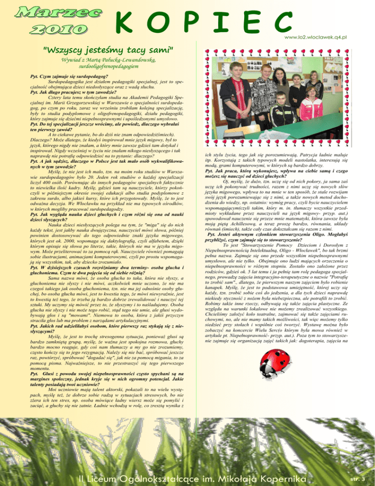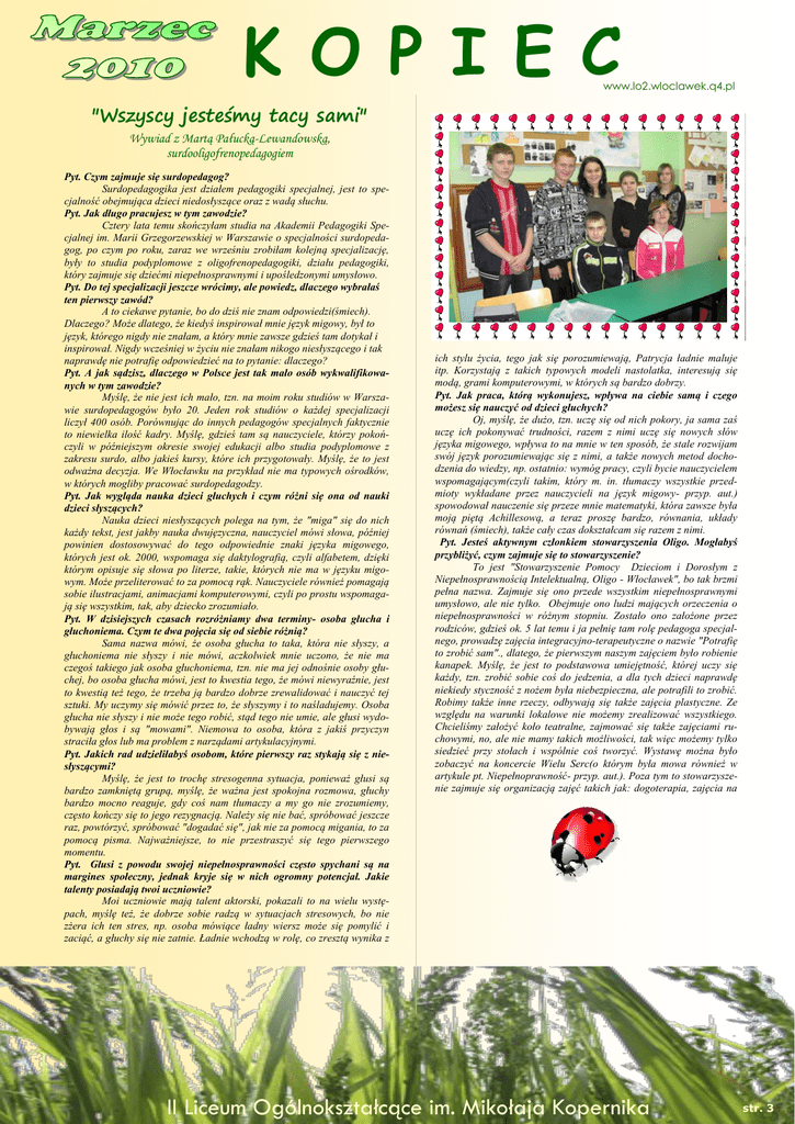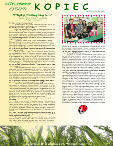 K O P I E C www.lo2.wloclawek.q4.pl "Wszyscy jesteśmy tacy sami" Wywiad z Martą Pałucką-Lewandowską, surdooligofrenopedagogiem Pyt. Czym zajmuje się surdopedagog? Surdopedagogika jest działem pedagogiki specjalnej, jest to specjalność obejmująca dzieci niedosłyszące oraz z wadą słuchu. Pyt. Jak długo pracujesz w tym zawodzie? Cztery lata temu skończyłam studia na Akademii Pedagogiki Specjalnej im. Marii Grzegorzewskiej w Warszawie o specjalności surdopedagog, po czym po roku, zaraz we wrześniu zrobiłam kolejną specjalizację, były to studia podyplomowe z oligofrenopedagogiki, działu pedagogiki, który zajmuje się dziećmi niepełnosprawnymi i upośledzonymi umysłowo. Pyt. Do tej specjalizacji jeszcze wrócimy, ale powiedz, dlaczego wybrałaś ten pierwszy zawód? A to ciekawe pytanie, bo do dziś nie znam odpowiedzi(śmiech). Dlaczego? Może dlatego, że kiedyś inspirował mnie język migowy, był to język, którego nigdy nie znałam, a który mnie zawsze gdzieś tam dotykał i inspirował. Nigdy wcześniej w życiu nie znałam nikogo niesłyszącego i tak naprawdę nie potrafię odpowiedzieć na to pytanie: dlaczego? Pyt. A jak sądzisz, dlaczego w Polsce jest tak mało osób wykwalifikowanych w tym zawodzie? Myślę, że nie jest ich mało, tzn. na moim roku studiów w Warszawie surdopedagogów było 20. Jeden rok studiów o każdej specjalizacji liczył 400 osób. Porównując do innych pedagogów specjalnych faktycznie to niewielka ilość kadry. Myślę, gdzieś tam są nauczyciele, którzy pokończyli w późniejszym okresie swojej edukacji albo studia podyplomowe z zakresu surdo, albo jakieś kursy, które ich przygotowały. Myślę, że to jest odważna decyzja. We Włocławku na przykład nie ma typowych ośrodków, w których mogliby pracować surdopedagodzy. Pyt. Jak wygląda nauka dzieci głuchych i czym różni się ona od nauki dzieci słyszących? Nauka dzieci niesłyszących polega na tym, że "miga" się do nich każdy tekst, jest jakby nauka dwujęzyczna, nauczyciel mówi słowa, później powinien dostosowywać do tego odpowiednie znaki języka migowego, których jest ok. 2000, wspomaga się daktylografią, czyli alfabetem, dzięki którym opisuje się słowa po literze, takie, których nie ma w języku migowym. Może przeliterować to za pomocą rąk. Nauczyciele również pomagają sobie ilustracjami, animacjami komputerowymi, czyli po prostu wspomagają się wszystkim, tak, aby dziecko zrozumiało. Pyt. W dzisiejszych czasach rozróżniamy dwa terminy- osoba głucha i głuchoniema. Czym te dwa pojęcia się od siebie różnią? Sama nazwa mówi, że osoba głucha to taka, która nie słyszy, a głuchoniema nie słyszy i nie mówi, aczkolwiek mnie uczono, że nie ma czegoś takiego jak osoba głuchoniema, tzn. nie ma jej odnośnie osoby głuchej, bo osoba głucha mówi, jest to kwestia tego, że mówi niewyraźnie, jest to kwestią też tego, że trzeba ją bardzo dobrze zrewalidować i nauczyć tej sztuki. My uczymy się mówić przez to, że słyszymy i to naśladujemy. Osoba głucha nie słyszy i nie może tego robić, stąd tego nie umie, ale głusi wydobywają głos i są "mowami". Niemowa to osoba, która z jakiś przyczyn straciła głos lub ma problem z narządami artykulacyjnymi. Pyt. Jakich rad udzieliłabyś osobom, które pierwszy raz stykają się z niesłyszącymi? Myślę, że jest to trochę stresogenna sytuacja, ponieważ głusi są bardzo zamkniętą grupą, myślę, że ważna jest spokojna rozmowa, głuchy bardzo mocno reaguje, gdy coś nam tłumaczy a my go nie zrozumiemy, często kończy się to jego rezygnacją. Należy się nie bać, spróbować jeszcze raz, powtórzyć, spróbować "dogadać się", jak nie za pomocą migania, to za pomocą pisma. Najważniejsze, to nie przestraszyć się tego pierwszego momentu. Pyt. Głusi z powodu swojej niepełnosprawności często spychani są na margines społeczny, jednak kryje się w nich ogromny potencjał. Jakie talenty posiadają twoi uczniowie? Moi uczniowie mają talent aktorski, pokazali to na wielu występach, myślę też, że dobrze sobie radzą w sytuacjach stresowych, bo nie zżera ich ten stres, np. osoba mówiące ładny wiersz może się pomylić i zaciąć, a głuchy się nie zatnie. Ładnie wchodzą w rolę, co zresztą wynika z ich stylu życia, tego jak się porozumiewają, Patrycja ładnie maluje itp. Korzystają z takich typowych modeli nastolatka, interesują się modą, grami komputerowymi, w których są bardzo dobrzy. Pyt. Jak praca, którą wykonujesz, wpływa na ciebie samą i czego możesz się nauczyć od dzieci głuchych? Oj, myślę, że dużo, tzn. uczę się od nich pokory, ja sama zaś uczę ich pokonywać trudności, razem z nimi uczę się nowych słów języka migowego, wpływa to na mnie w ten sposób, że stale rozwijam swój język porozumiewając się z nimi, a także nowych metod dochodzenia do wiedzy, np. ostatnio: wymóg pracy, czyli bycie nauczycielem wspomagającym(czyli takim, który m. in. tłumaczy wszystkie przedmioty wykładane przez nauczycieli na język migowy- przyp. aut.) spowodował nauczenie się przeze mnie matematyki, która zawsze była moją piętą Achillesową, a teraz proszę bardzo, równania, układy równań (śmiech), także cały czas dokształcam się razem z nimi. Pyt. Jesteś aktywnym członkiem stowarzyszenia Oligo. Mogłabyś przybliżyć, czym zajmuje się to stowarzyszenie? To jest "Stowarzyszenie Pomocy Dzieciom i Dorosłym z Niepełnosprawnością Intelektualną, Oligo - Włocławek", bo tak brzmi pełna nazwa. Zajmuje się ono przede wszystkim niepełnosprawnymi umysłowo, ale nie tylko. Obejmuje ono ludzi mających orzeczenia o niepełnosprawności w różnym stopniu. Zostało ono założone przez rodziców, gdzieś ok. 5 lat temu i ja pełnię tam rolę pedagoga specjalnego, prowadzę zajęcia integracyjno-terapeutyczne o nazwie "Potrafię to zrobić sam"., dlatego, że pierwszym naszym zajęciem 